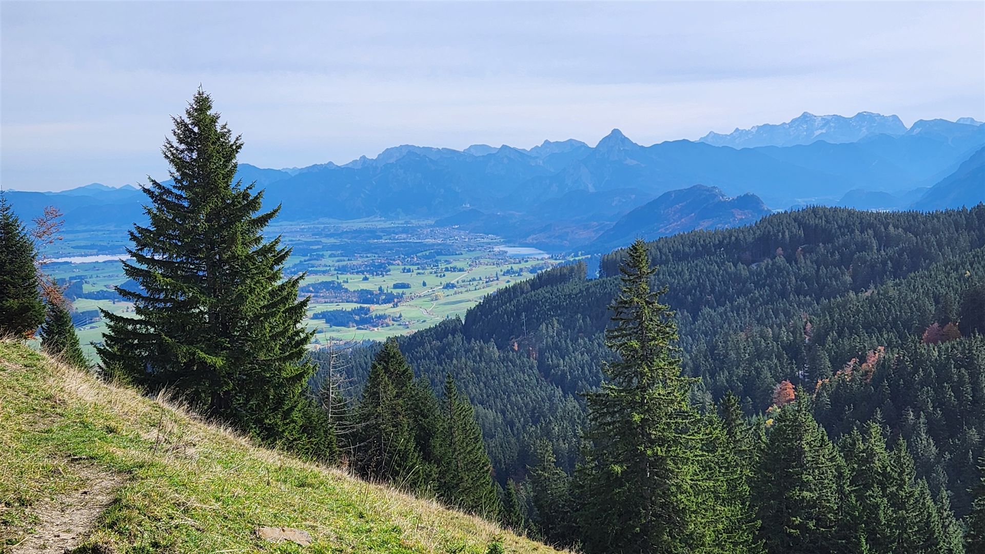 Beim Sportheim Böck und später vom Alpspitz-Gipfel reicht der Blick vom Estergebirge über die Ammergauer Alpen bis zur großen Alpspitze und der Zugspitze. Weiter rechts folgen dann die Tannheimer Berge und im Westen liegt der Säntis, bereits in der Schweiz. Auszumachende Gipfel sind insbesondere Daniel, Aggenstein, Einstein, Kellenspitze, Gimpel, Heimgarten, Kreuzspitze, Tegelberg, Säuling, Kohlbergspitze, Hochplatte, Große Klammspitze, Geierköpfe, Wertacher Hörnle, Grünten, Sorgschrofen (Jungholz), Widderstein und Hoher Ifen. Auch der Hopfensee und der Weißensee mit der Burgruine Falkenstein sind zu sehen.