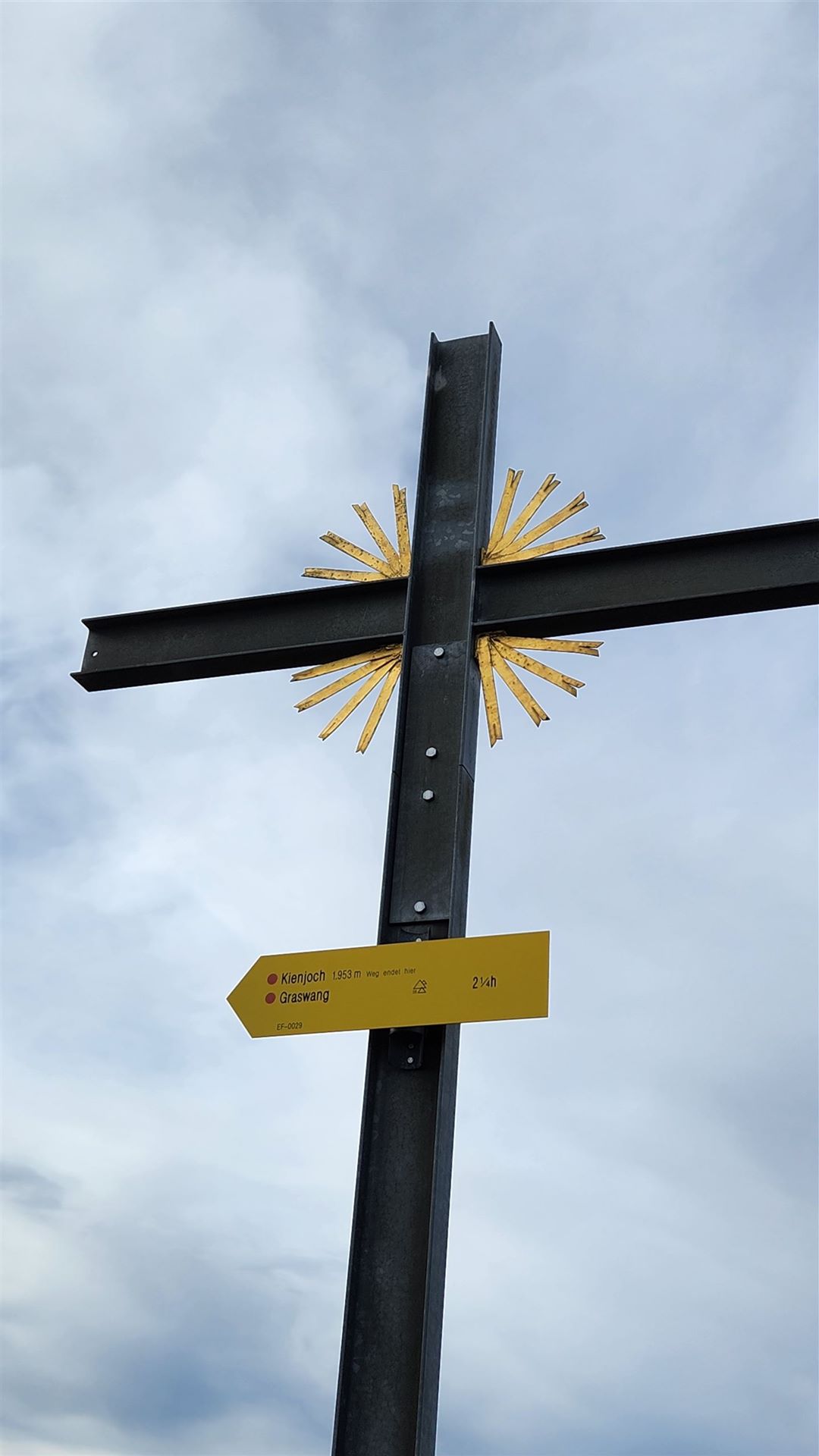 Exkurs: So hätte ich es auch machen sollen, also vom Kienjoch zurück zur Abzweigung und den Normalweg nach Graswang. Stattdessen habe ich die Überschreitung des Kienjochs und den Steig hinunter nach Graswang gewählt. Das war dann sehr anstrengend. Nicht umsonst steht auf dem Wegweiser am Gipfelkreuz des Kienjochs, dass der Weg hier endet. Das habe ich aber erst später erfahren und auf den Fotos gesehen. Der Weg endete zwar nicht wirklich und wurde in meiner App auch angezeigt, nur weil der Weg halt recht schwierig ist, ist er nicht beschildert. Der Grat über Kieneckspitz, Mittageck und der Steig hinunter nach Graswang hatte es aber in sich. Ich möchte es mal so ausdrücken: Begehbar, aber nicht für den normalen Wanderer gepflegt. Es war etwas kraxeln angesagt und durch die Kiefern wurde es auch mal eng. An einigen leicht ausgesetzten Stellen war Trittsicherheit gefordert. Besonders aber der Abstieg nach Graswang ging extrem in die Knochen. Ich habe sogar Grödel angelegt, um nicht zu rutschen. Insgesamt benötigte ich vom Kienjoch bis zur Bushaltestelle in Graswang dreieinhalb Stunden.
