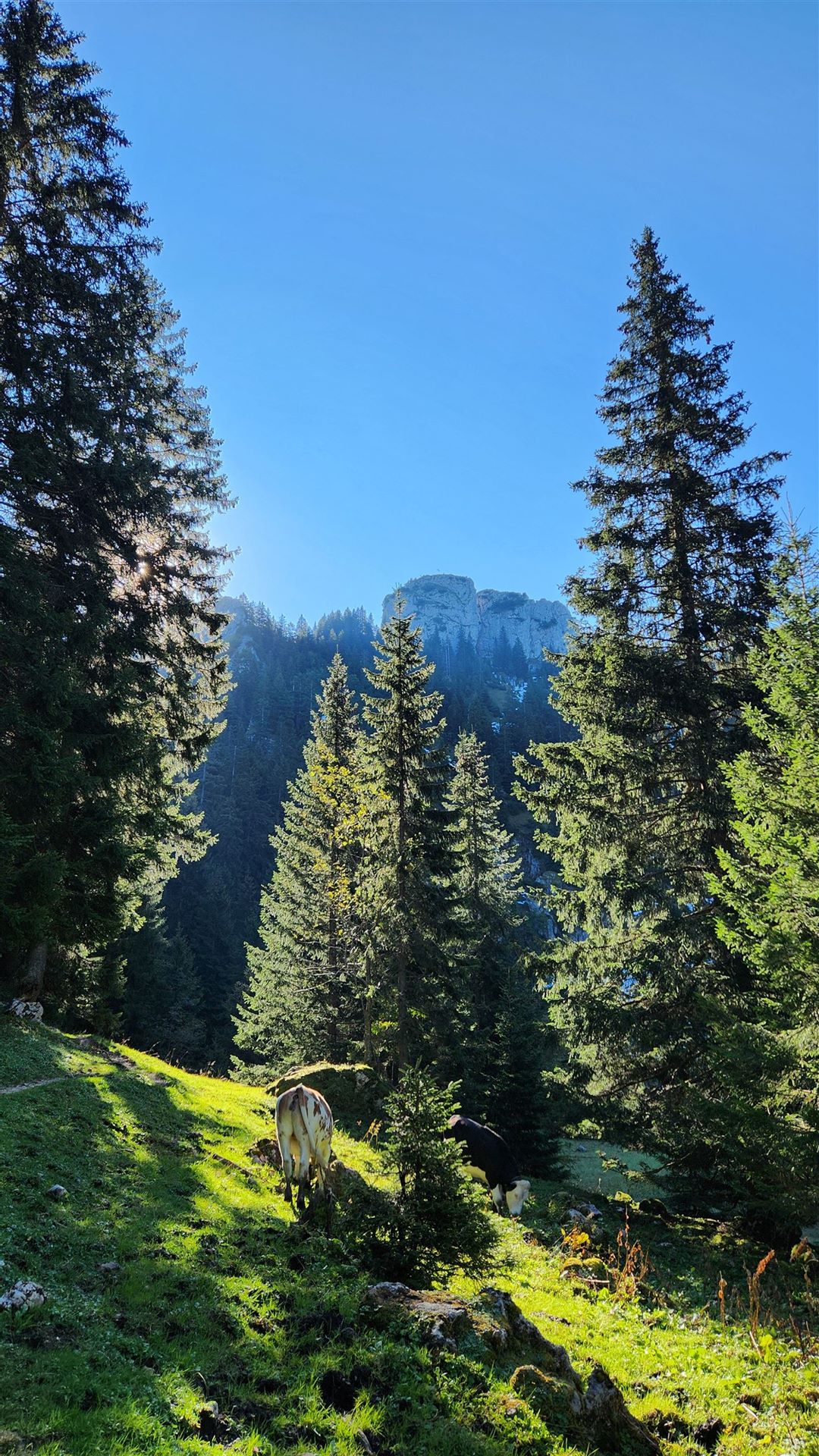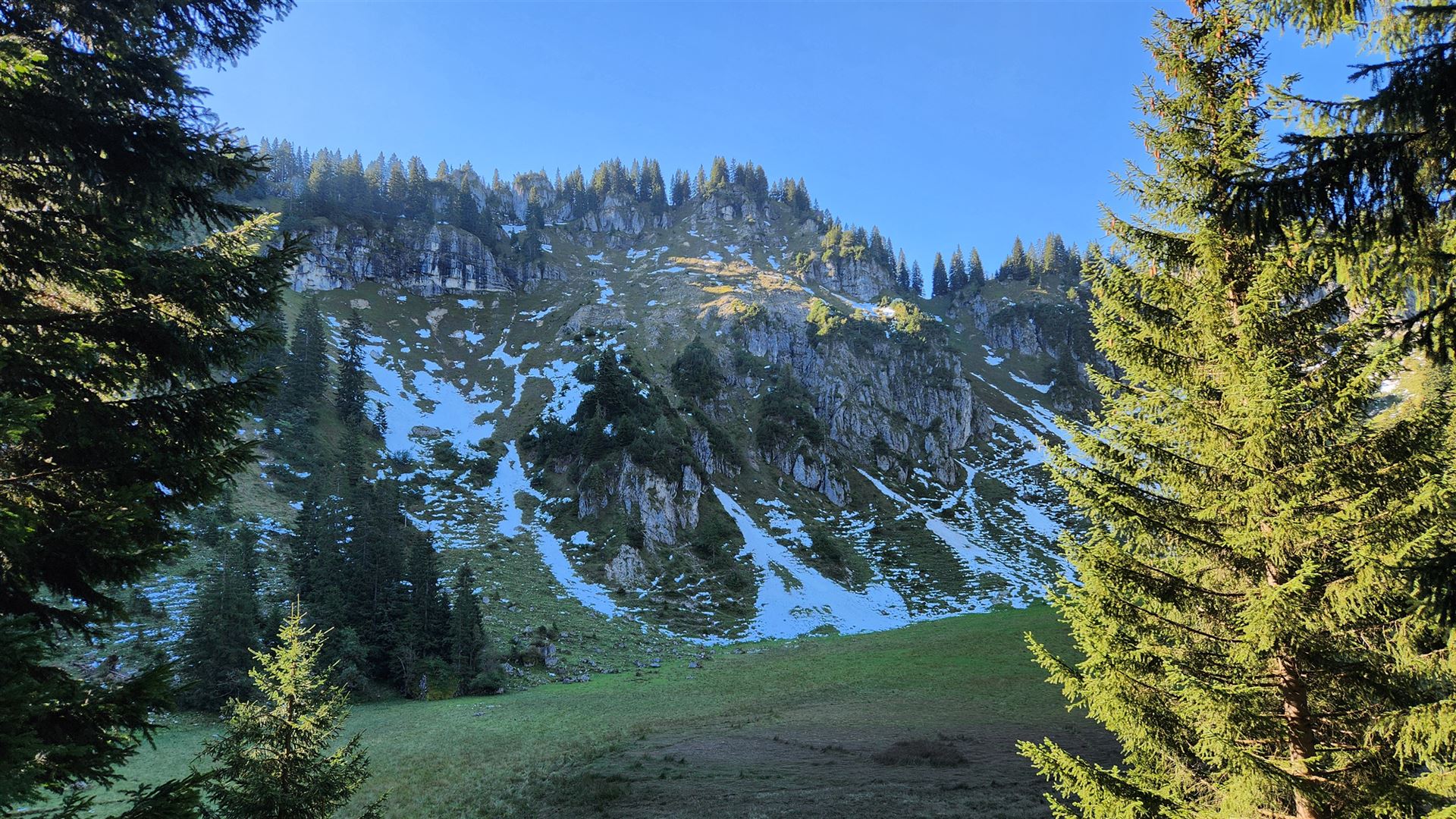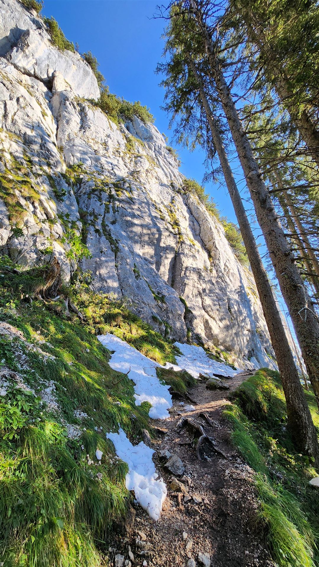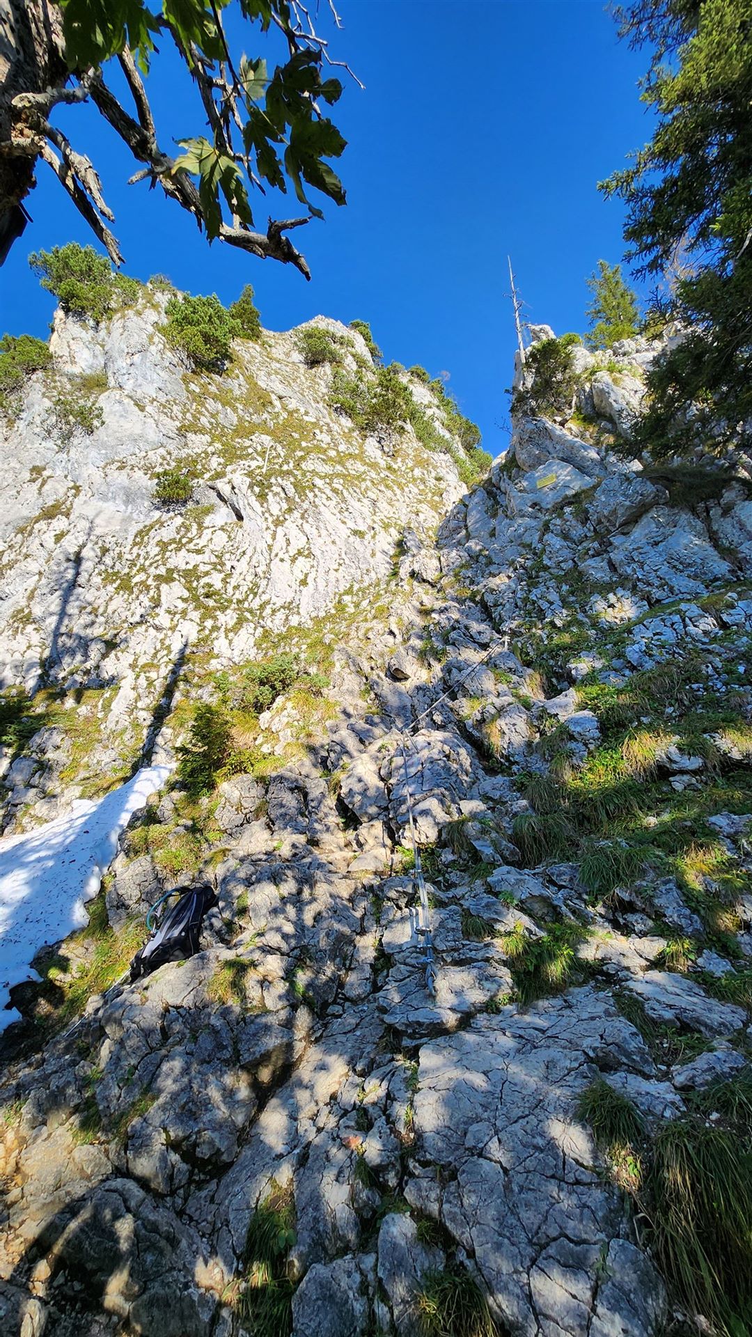 Der anfangs geteerte Weg führt zwischen Kloster und Schaukäserei in den Bergwald. Hinter dem Kloster fällt der Blick auf die Scheinbergspitze und die Hochplatte, auch die Große Klammspitz ist zu sehen. Bald beginnt der Schotter, bevor der Weg schmaler wird und dann in den Steig übergeht, der bis zum Einstieg in den Klettersteig führt. Der Bergwald ist wild. Der Steig hatte unter den Regenfällen der letzten Zeit stark gelitten. Bisweilen liegen Bäume quer. An einer unübersichtlichen Weggabelung bin ich versehentlich rechts abgebogen und musste mich dann durch den Bergwald zurück auf den Weg kämpfen. Nach links sah es so aus, als würde ein Baum den Weg versperren und rechts herum wäre die Umleitung. Das war jedoch ein Irrtum, wie ich auf dem Rückweg feststellte. Mein Umweg ist im gpx-Track deutlich zu erkennen. Dort beim Aufstieg also bitte links halten!