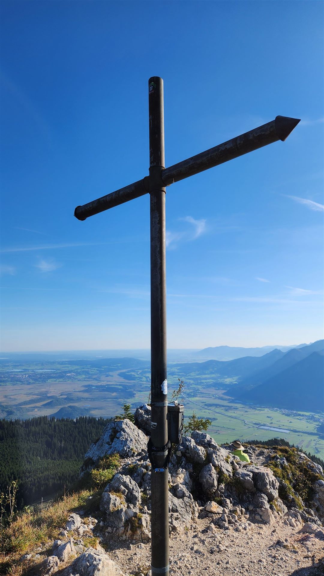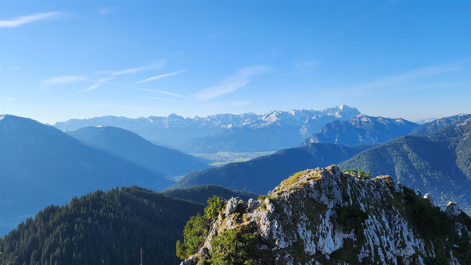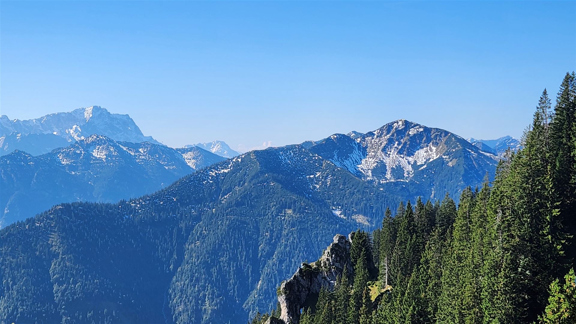 Vom Gipfel des Ettaler Manndl auf 1633 m reicht der Rundblick über das Alpenvorland, das Estergebirge, das Karwendel, das Wettersteingebirge und die Ammergauer Alpen, im Osten seien vor allem der Heimgarten, der Schafreuter, der Guffert und ganz nah der Osterfeuerkopf erwähnt. Wie so oft zeigte mir die Gipfel-App auch die 90 Kilometer entfernte Elmauer Halt (2344 m) im Kaisergebirge an. Da muss ich dann irgendwann mal hin.