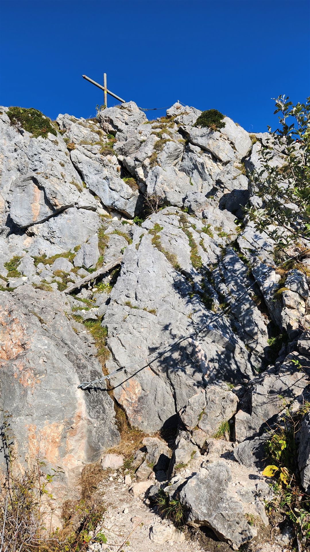 Nach 1 ½ Stunden erreichte ich den Klettersteig. Den Rucksack ließ ich am Einstieg stehen. Der Klettersteig ist anspruchsvoller als ich es in Erinnerung hatte. Klettersteigset hatte ich, im Unterschied zu 2006 (wie ich im Nachhinein anhand der alten Fotos feststellte) allerdings nicht dabei. Ich empfehle jedoch jedem, den kurzen Klettersteig nur mit Klettersteigset zu machen. Ohne Klettersteigset erforderte der Steig die volle Konzentration, zumal die Felsen recht speckig sind. Da darf man die Drahtversicherung nicht loslassen, sonst wars das. Einen Schwächeanfall oder Ähnliches darf man sich nicht erlauben. Am Ettaler Manndl gab es schon tödliche Unfälle. Aber der Klettersteig ist auch kein Muss. Nicht-Bergsteiger gehen einfach weiter. Später, von der Laber-Berggaststätte, hat man einen ebenso guten Ausblick.