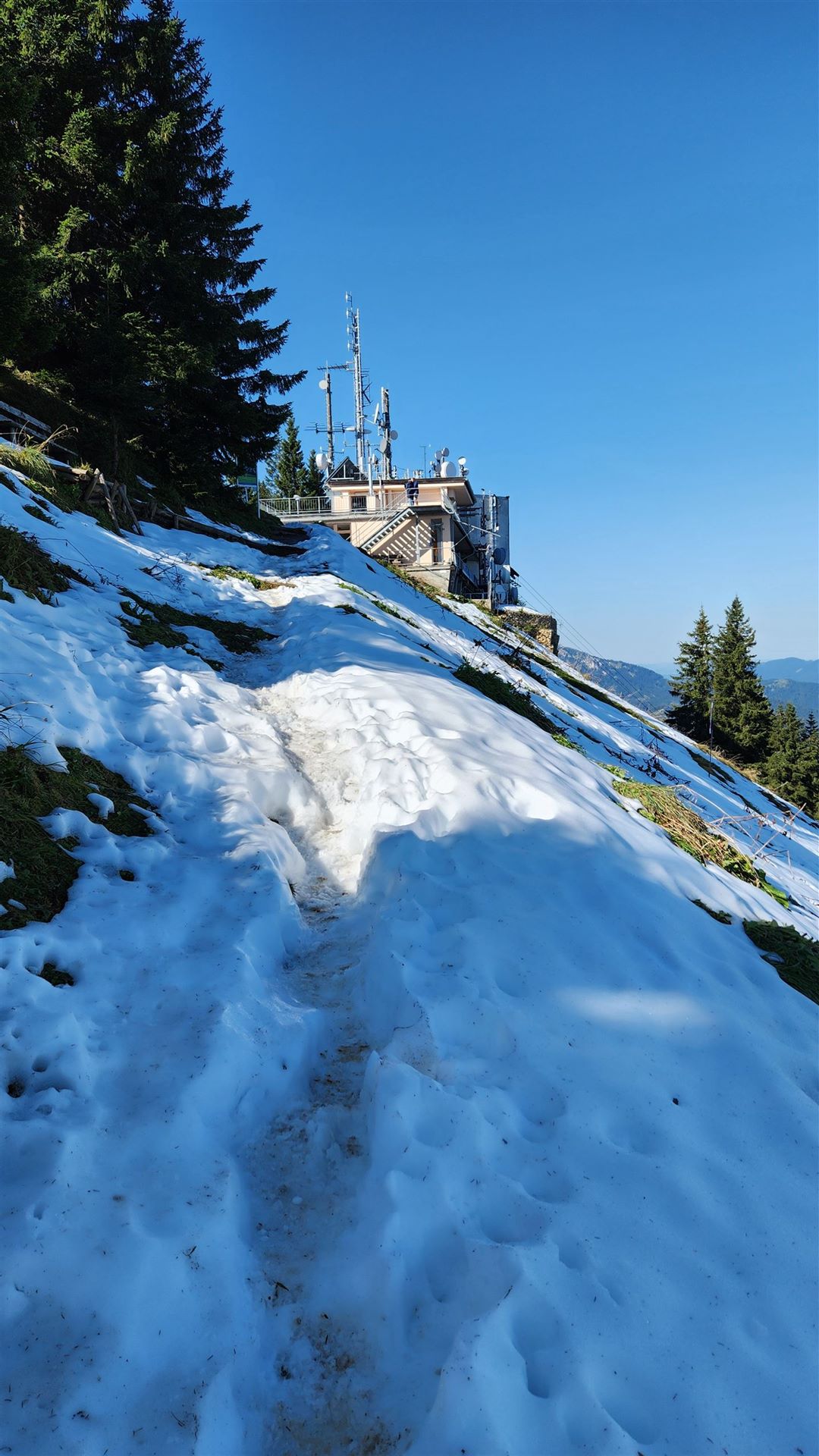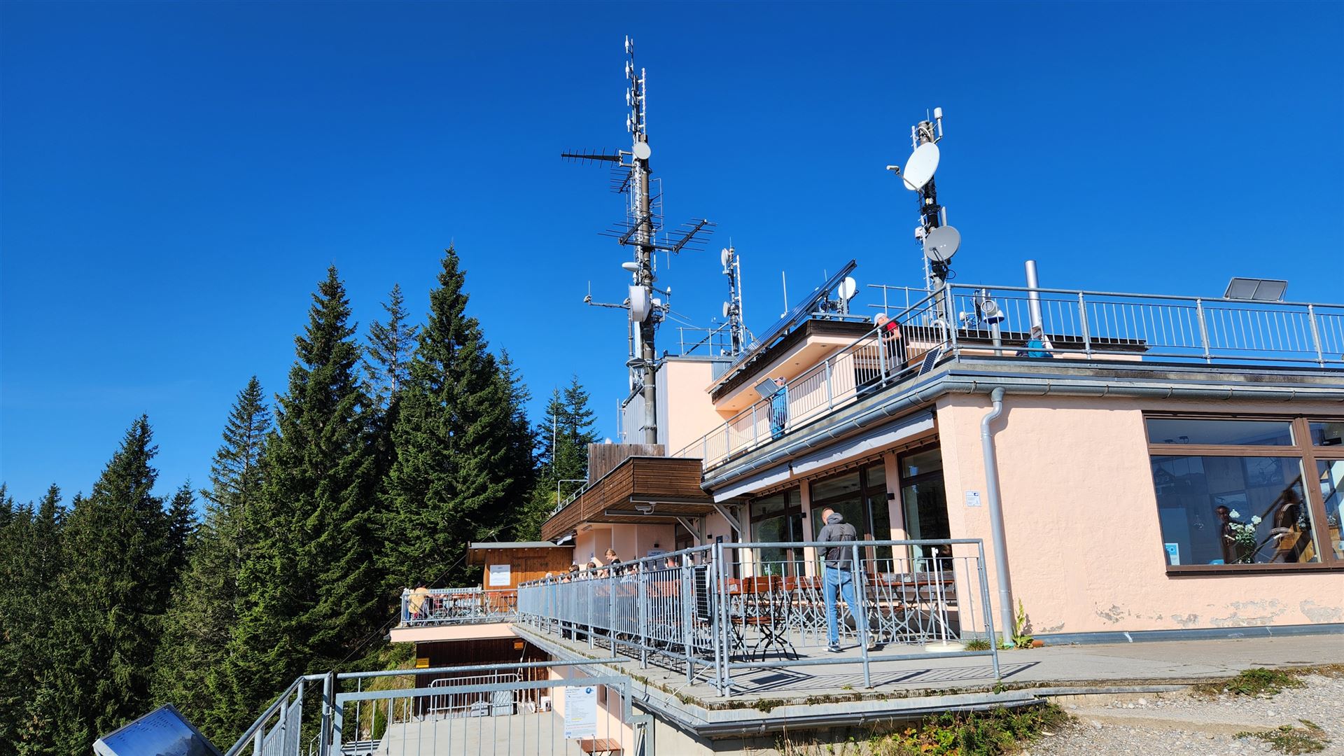 Ich entschied mich noch für den Abstecher zur Laber-Berggaststätte, wo sich auch der Bergstation der Oberammergauer Laber-Bergbahn befindet. Wie schon vom Ettaler Manndl ragte die Zugspitze im Süden prominent heraus. Im Ammergebirge konnte ich den Daniel, die Notkarspitze, den Vorderen Feldernkopf und das Kienjoch, die Kreuzspitze, den Kramer, Zahn und Kofel ausmachen, dahinter die Kellenspitze (Tannheimer Tal). Im Südosten erinnerte mich die Große Arnspitze an eine fantastische Tour. Bis zum Laber-Gipfel bin ich nicht mehr gegangen, hinter der Berggaststätte begann ein Schneefeld.