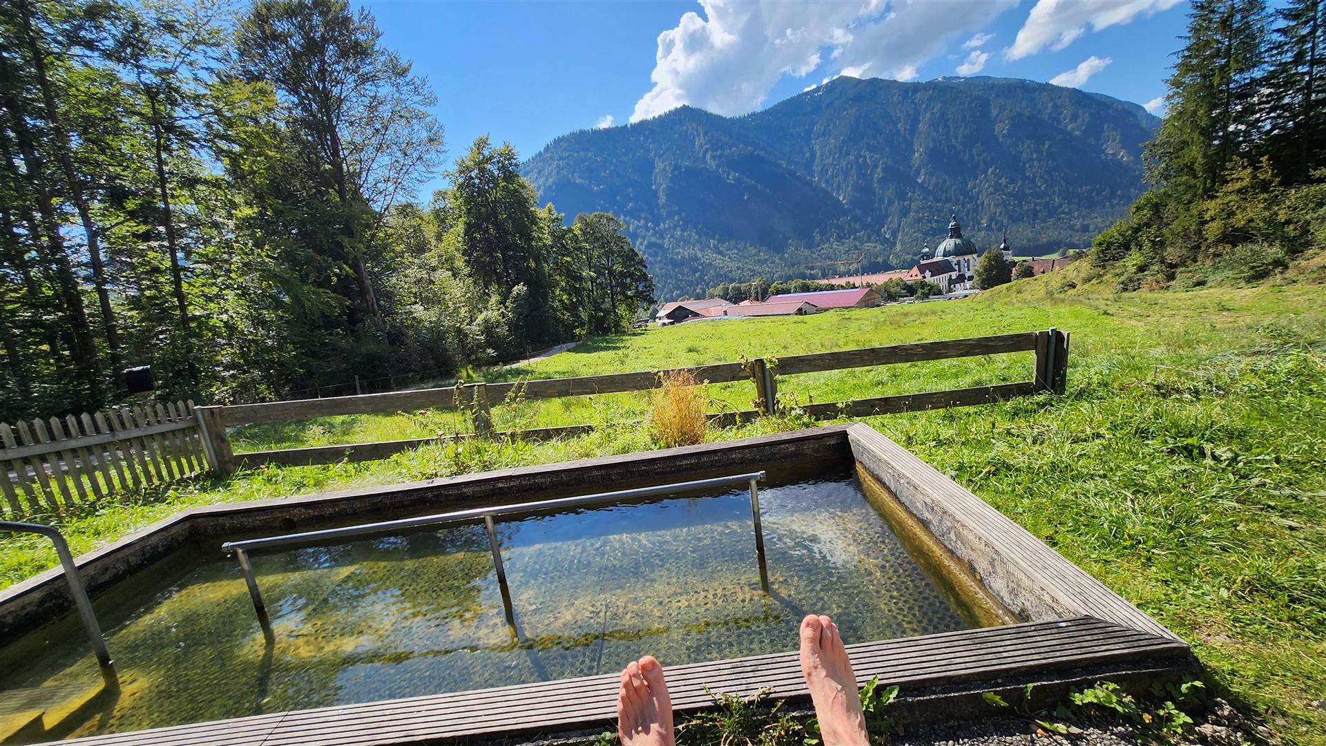 Kurz bevor ich wieder den Parkplatz erreichte, gönnte ich mir eine Abkühlung am Wasser-Tretbecken. Das ist jedoch so kalt, dass ich es nicht lange aushielt.