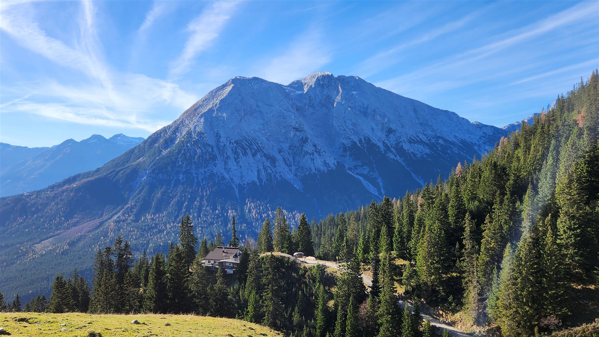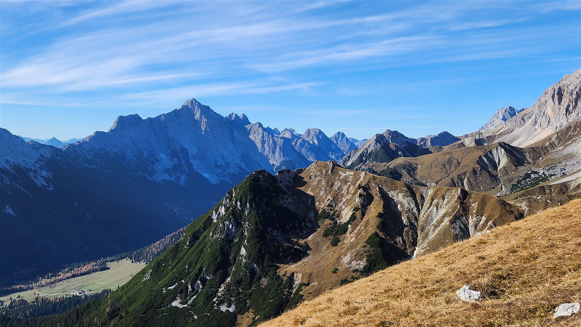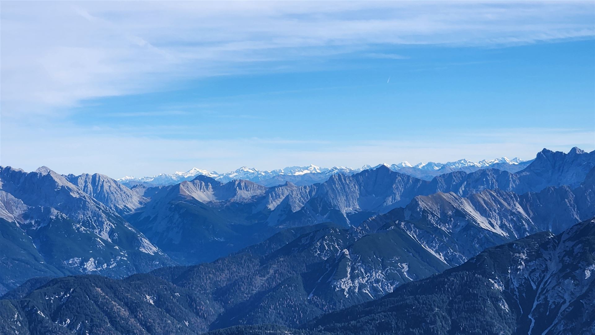 Im Osten liegt fast unscheinbar die Große Arnspitze vor dem Karwendelgebirge, das von der Gehrenspitze in seiner ganzen Pracht zu überschauen ist, von der Soiernspitze (2257 m) über die Erlspitze bis zur Seefelder Spitze und Reitherspitze (2374 m, das war auch eine schöne Tour).