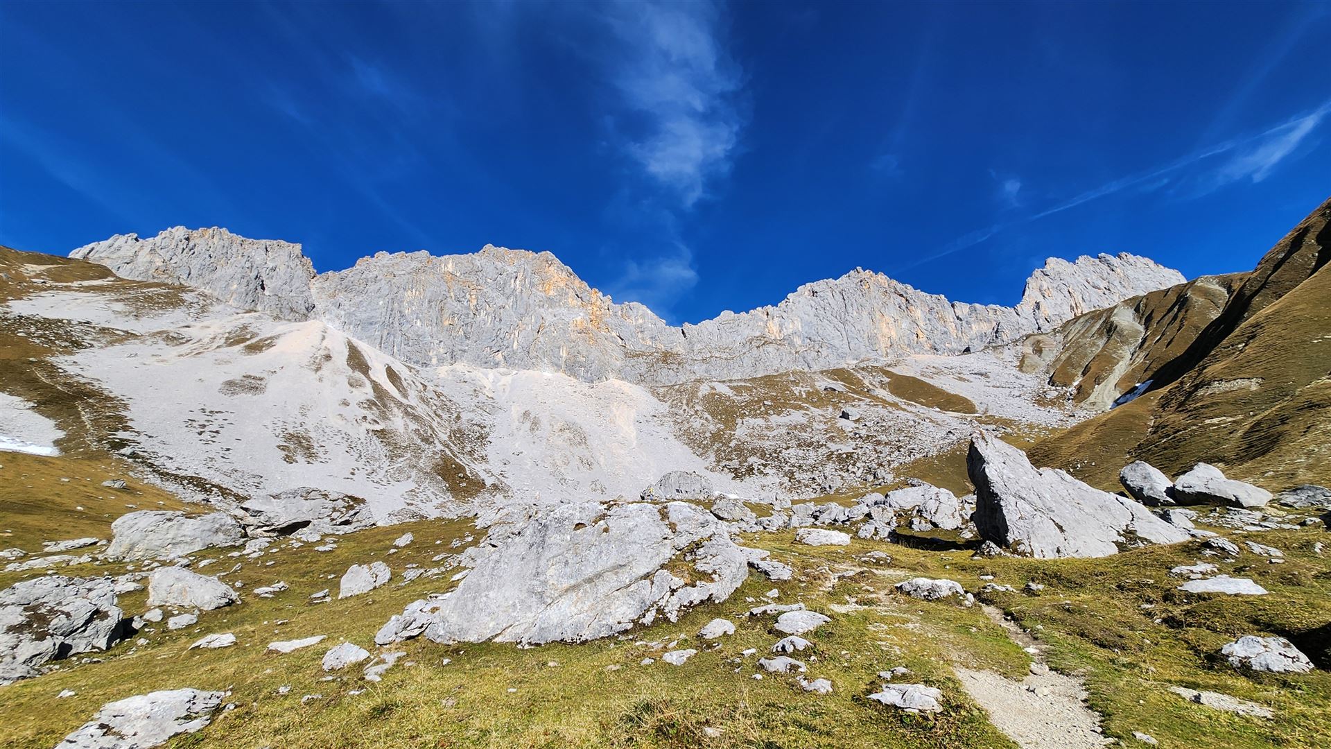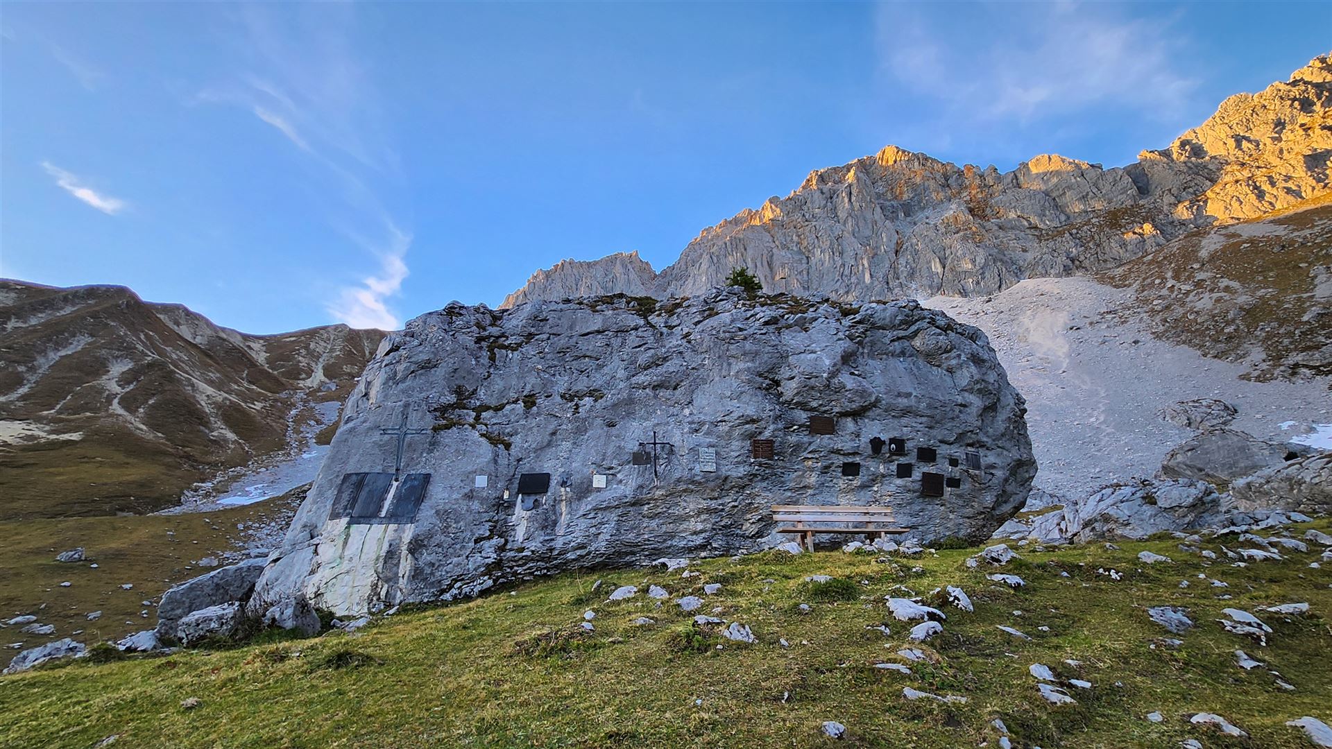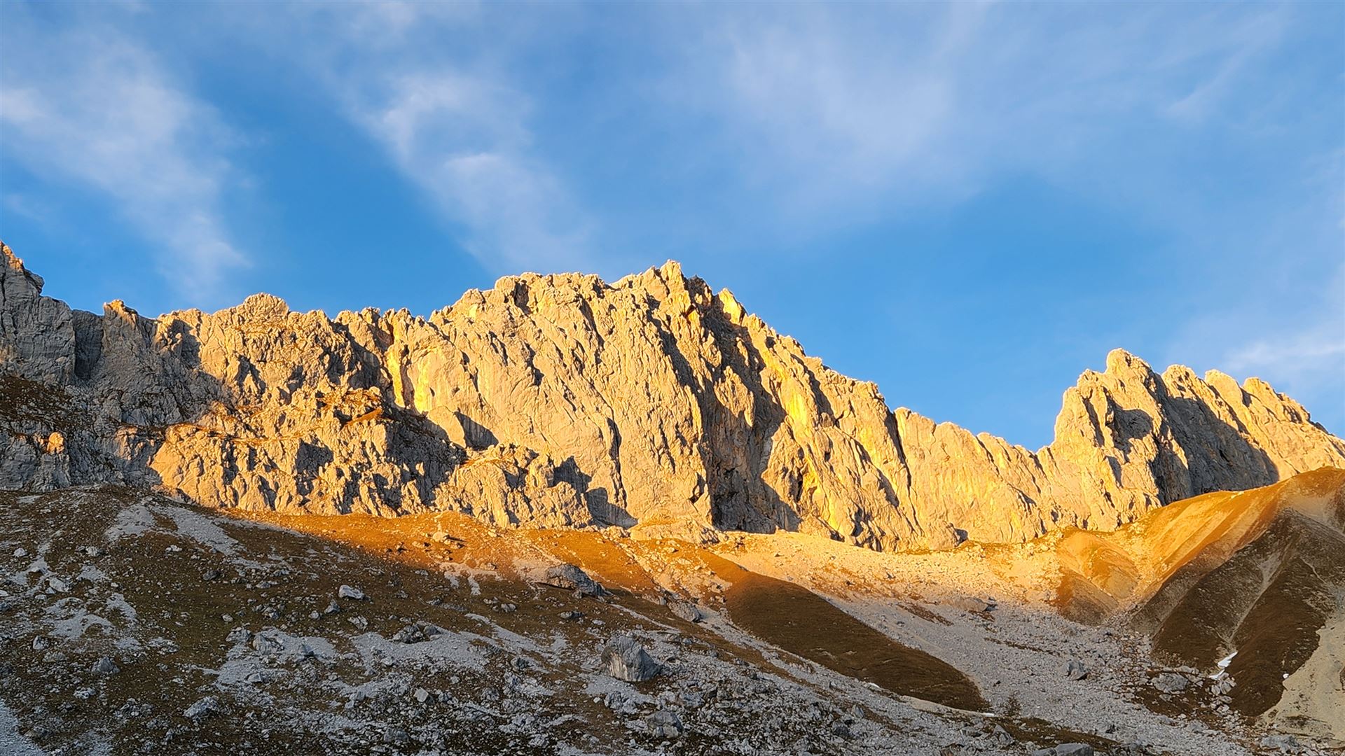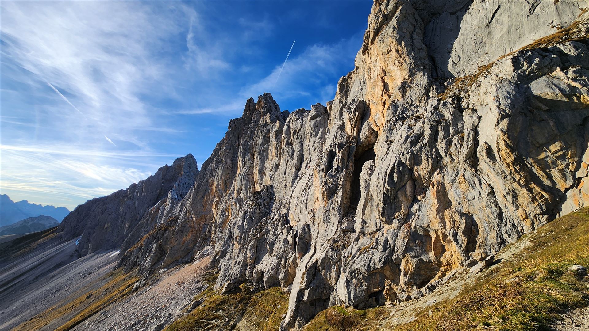 Auf dem Rückweg habe ich noch einen einstündigen Abstecher vom Scharnitzjoch bis an die Felswand der Schüsselkarspitze unternommen. Auch dort traf ich auf Gleitschirmflieger und in den Felswänden hingen mehrere Seilschaften.