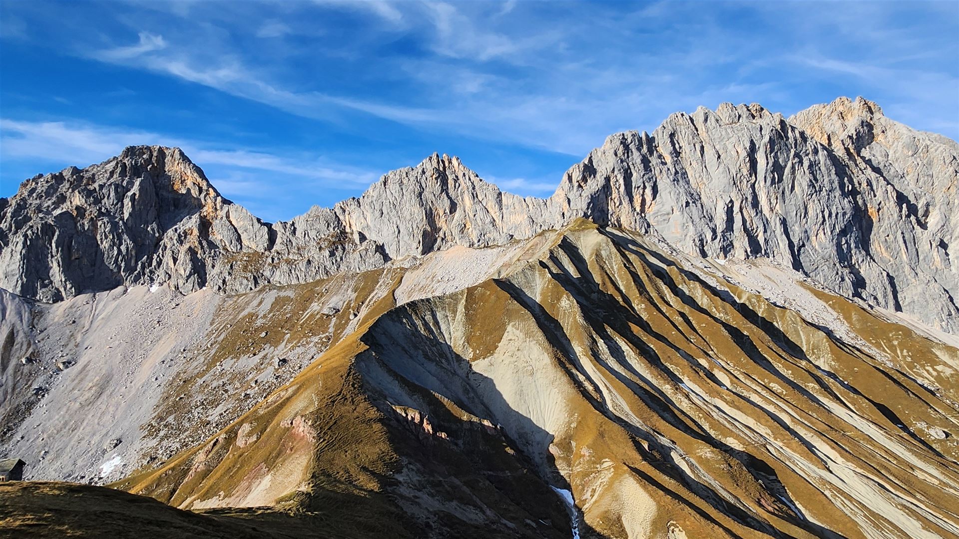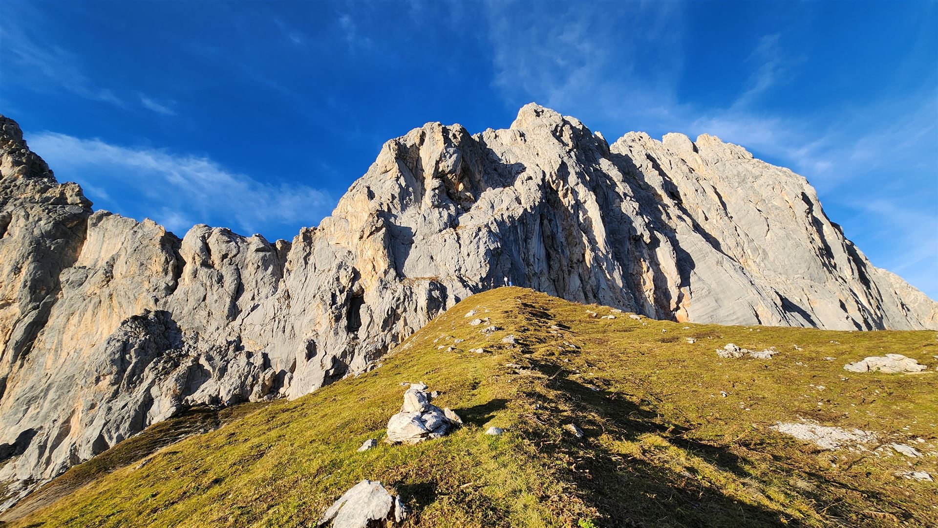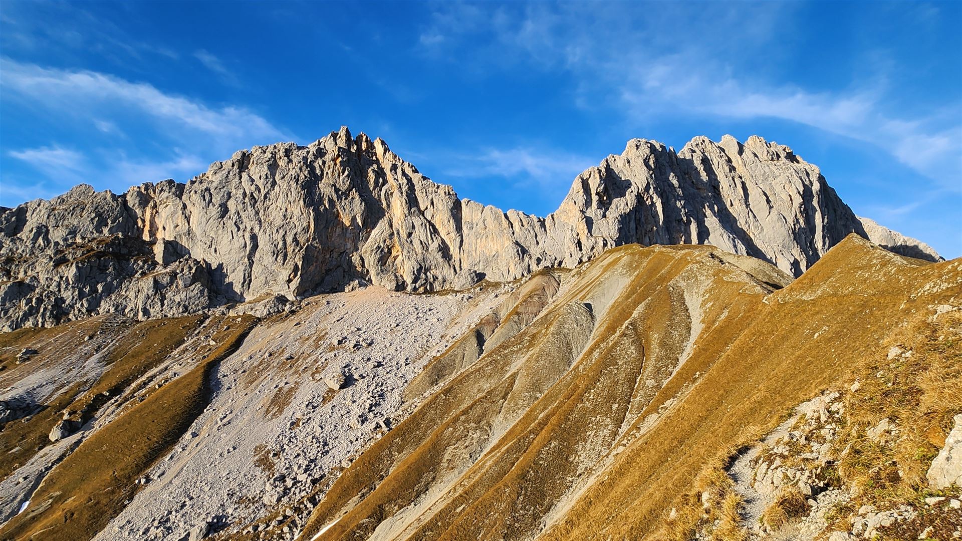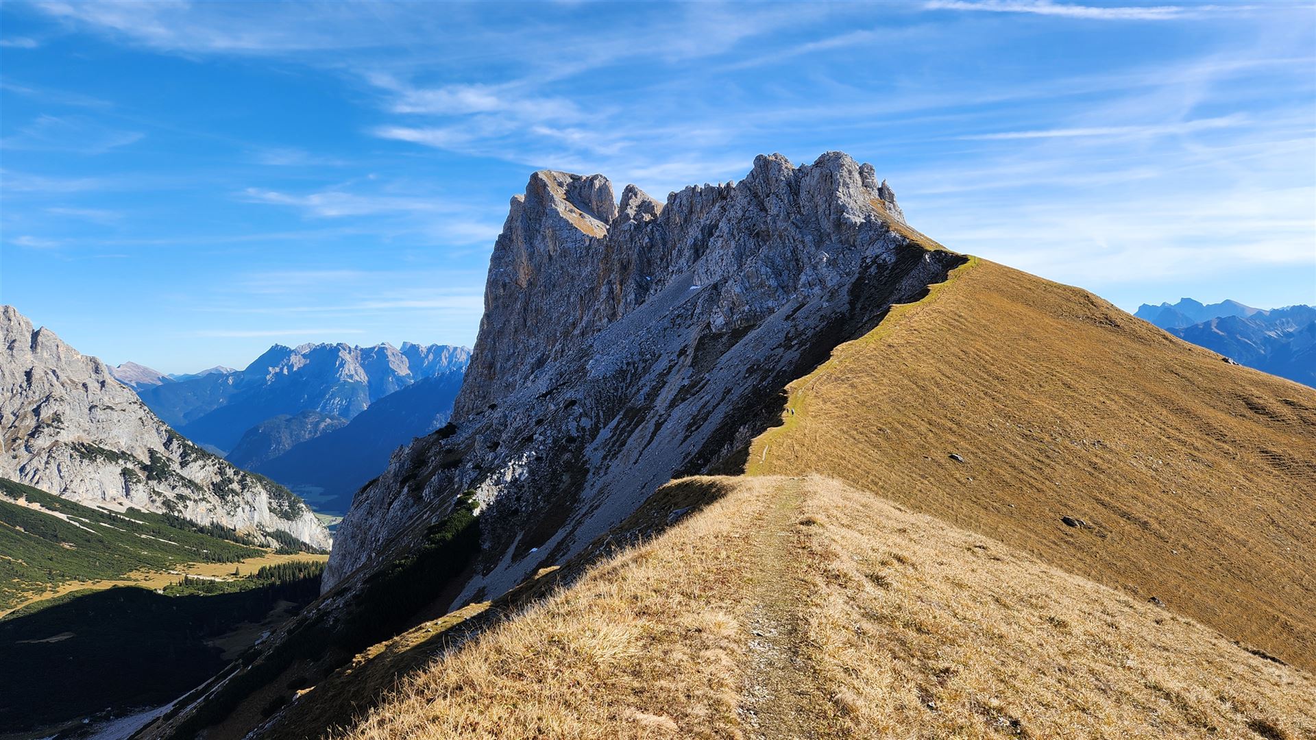 Eine Hangquerung führt zum Scharnitzjoch und von dort zur Erinnerungshütte des Akademischen Alpenvereins München auf 2103 m. Der folgende Wiesengrad Richtung Gehrenspitze, die von hier jedoch vom Kirchl (2247 m) verdeckt wird, erinnert stark an die Seceda in Gröden, einer der am meisten frequentierten Instagram-Hotspots von Südtirol. Allerdings führt dort eine Bahn hinauf. Vielleicht ist das der Grund dafür, dass die Gehrenspitze nicht das gleiche Schicksal ereilt hat. Hier muss man sich den Berg erarbeiten.