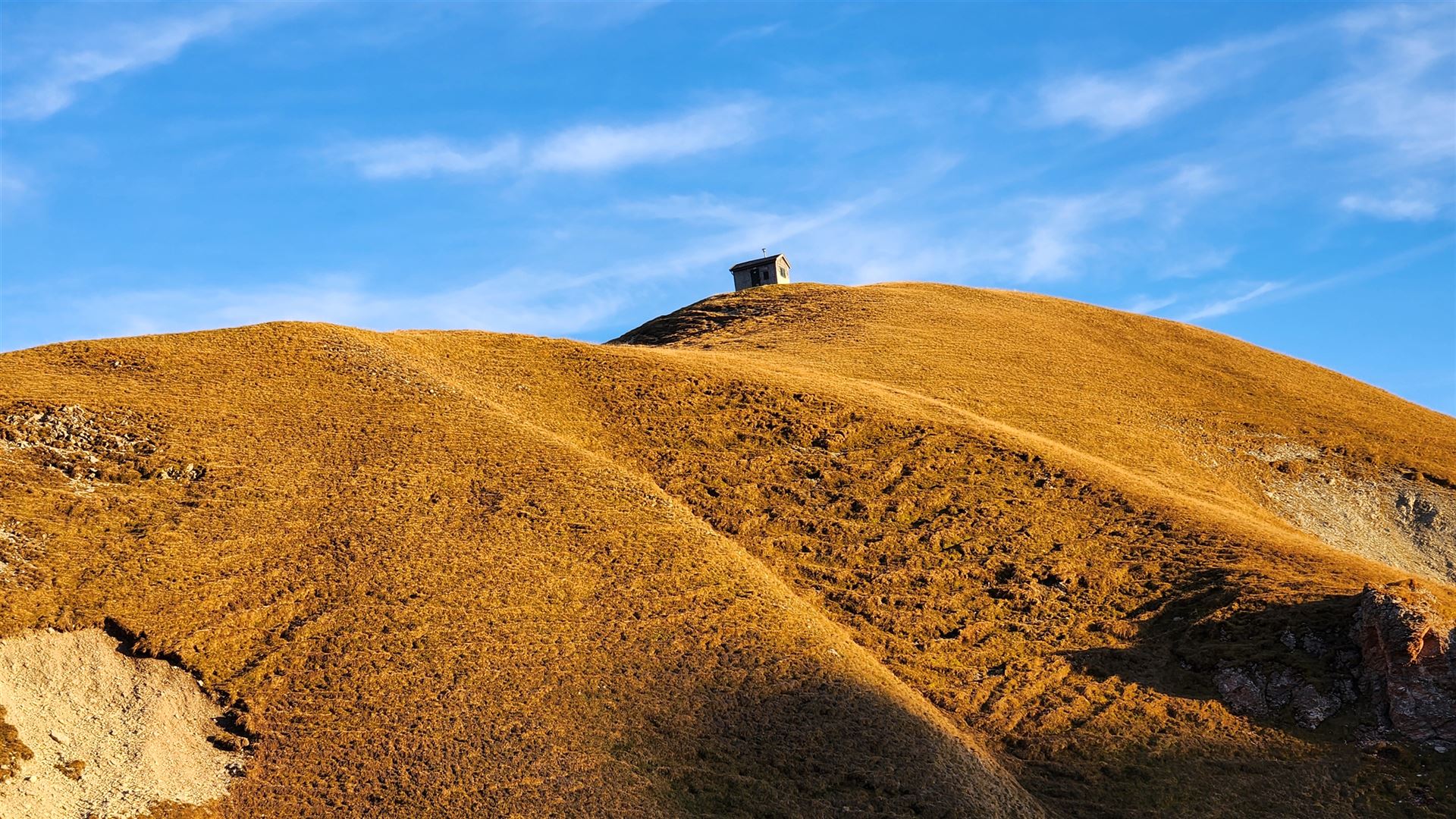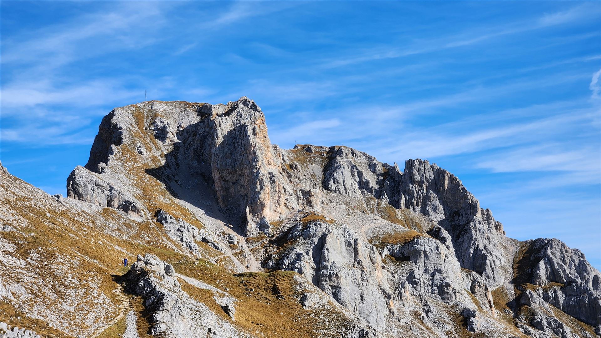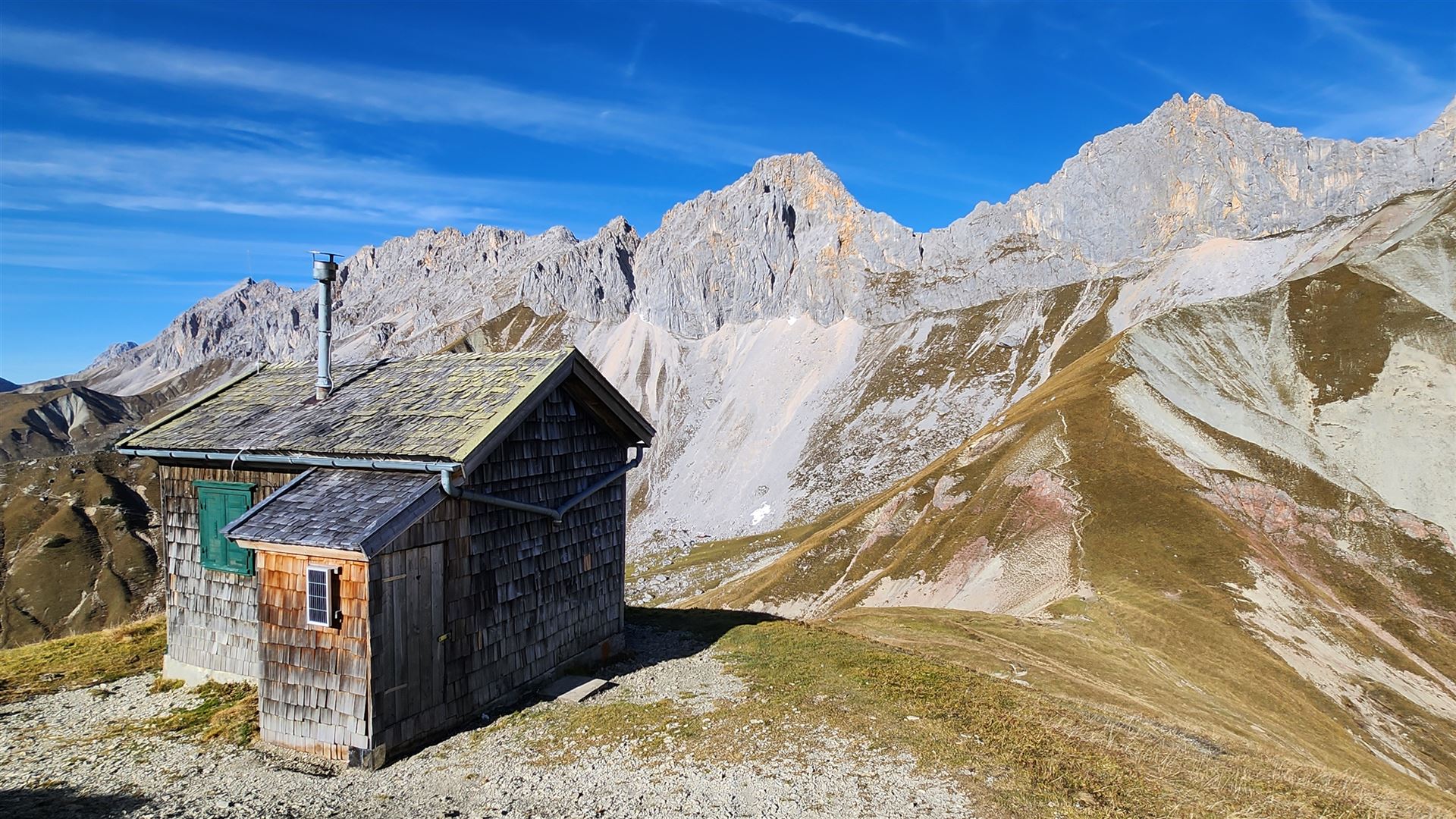 Eine Hangquerung führt zum Scharnitzjoch und von dort zur Erinnerungshütte des Akademischen Alpenvereins München auf 2103 m. Der folgende Wiesengrad Richtung Gehrenspitze, die von hier jedoch vom Kirchl (2247 m) verdeckt wird, erinnert stark an die Seceda in Gröden, einer der am meisten frequentierten Instagram-Hotspots von Südtirol. Allerdings führt dort eine Bahn hinauf. Vielleicht ist das der Grund dafür, dass die Gehrenspitze nicht das gleiche Schicksal ereilt hat. Hier muss man sich den Berg erarbeiten.