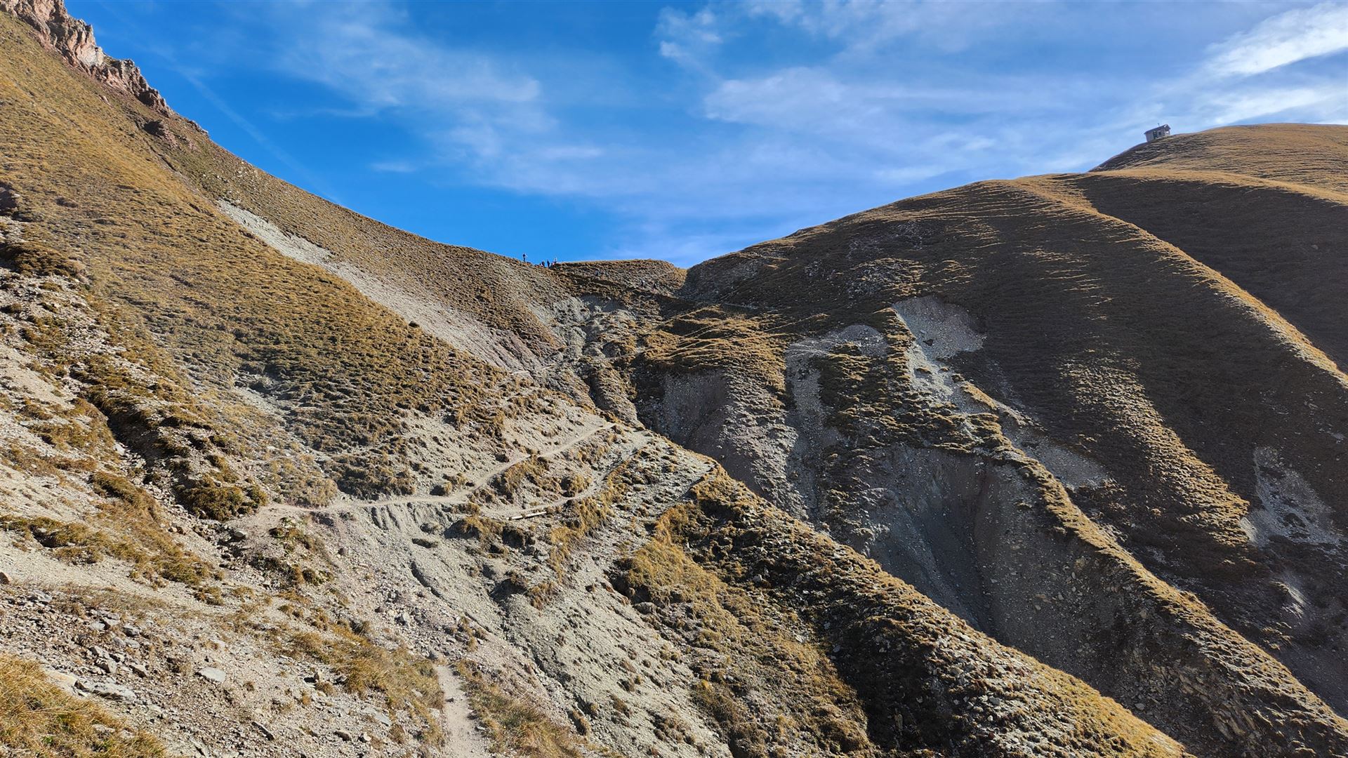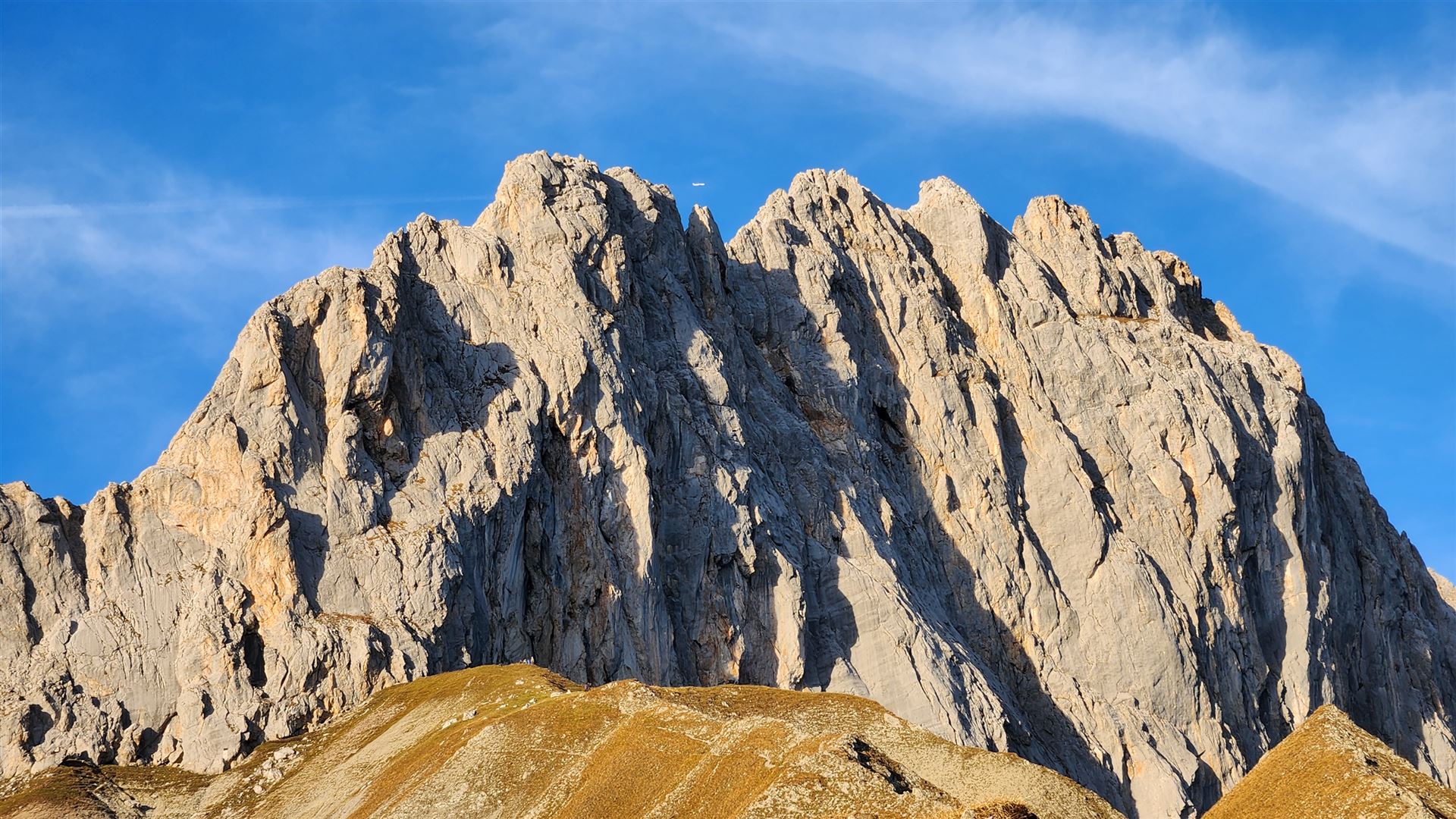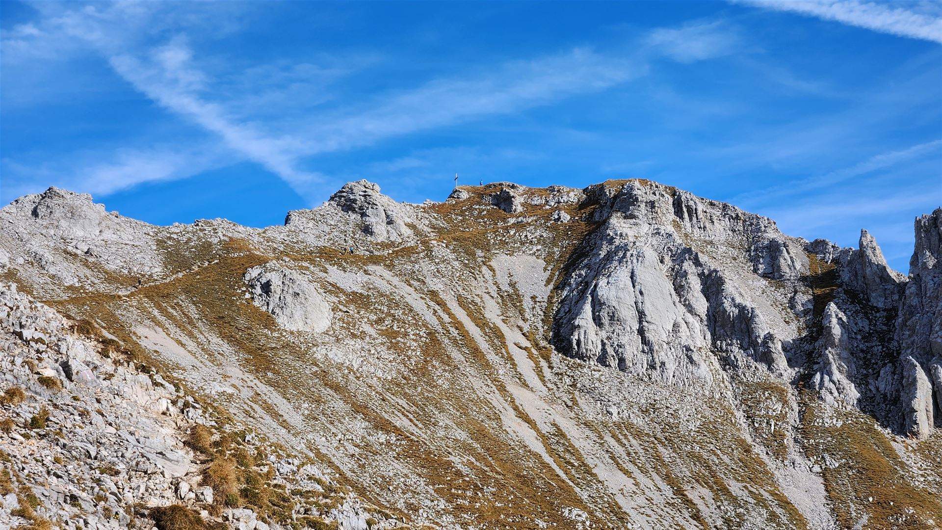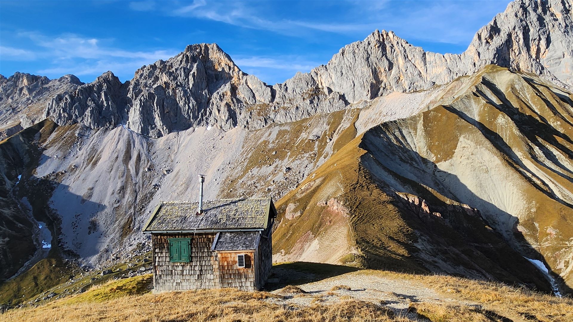Eine Hangquerung führt zum Scharnitzjoch und von dort zur Erinnerungshütte des Akademischen Alpenvereins München auf 2103 m. Der folgende Wiesengrad Richtung Gehrenspitze, die von hier jedoch vom Kirchl (2247 m) verdeckt wird, erinnert stark an die Seceda in Gröden, einer der am meisten frequentierten Instagram-Hotspots von Südtirol. Allerdings führt dort eine Bahn hinauf. Vielleicht ist das der Grund dafür, dass die Gehrenspitze nicht das gleiche Schicksal ereilt hat. Hier muss man sich den Berg erarbeiten.