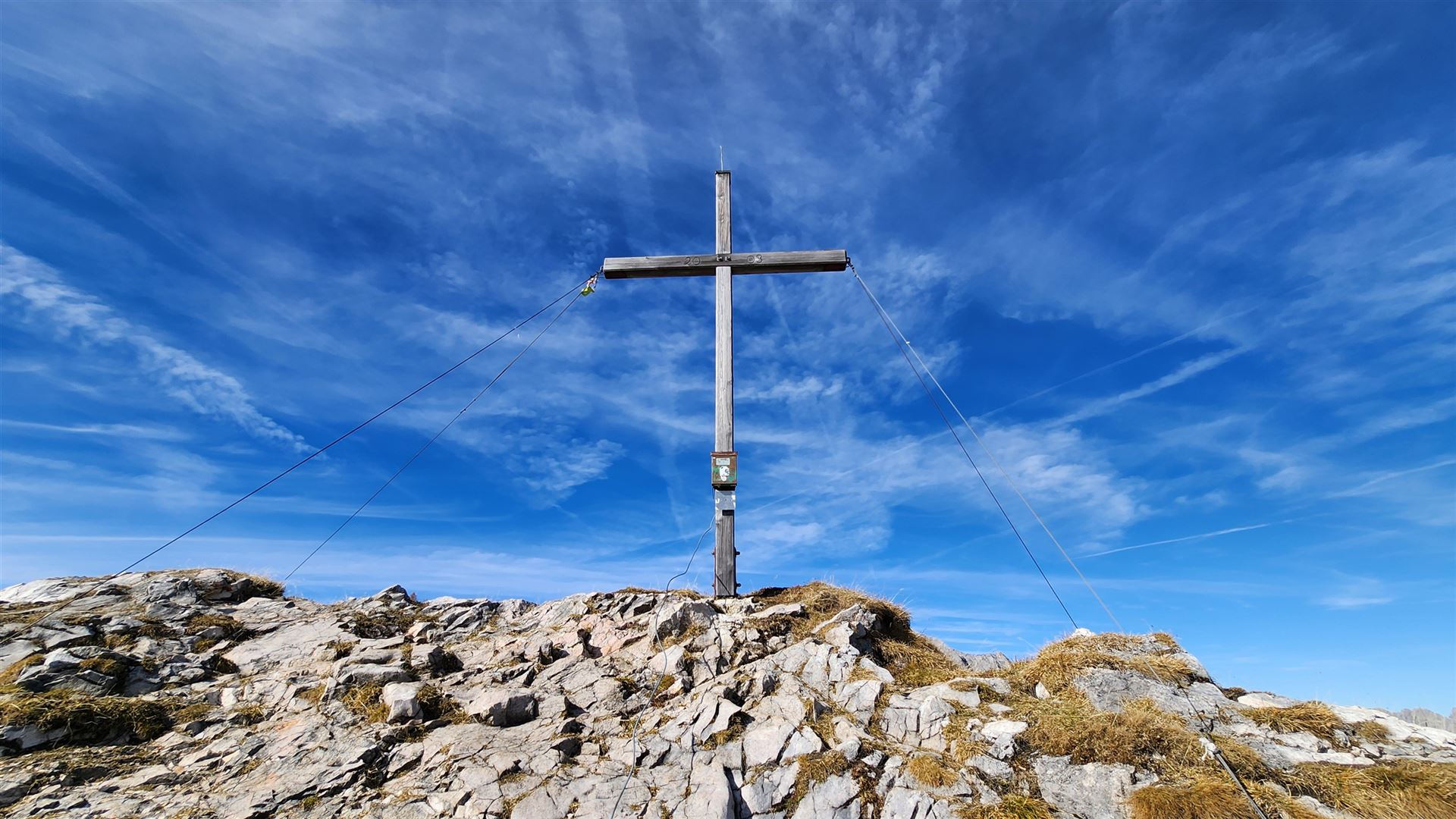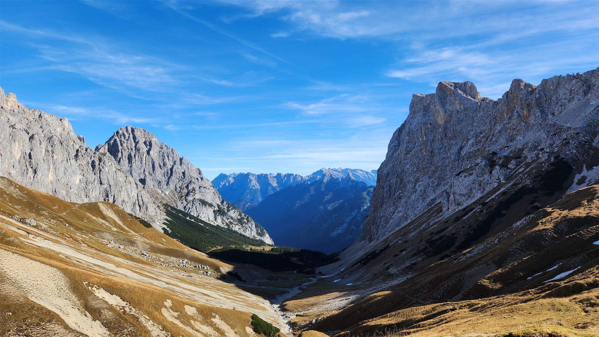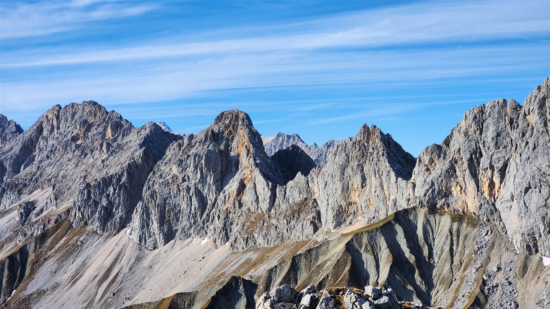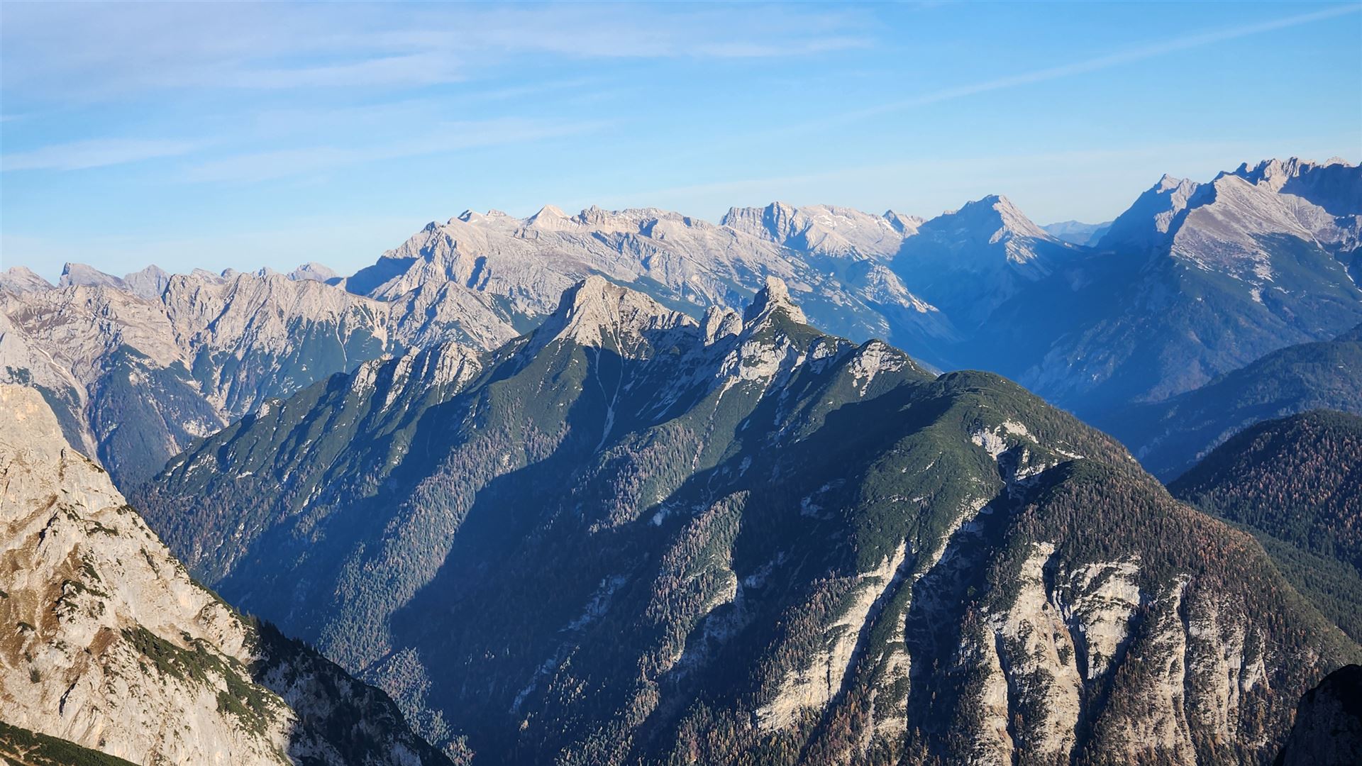 Vom Gipfel sieht man dann den Hochwanner (2744 m) und die Leutascher Dreitorspitze (2682 m). Neben dem Oberreintalschrofen spitzt die Zugspitze (2962 m) heraus. Ganz rechts schließt der Öfelekopf (2478 m) das Panorama ab.