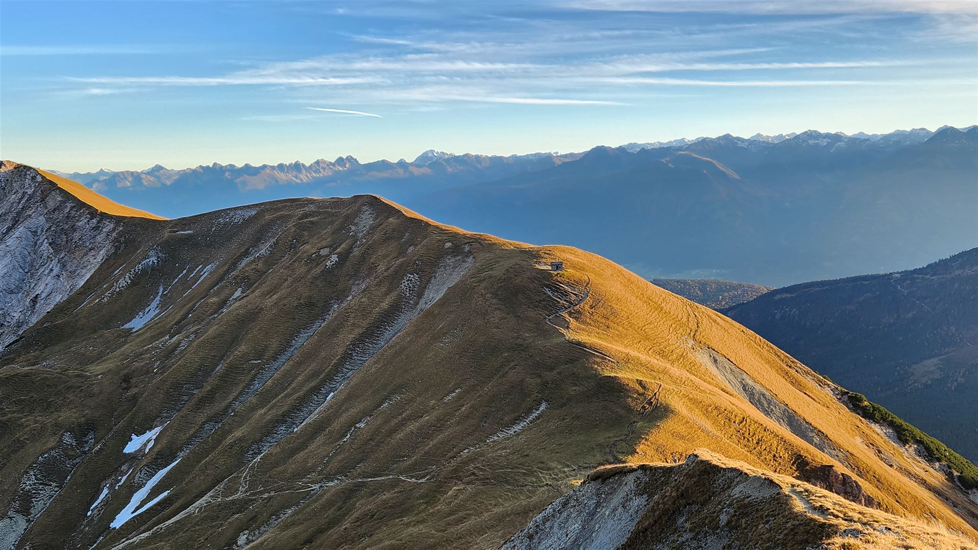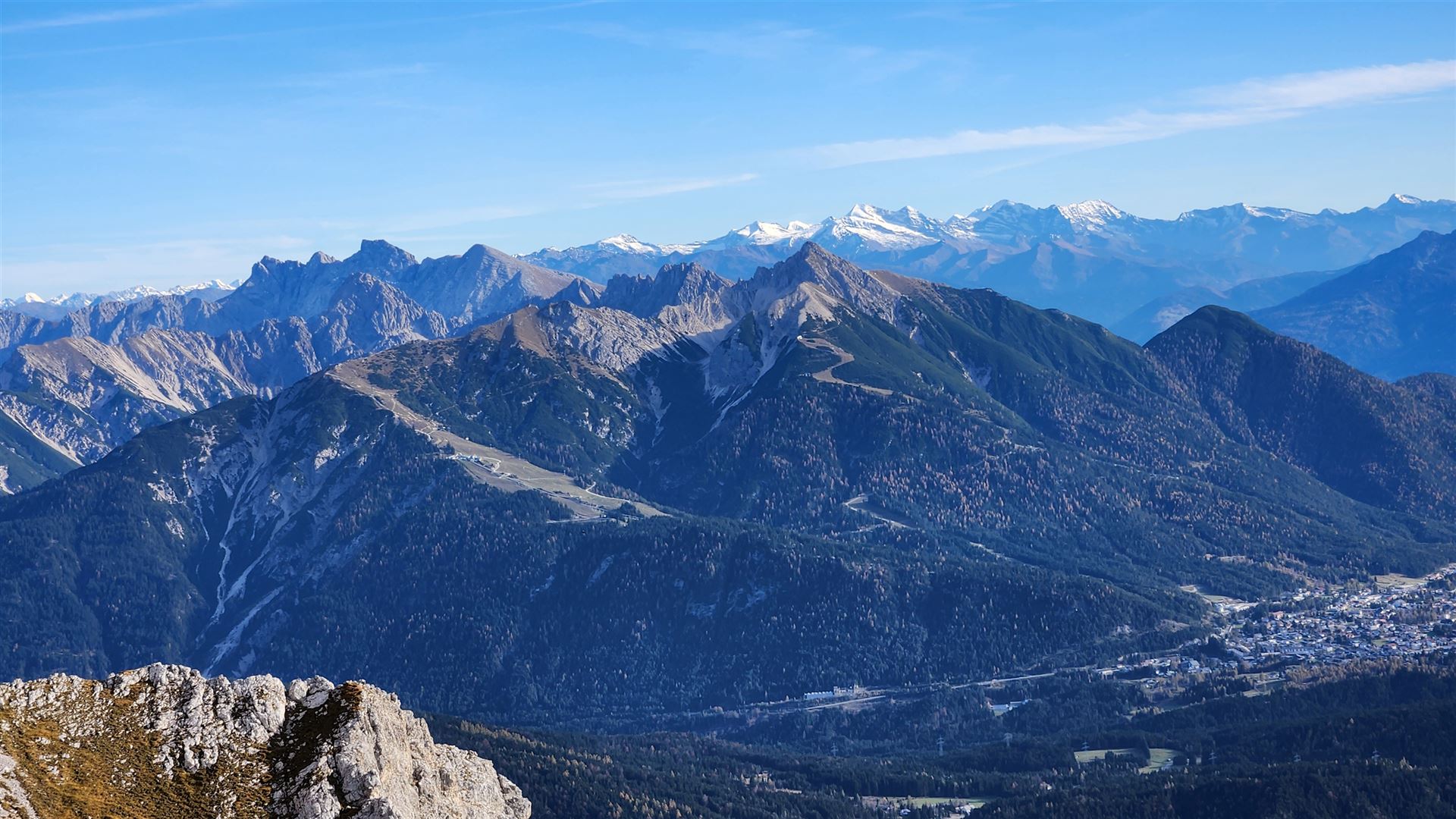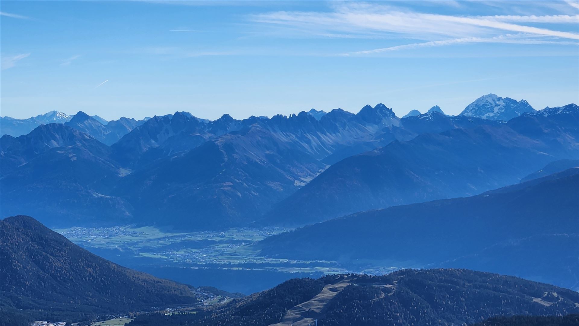 Im Süden reicht der Blick von der Saile (Nockspitze, 2404 m, war auch eine nette Tour), die Serles (2717 m), die Kalkkögel, die Tribulaune und den prominenten Habicht (3277 m) bis zum Wilden Freiger (3418 m), Ruderhofspitze (3474 m) und Schrankogel (3497 m). Die Wilde Kreuzspitze in Südtirol (3135 m) darf auch nicht fehlen.