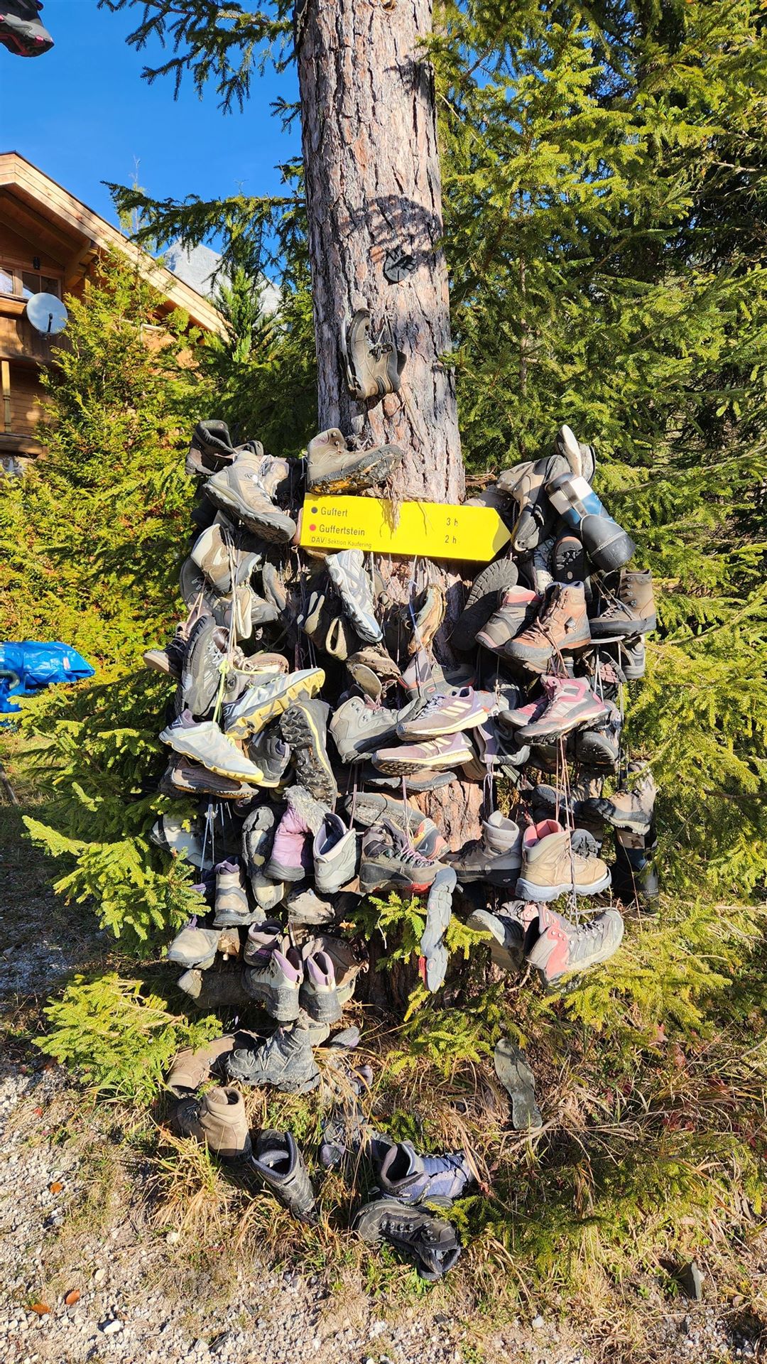 Vom Parkplatz beim Gasthof Waldhäusl (6 Euro die Tageskarte) in Steinberg am Rofan, in einem Seitental vor dem Achensee gelegen, führt ein schöner Steig durch den Wald. Der Beginn des Wegs ist durch einen Schuh-Friedhof markiert. Zahlreiche ausgediente Wanderschuhe zieren einen Baumstamm.