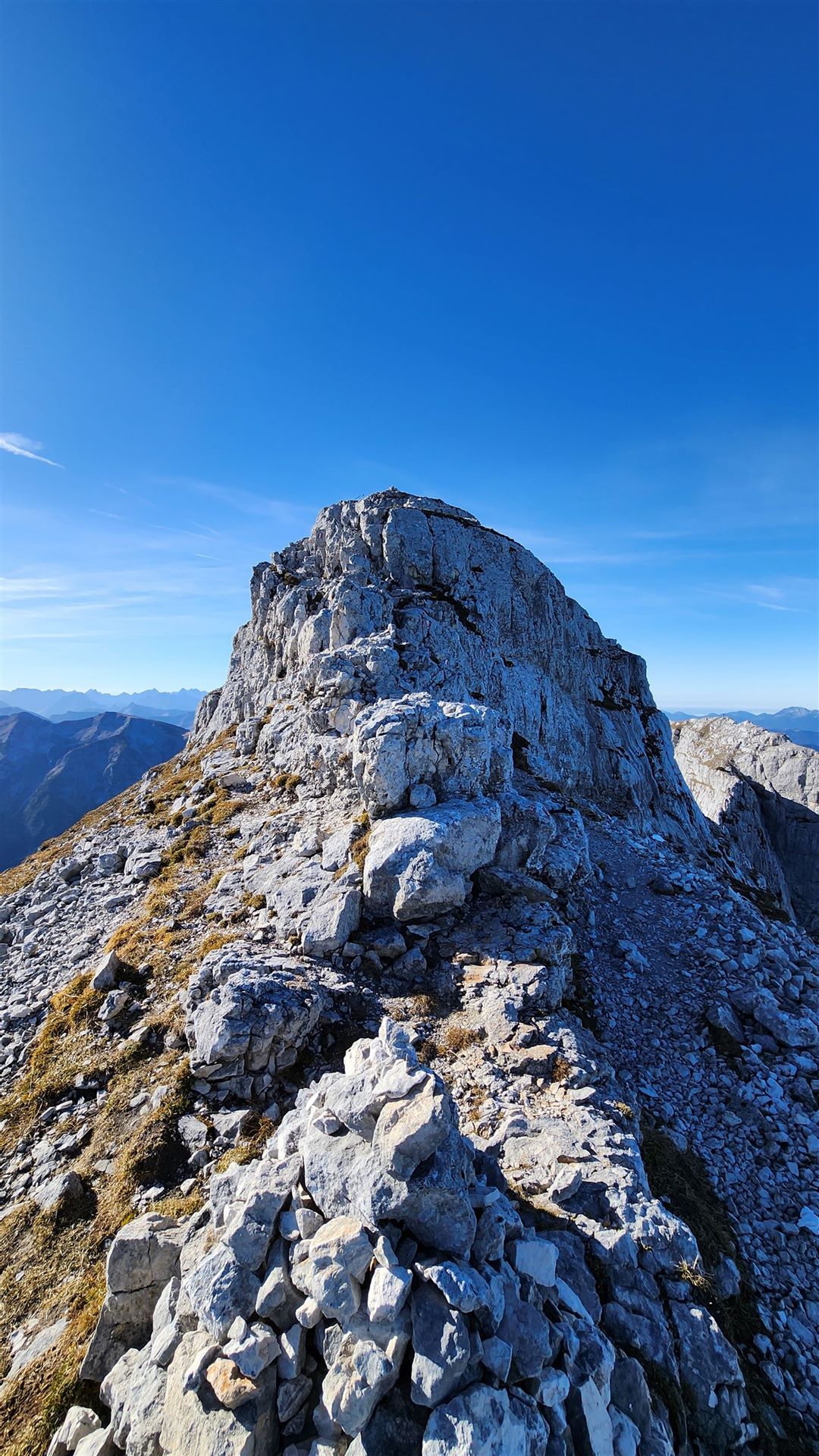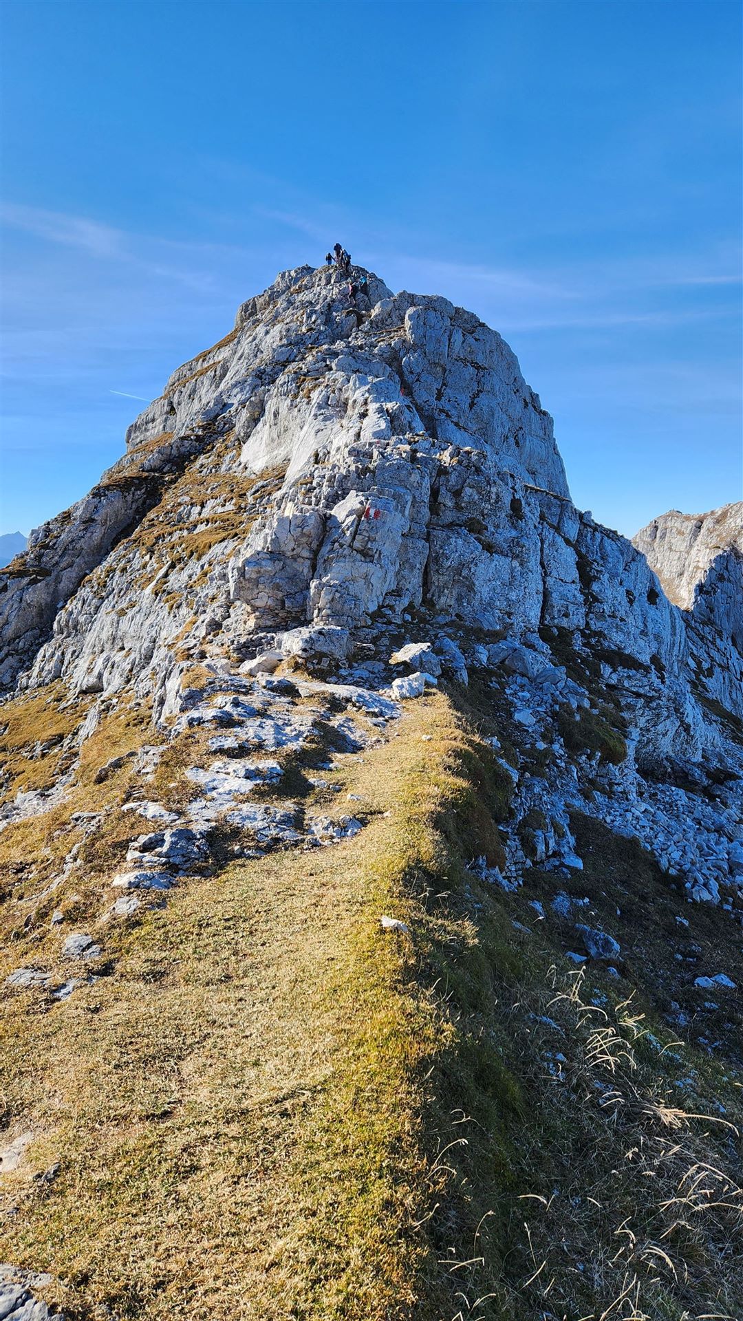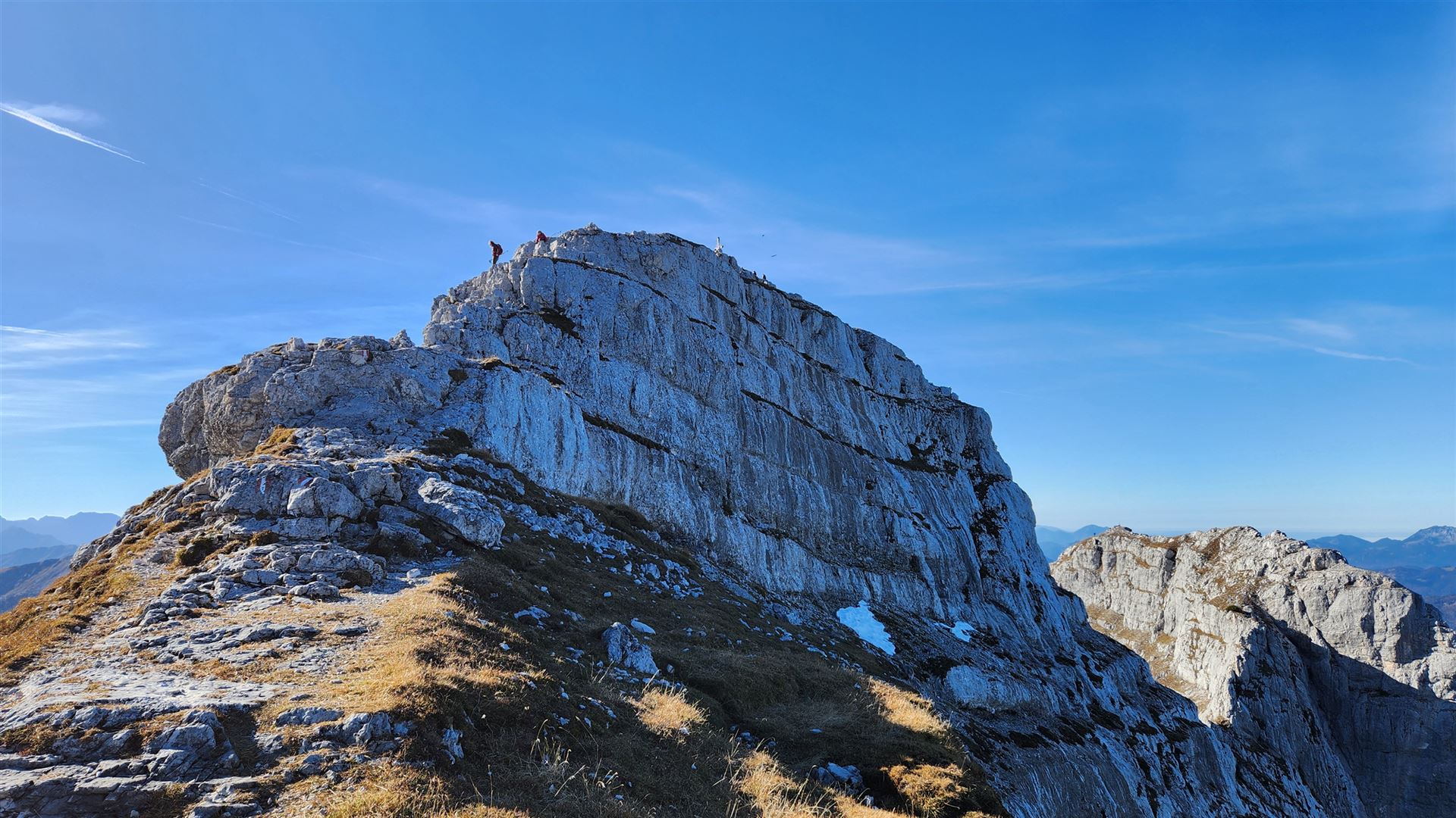 Im folgenden Latschen-Bereich unterhalb einer Steilwand ist dann leichtes Kraxeln angesagt. Am Joch angekommen geht es nach links über karstiges Gelände und einen Gipfelgrat mit leichter Kletterei auf den höchsten Punkt auf 2195 Meter. Einige Stellen sind mit Stahlseilen versichert.