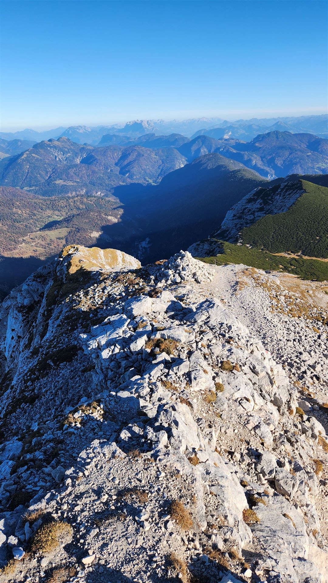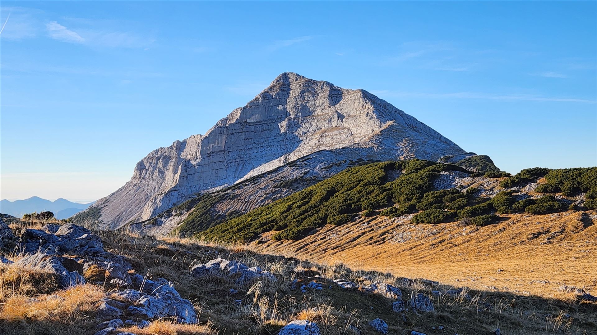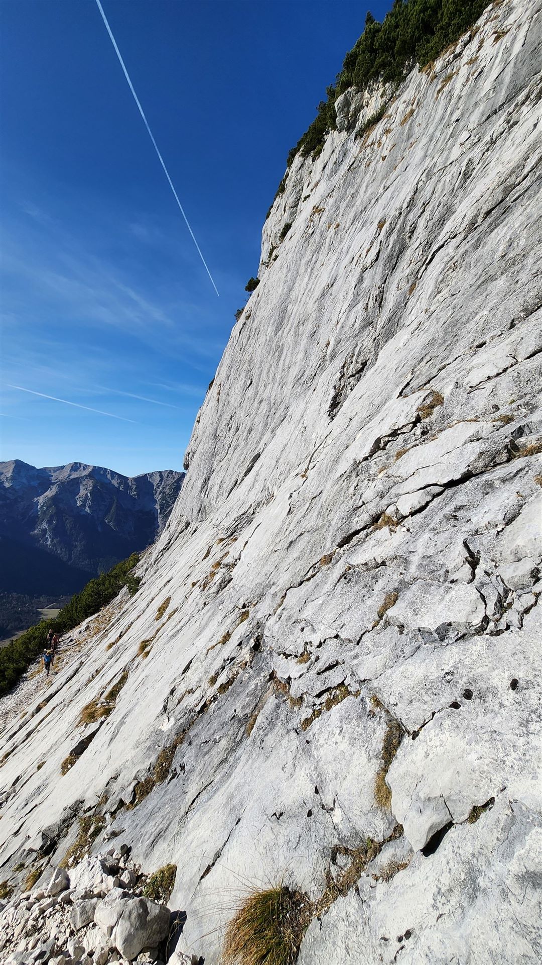 Im folgenden Latschen-Bereich unterhalb einer Steilwand ist dann leichtes Kraxeln angesagt. Am Joch angekommen geht es nach links über karstiges Gelände und einen Gipfelgrat mit leichter Kletterei auf den höchsten Punkt auf 2195 Meter. Einige Stellen sind mit Stahlseilen versichert.