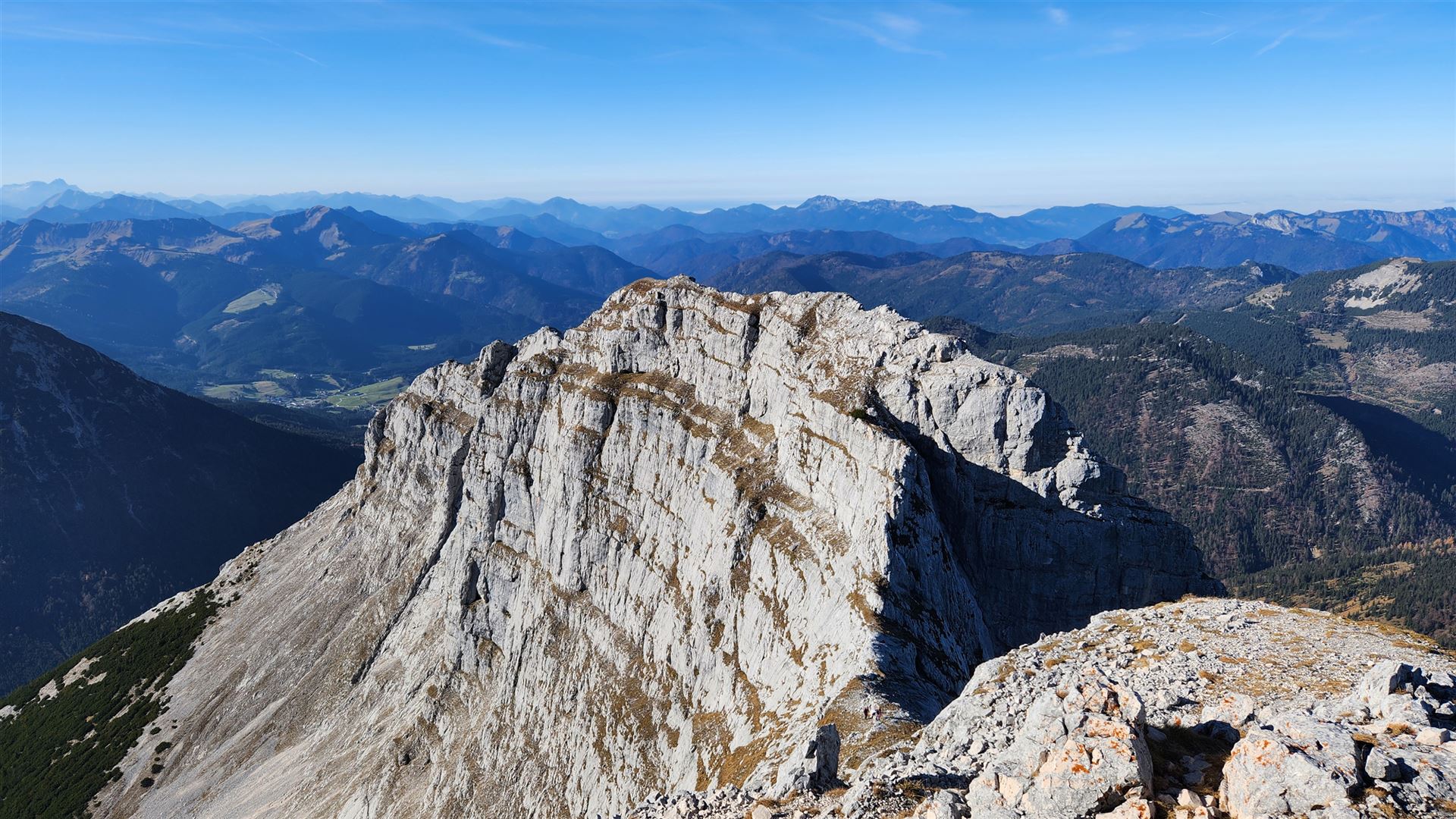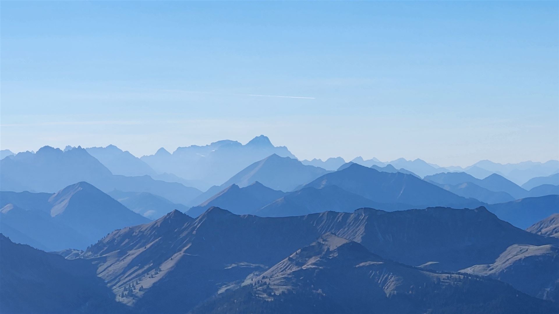 Die Zugspitze ist ca. 61 km Luftlinie entfernt, davor ist die Alpspitze deutlich zu erkennen. Über die Ammergauer Alpen mit der Kreuzspitze geht es weiter zur Benediktenwand und nur ca. 10 Kilometer entfernt der Leonardstein über Kreuth. Ein weiterer Aufstieg auf den Guffert ist übrigens von Kreuth aus möglich.