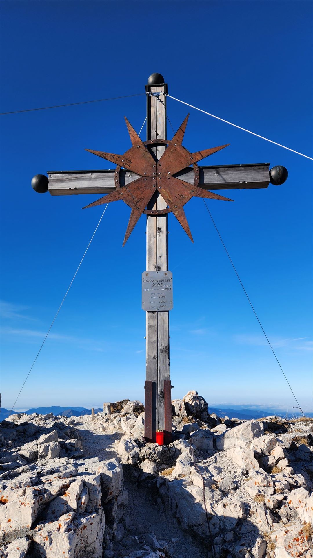 Den Gipfel ziert ein sehr schönes Kreuz, das der Ernennung von Steinberg am Rofan zum Bergsteigerdorf gewidmet ist. Bergsteigerdörfer verpflichten sich zu nachhaltigem Tourismus. Der Kasten mit dem Gipfelbuch ist nicht am Kreuz, sondern ein paar Meter entfernt aufgestellt ist.