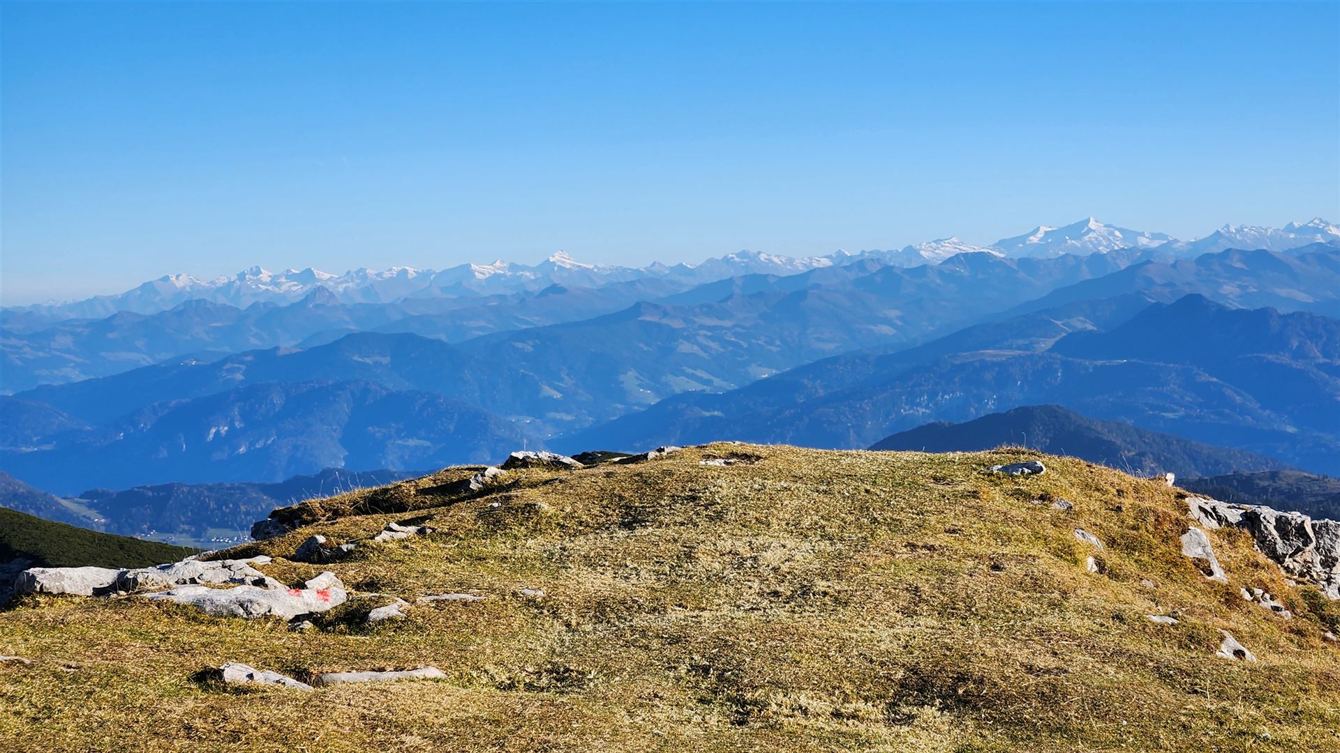Vom Gipfel reicht der Blick bis zur Kette der Schneeriesen im Osten, zum Kitzsteinhorn, Großglockner und Großvenediger. Der Großglockner ist nur ca. 87 km Luftlinie entfernt. Auch das Kaisergebirge mit Elmauer Halt, der Dachstein und der Hochkönig sind auszumachen. Im Uhrzeigersinn folgen der Hochgall, der Hochfeiler, der Große Löffler und der Olperer hinter der Rofanspitze, danach das Karwendelgebirge mit der Birkkarspitze. Dazwischen spitzen der Wilde Freiger und das Zuckerhütl hervor.