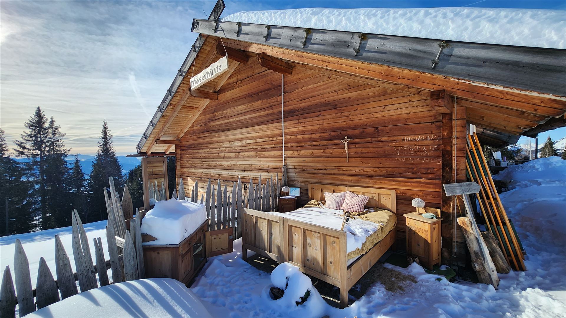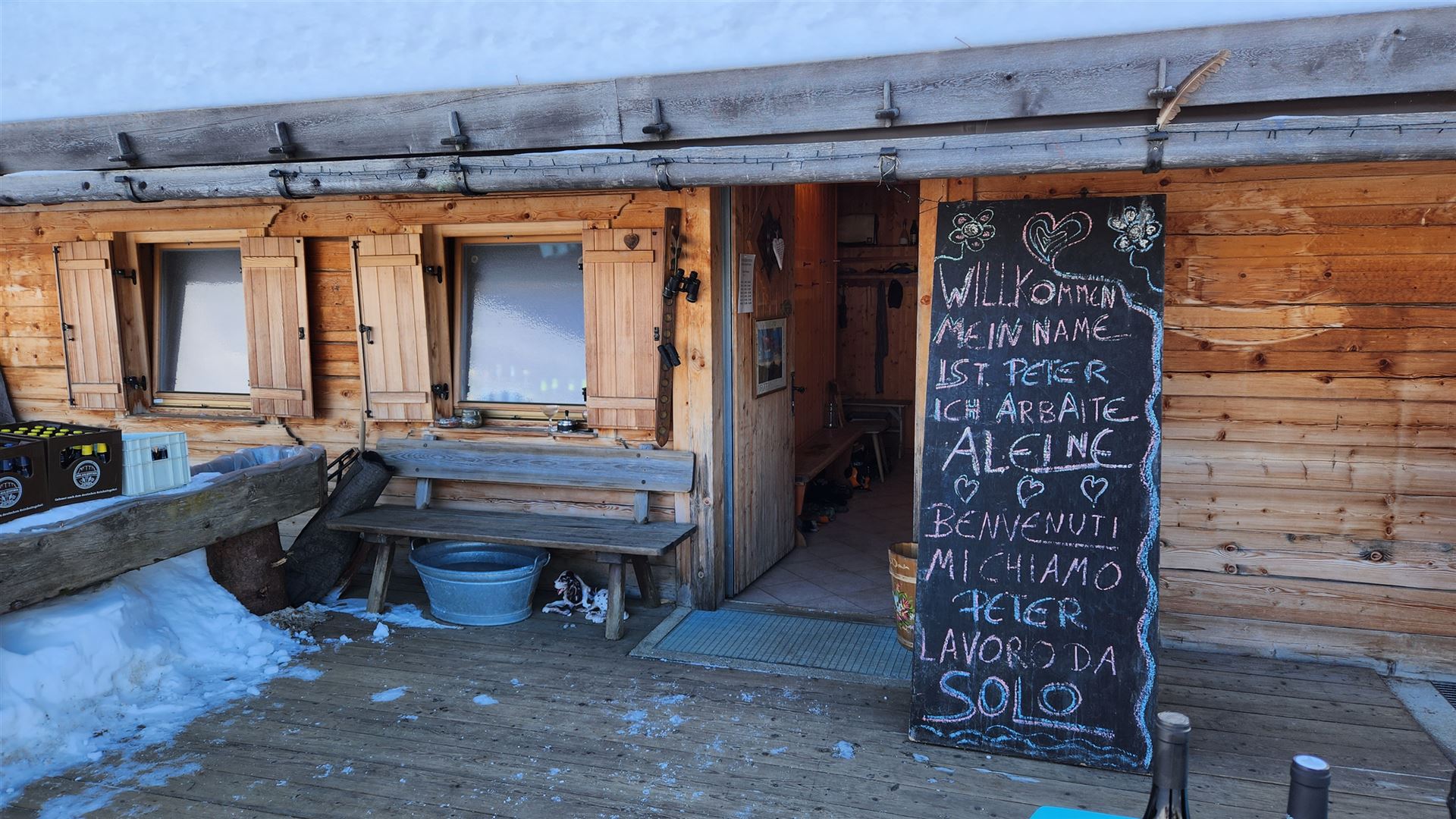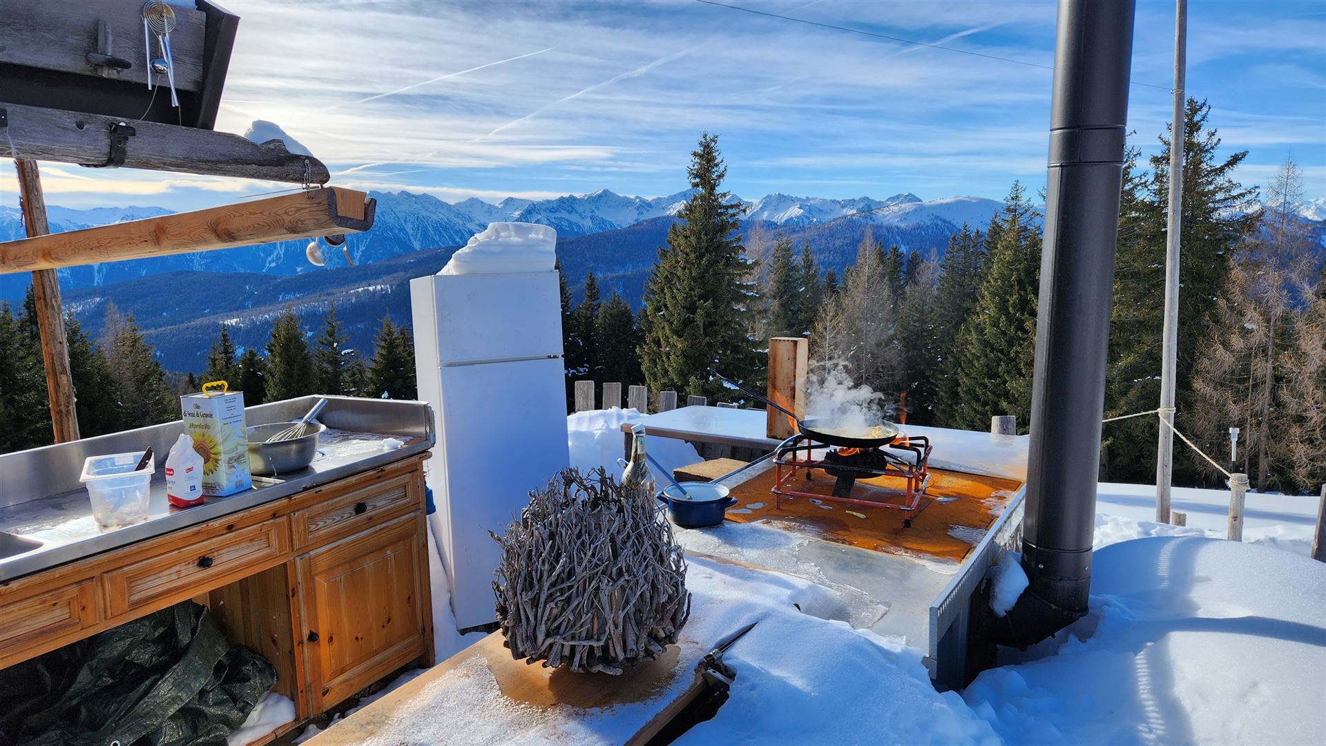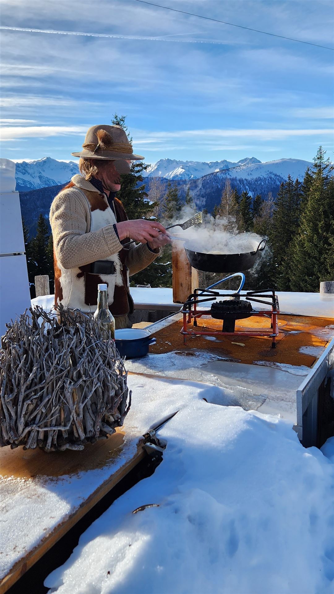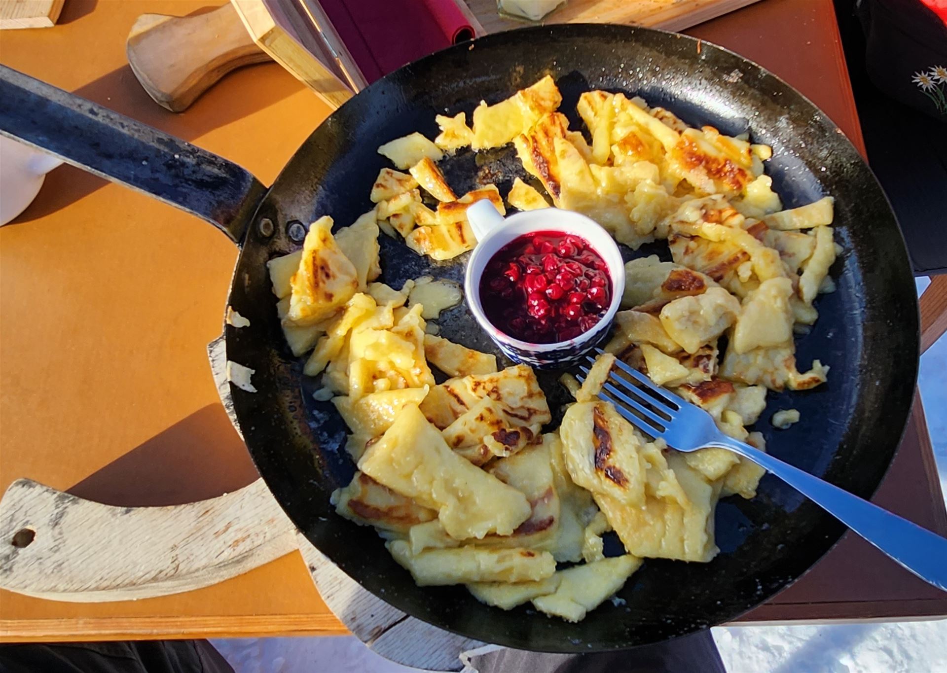 Zurück an der Moserhütte gönnten wir uns einen Kaiserschmarrn. Peter, der Betreiber der Hütte, wies auf einem Schild extra darauf hin, dass er alles allein erledigt. Entsprechend hastete er zwischen Gaststube, Außenbereich und Gasherd auf der Terrasse hin und her. Und jetzt folgte das Highlight: Peter bereitete den Kaiserschmarrn vor meinen Augen an der urigen Außen-Bar zu, die offenbar aus gebrauchten Möbeln zusammengestellt war. Aber gerade das sorgte für das entsprechende Ambiente. Die Pfanne qualmte und der Kaiserschmarrn schwebte beim Wenden kurzzeitig in der Luft. Das Ganze wurde dann noch mit Zirbenschnaps flambiert. Das Ergebnis war der beste Kaiserschmarrn, den ich je genossen habe. Das Auge isst halt auch mit.