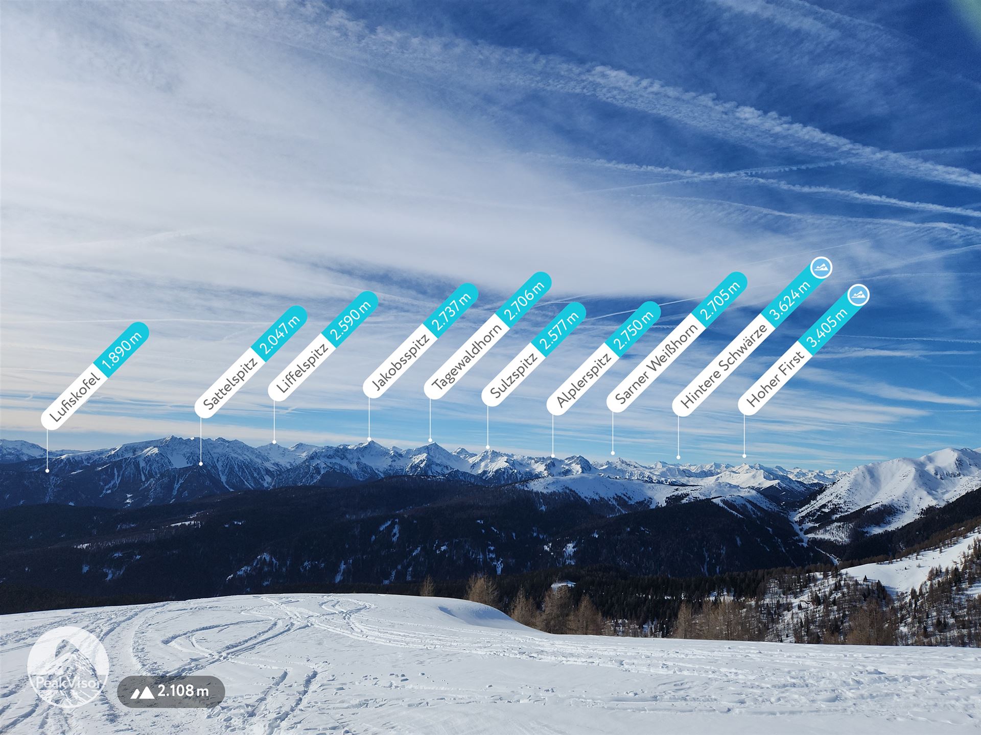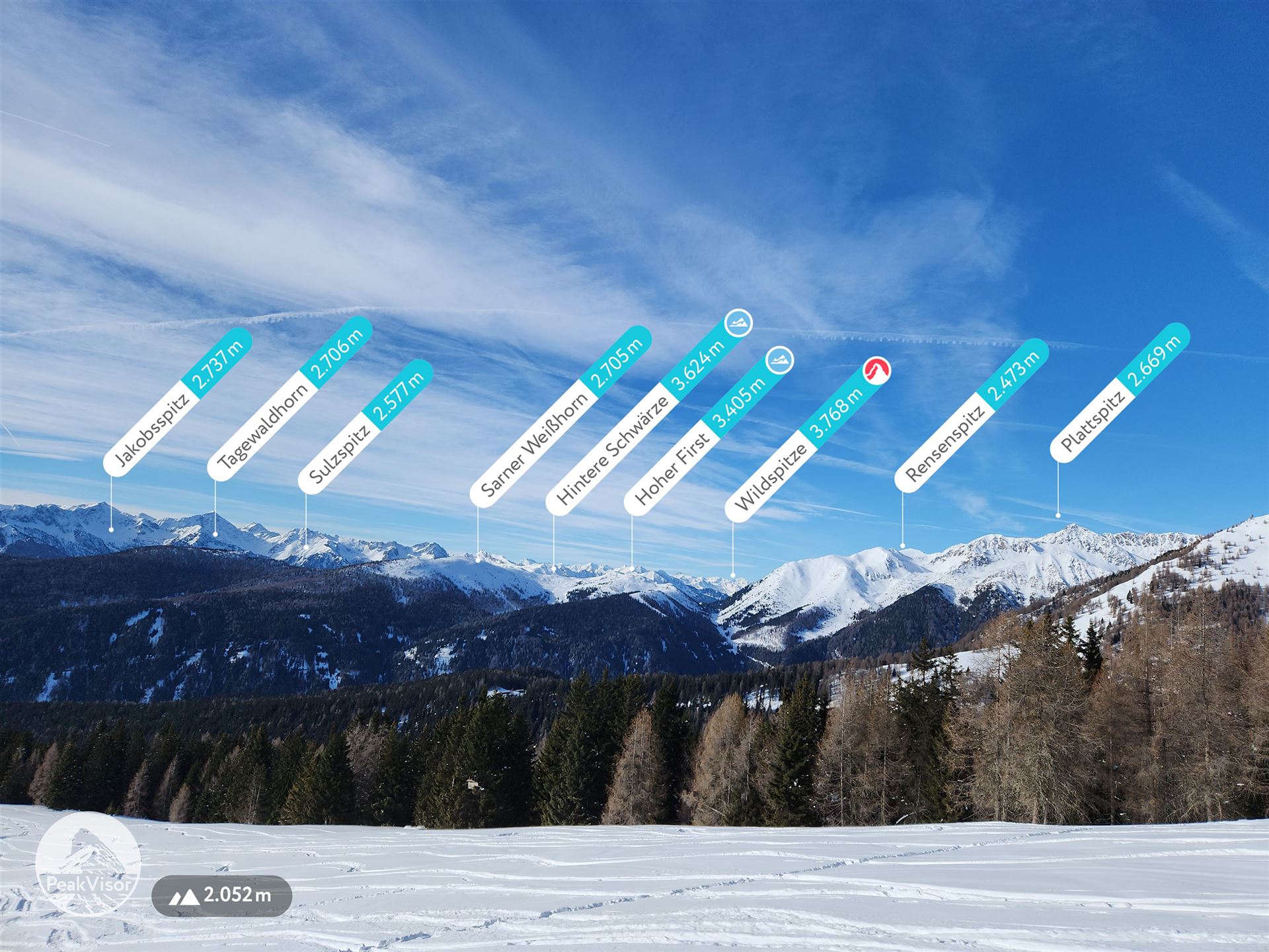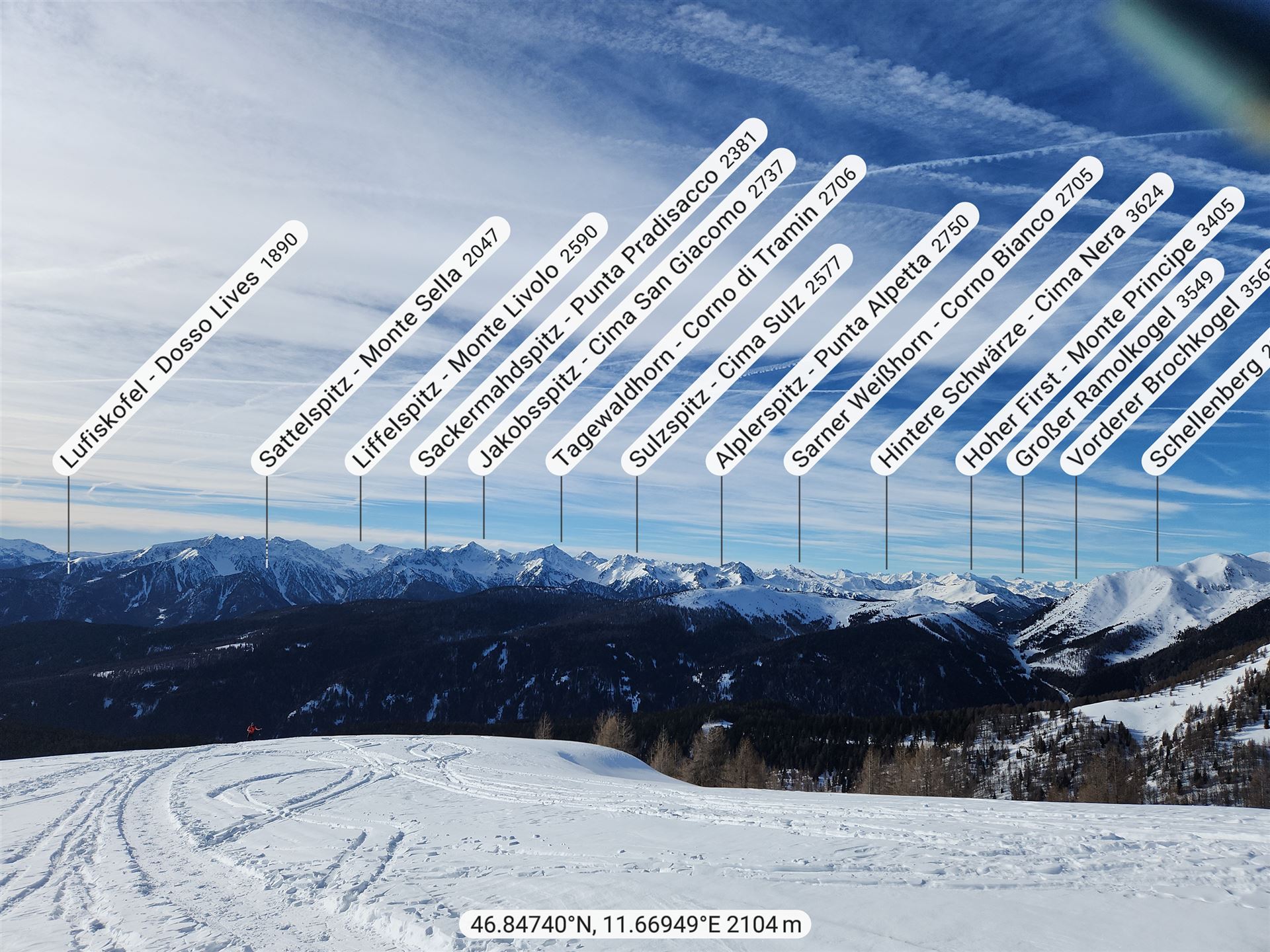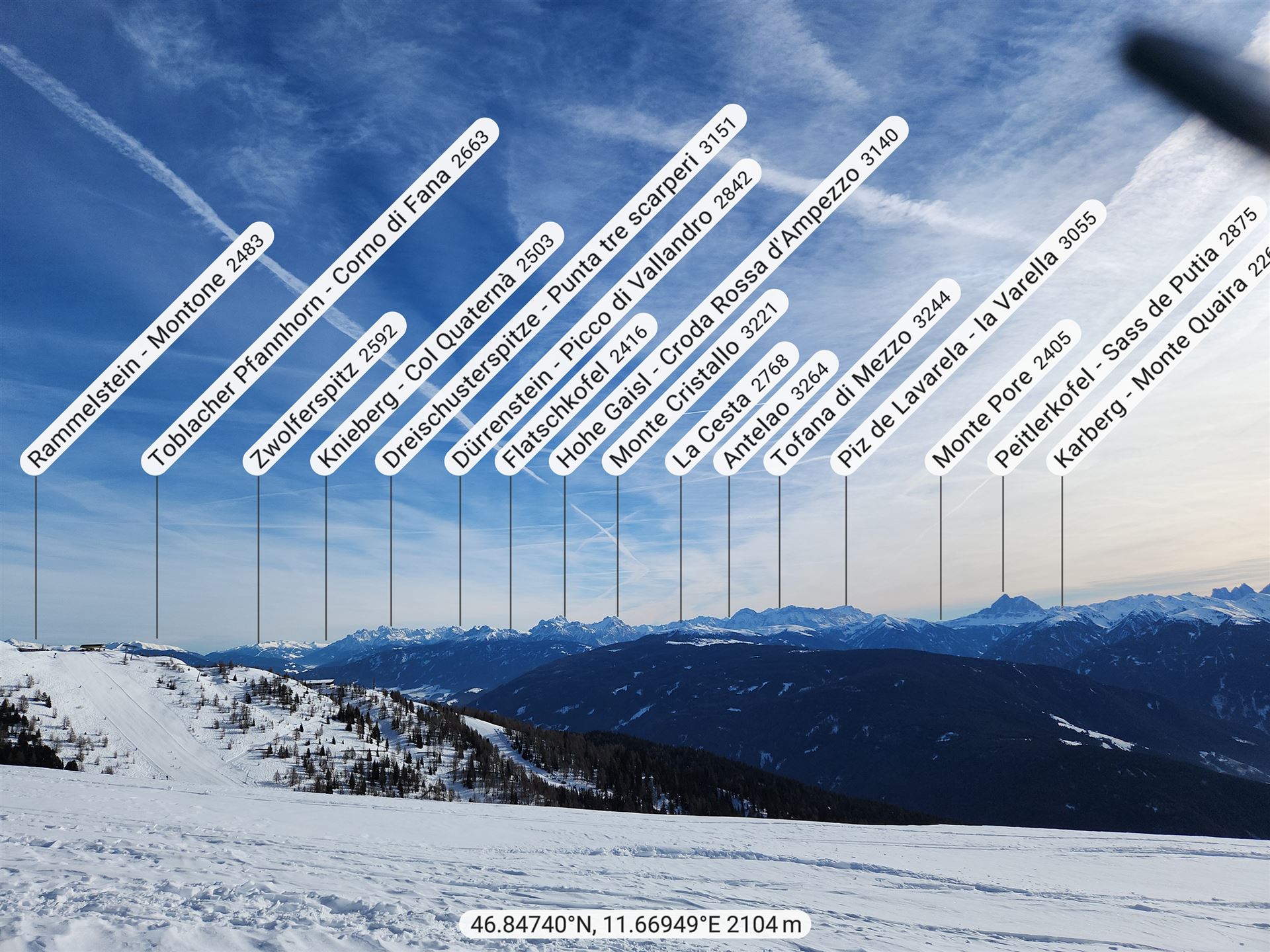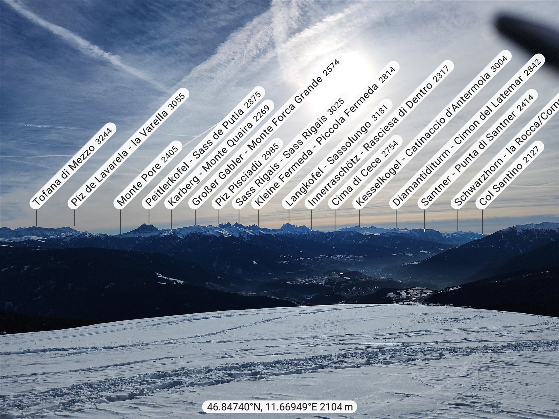 Schon kurz nach der Moserhütte wird das Bergpanorama rundherum ersichtlich: Im Süden der Antelao (3264 m) bei Cortina d’Ampezzo, die Dreischusterspitze (3151 m) bei den Drei Zinnen, die Hohe Gaisl (3140 m) und der Monte Cristallo (3221 m), die Tofana di Mezzo (3244 m) vor Cortina d’Ampezzo und der Peitlerkofel (2875 m), außerdem der Dürrenstein (2842 m) bei der Plätzwiese. Weiter rechts die Geislerspitzen, der Langkofel (3181 m) und die Seiser Alm mit dem Schlern und dem Rosengarten im Hintergrund.