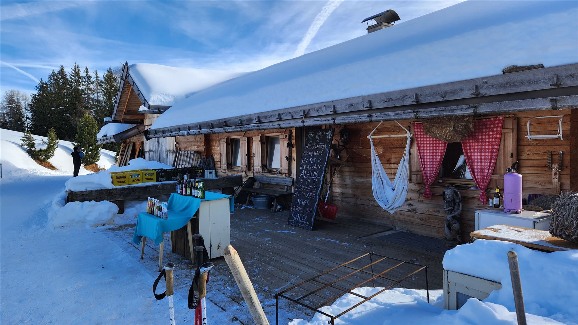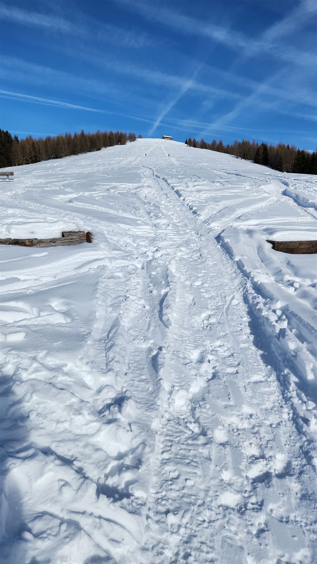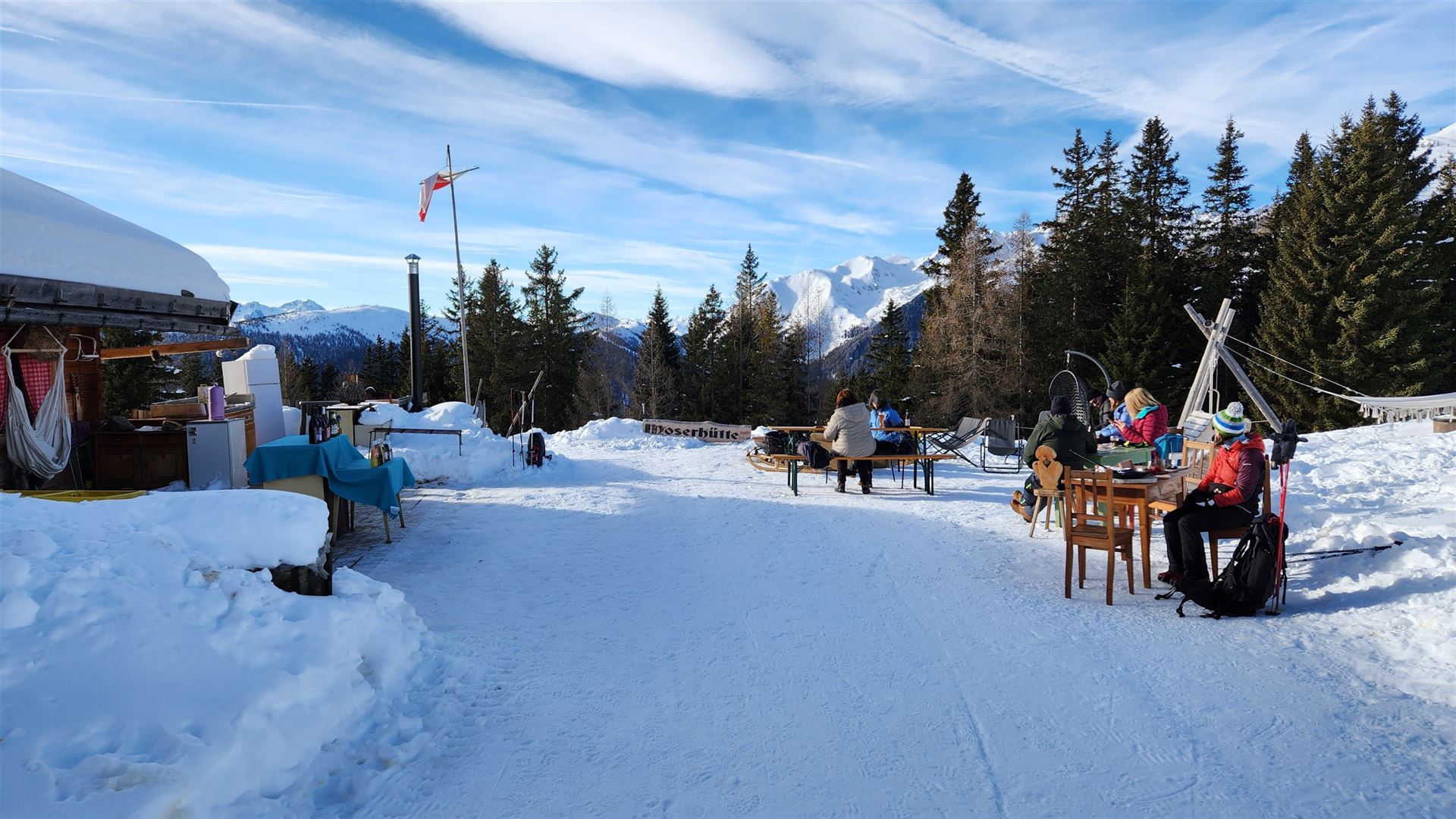 Die Parkgebühr beträgt 5 Euro und wir wählten den Fußweg Richtung Altfasstal, entschieden uns dann für die Moserhütte, die allerdings nicht durchgehend ausgeschildert war. Nach 500 Metern an der Abzweigung hielten wir uns rechts bergauf. Der schneebedeckte Forstweg zog sich über insgesamt 3 Kilometer moderat nach oben, so dass es wenig anstrengend war. Dann folgte eine scharfe Rechtskurve, der weitere Weg ins Altfasstal war wegen Lawinengefahr ohnehin gesperrt. Bis zur Moserhütte mussten jetzt nur noch 700 Meter bewältigt werden.