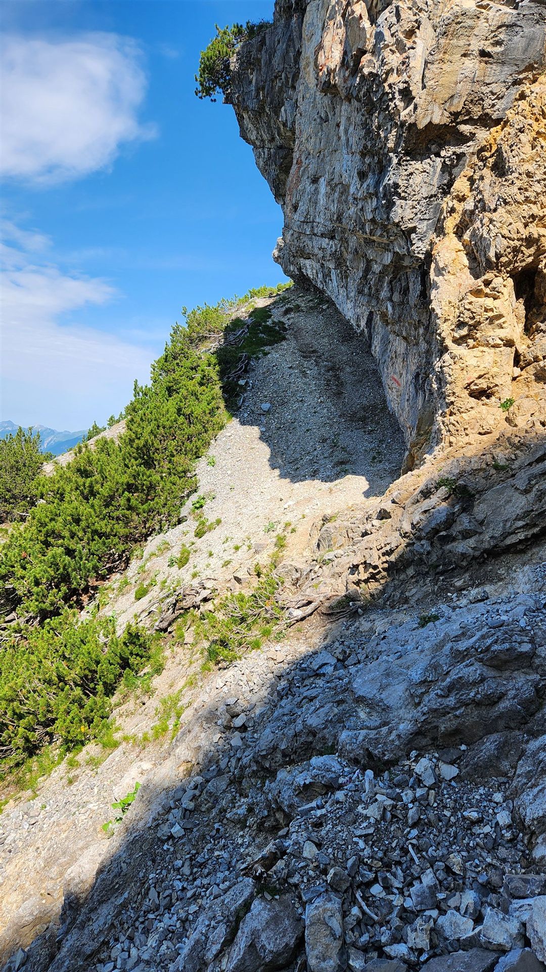 Nach gut einer Stunde erreichte ich die Abzweigung am Alpenrosensteig. Nach rechts führt der Normalweg auf die Kohlbergspitze. Nach links führt der Steig über den Zingerstein (in Karten zum Teil Zigerstein geschrieben) auf den Gipfel. „Nur für Geübte“, heißt es dort. Und das war diesmal wirklich so zu verstehen. Tatsächlich wies der Alpenrosensteig einige leicht ausgesetzte Stellen auf. Bei Nässe wäre das gar nichts gewesen. Zum Glück war alles trocken. Aber der Weg war teilweise nicht ganz einfach zu finden. An einer Lichtung wusste ich kurz nicht weiter und dachte schon, ich müsse umkehren. Eindeutig wird dieser Teil des Alpenrosensteigs nicht so oft begangen, denn der Weg war weniger ausgetreten als übliche Bergwege. Eine gewisse Steinschlaggefahr ist nicht zu verkennen.