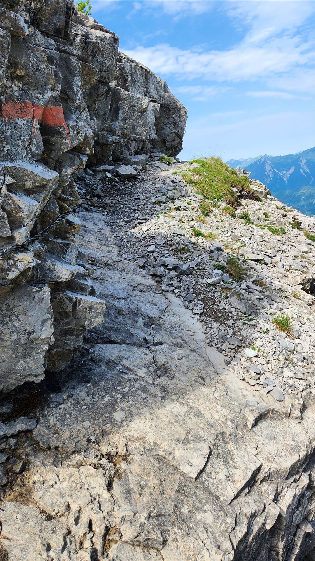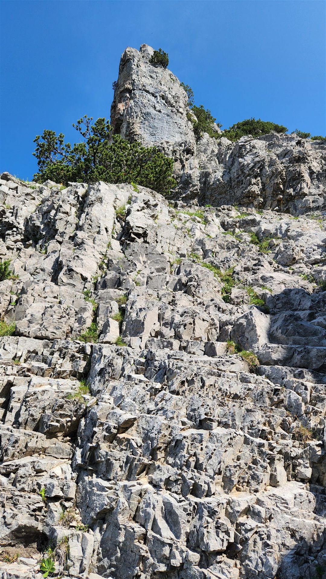 Der Zingerstein ragt als Felsnadel heraus. Ich erreichte die Scharte vor dem Schlussanstieg nach etwa 2¼ Stunden. Die letzten Meter auf den Felsturm sind mit Ketten gesichert. Von Zingerstein auf 1975 m blickt man auf den Anstieg zur Kohlbergspitze, also auf die letzten 227 Höhenmeter.