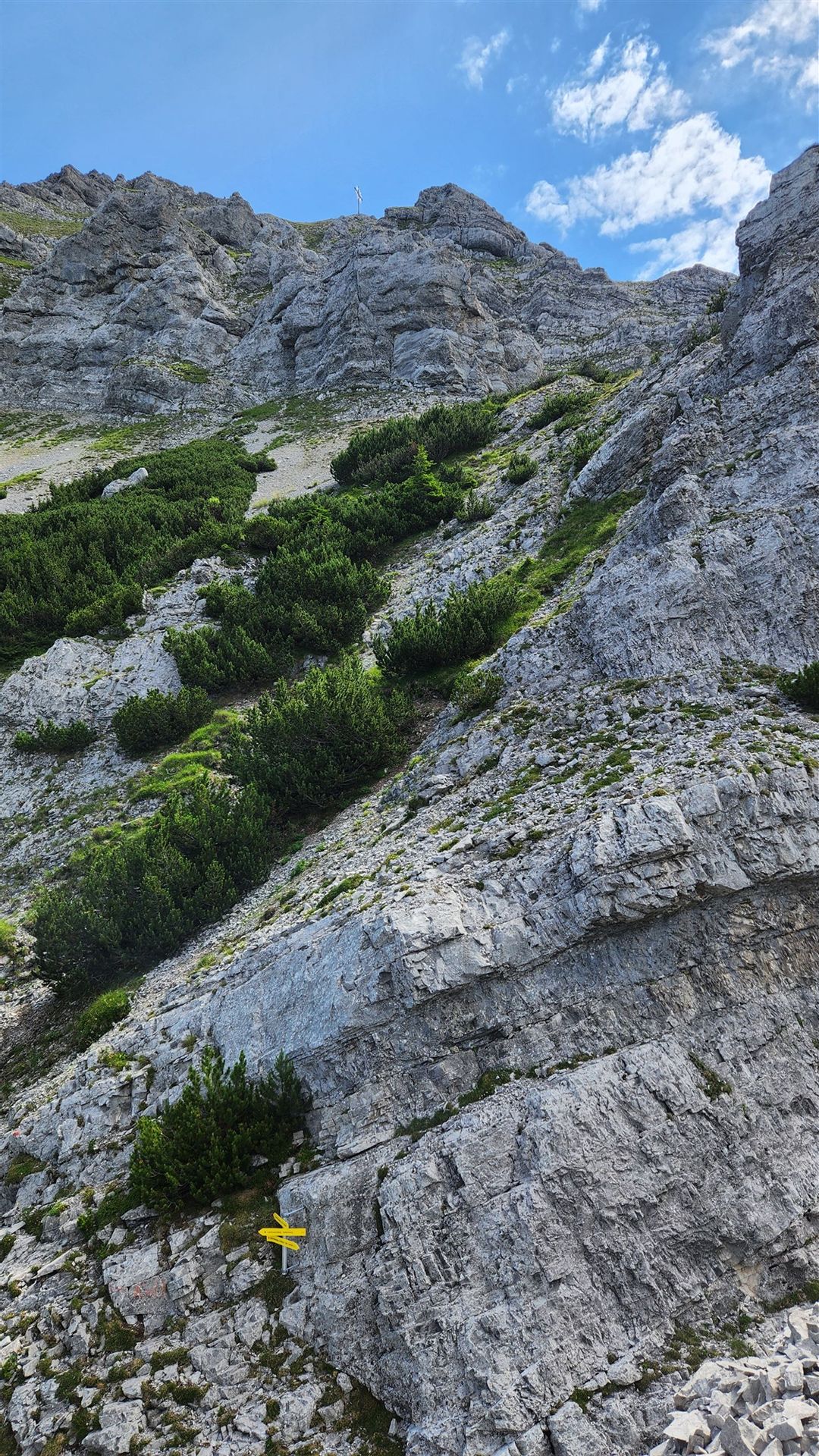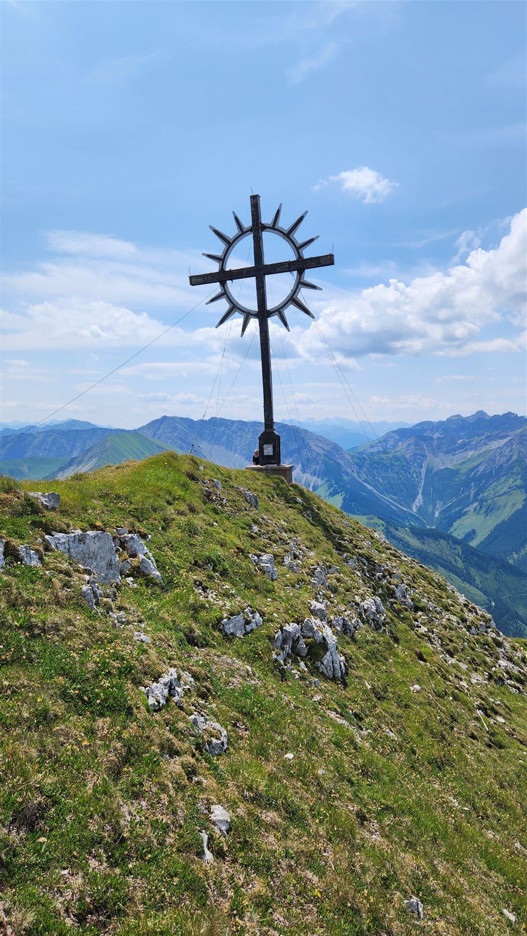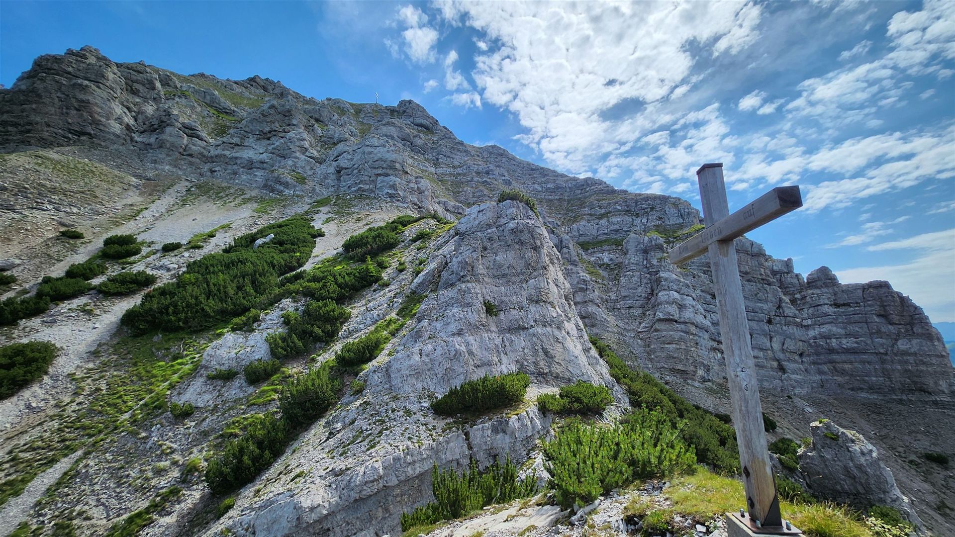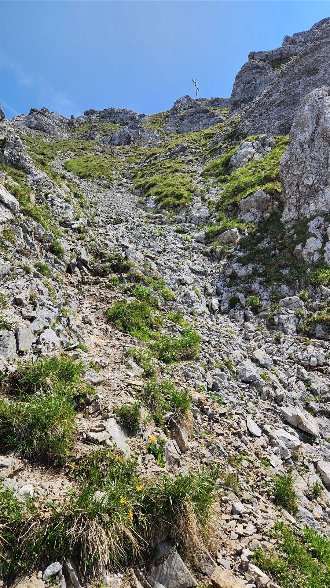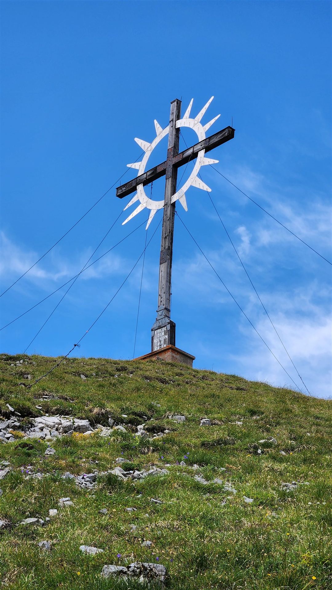 Schließlich erreichte ich das riesige Gipfelkreuz der Kohlbergspitze auf 2202 m. Außer mir war nur ein einziger weiterer Kletterer auf dieser Route unterwegs. Die anderen Wanderer, die auf dem Gipfel angetroffen wurden, sind allesamt über den Normalweg aufgestiegen. Diesen wählte ich dann für den Abstieg.