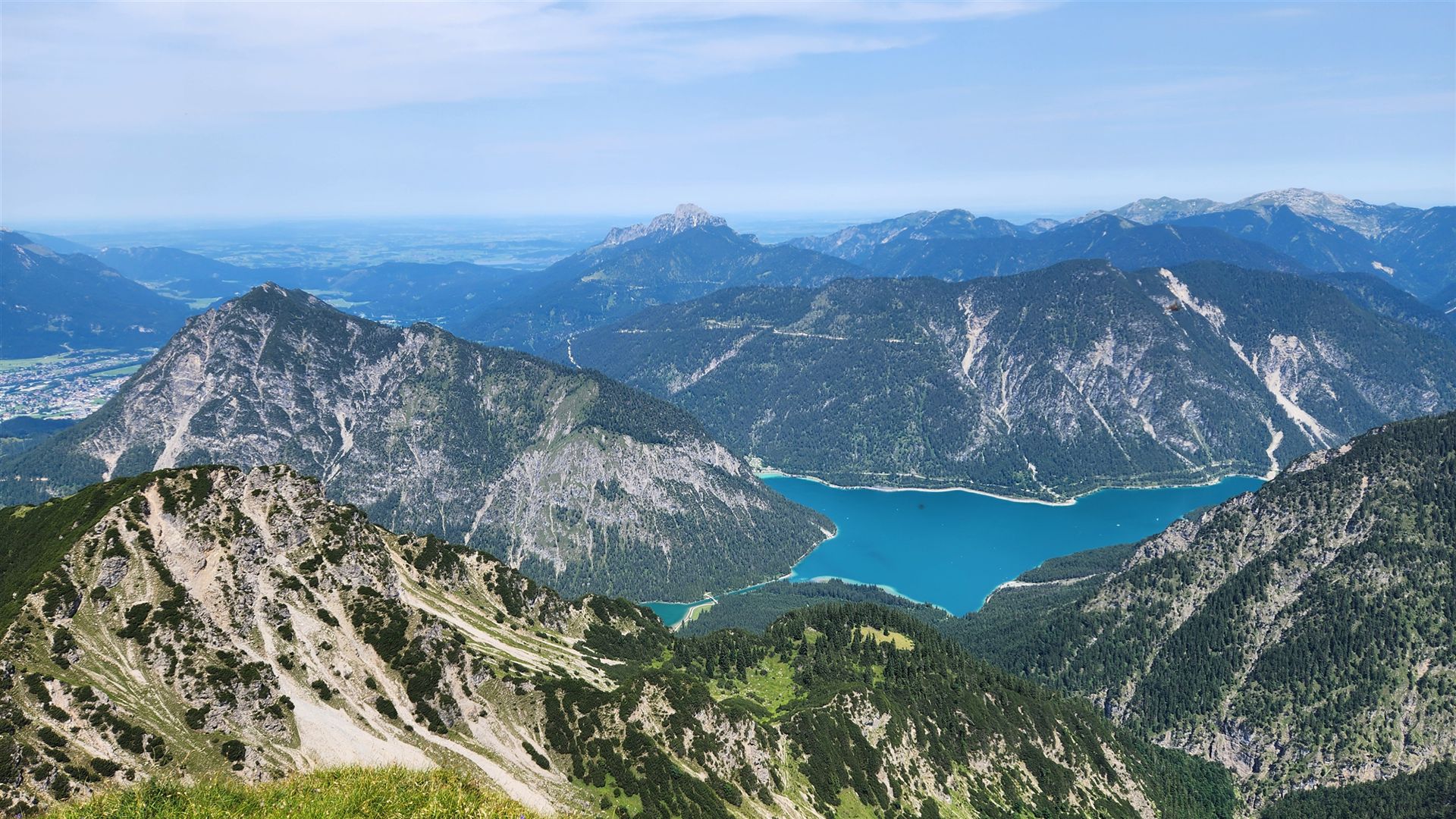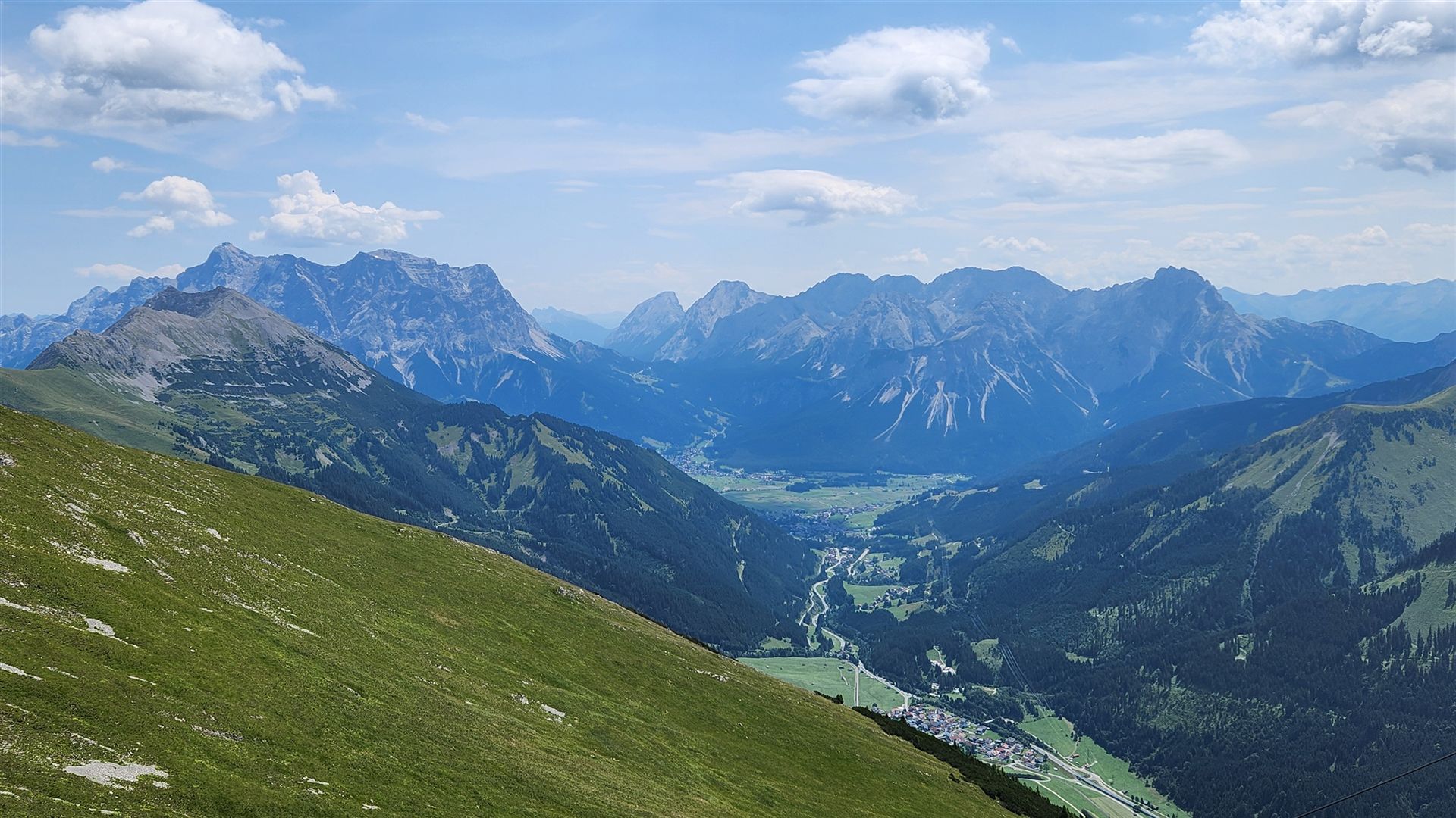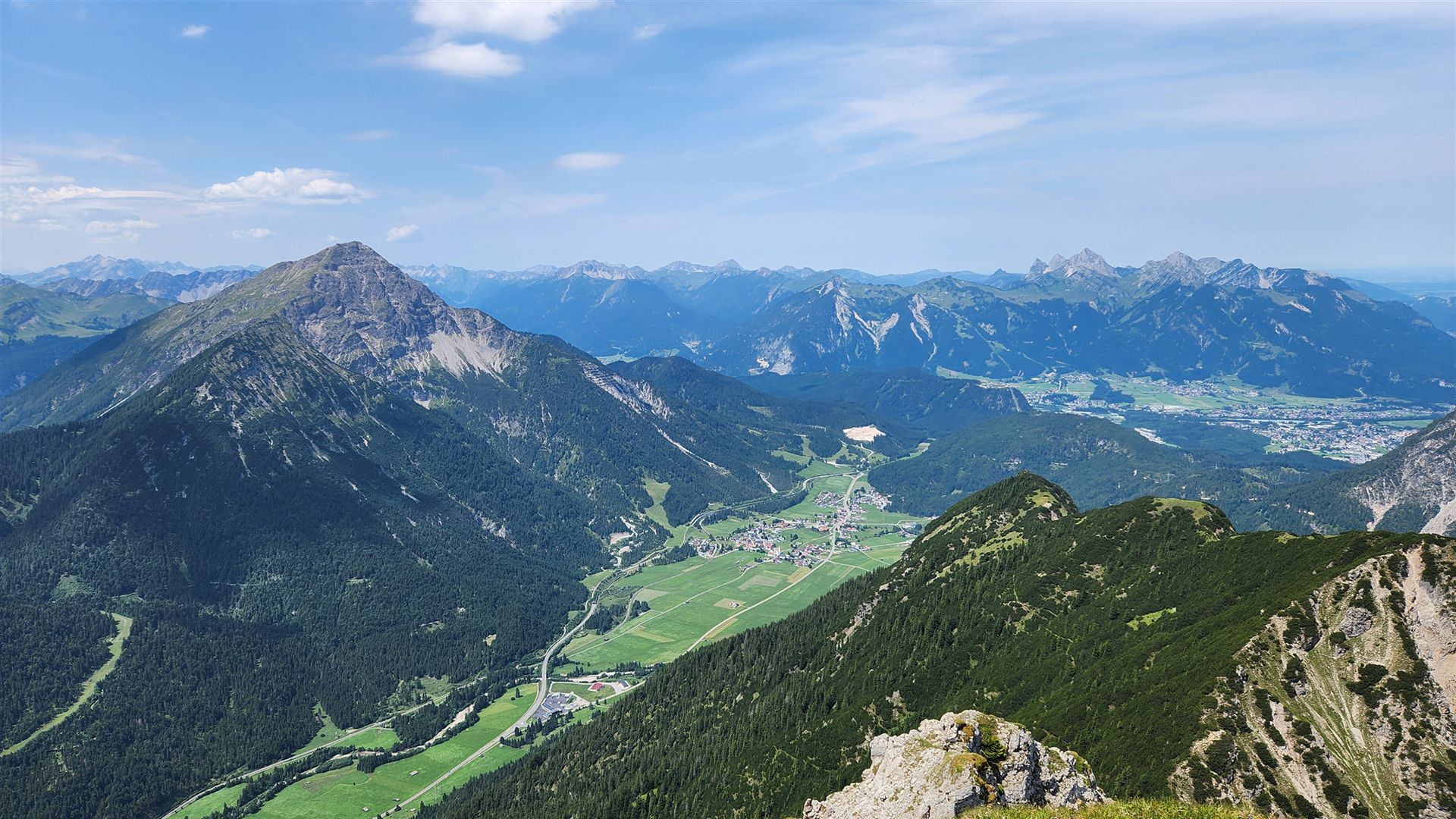 Aber zunächst genoss ich über eine Stunde lang das 360-Grad-Panorama. Denn die Kohlbergspitze hat eine ideale Lage zwischen Zugspitze und Tannheimer Bergen. Im Westen hat man einen ganz besonderen Blick über Upsspitze und Daniel hinweg auf das Zugspitzmassiv mit Schneefernerkopf und Wetterspitzen bis hin zum Plattig und zum Grünstein (Mieminger Kette). Dazwischen liegen Hohe Munde und Ehrwalder Sonnenspitze. Die nahe Kante zur Hochschrutte mit dem schräg abfallenden Wiesengelände erinnert an die prominente Seceda in den Dolomiten.