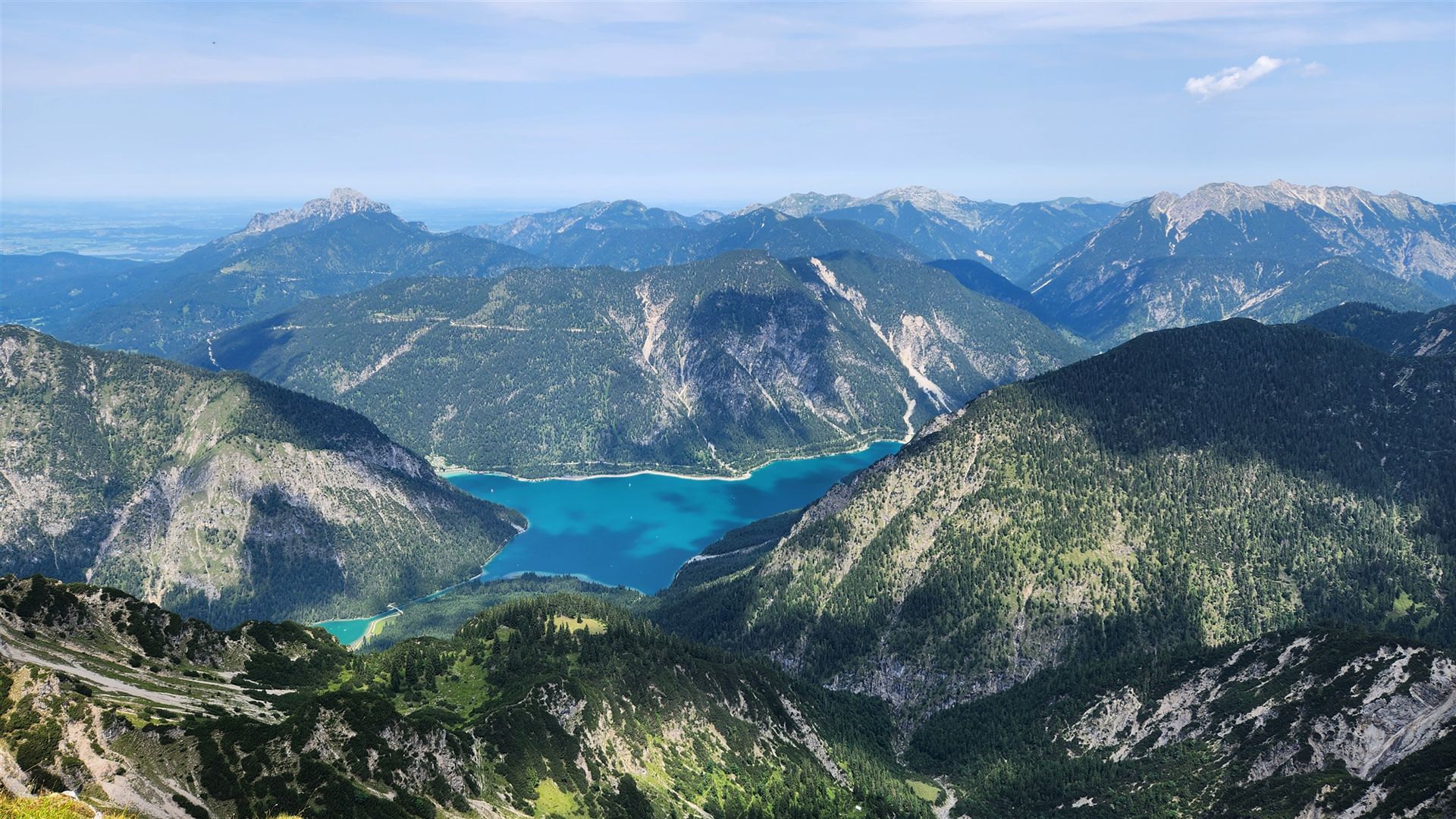In den Ammergauer Alpen sind der Säuling hinter dem Plansee, die Hochplatte, die Große Klammspitze und die Geierköpfe zu sehen. Die Kreuzspitze ragt deutlich heraus. Danach folgen Schellschlicht und Notkarspitze. Im Osten liegen Benediktenwand, Heimgarten, Kramerspitze und Krottenkopf.