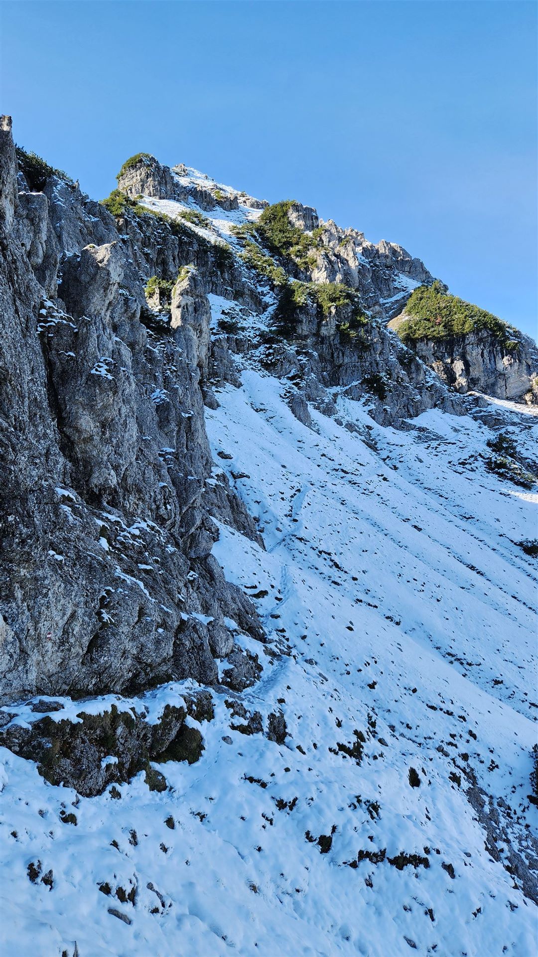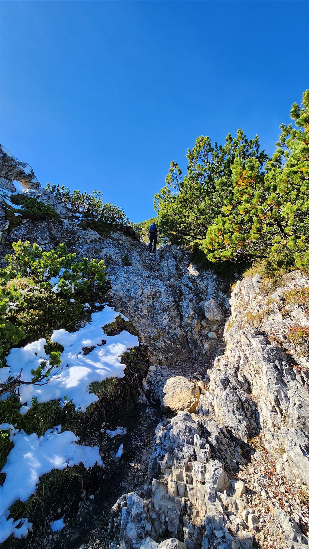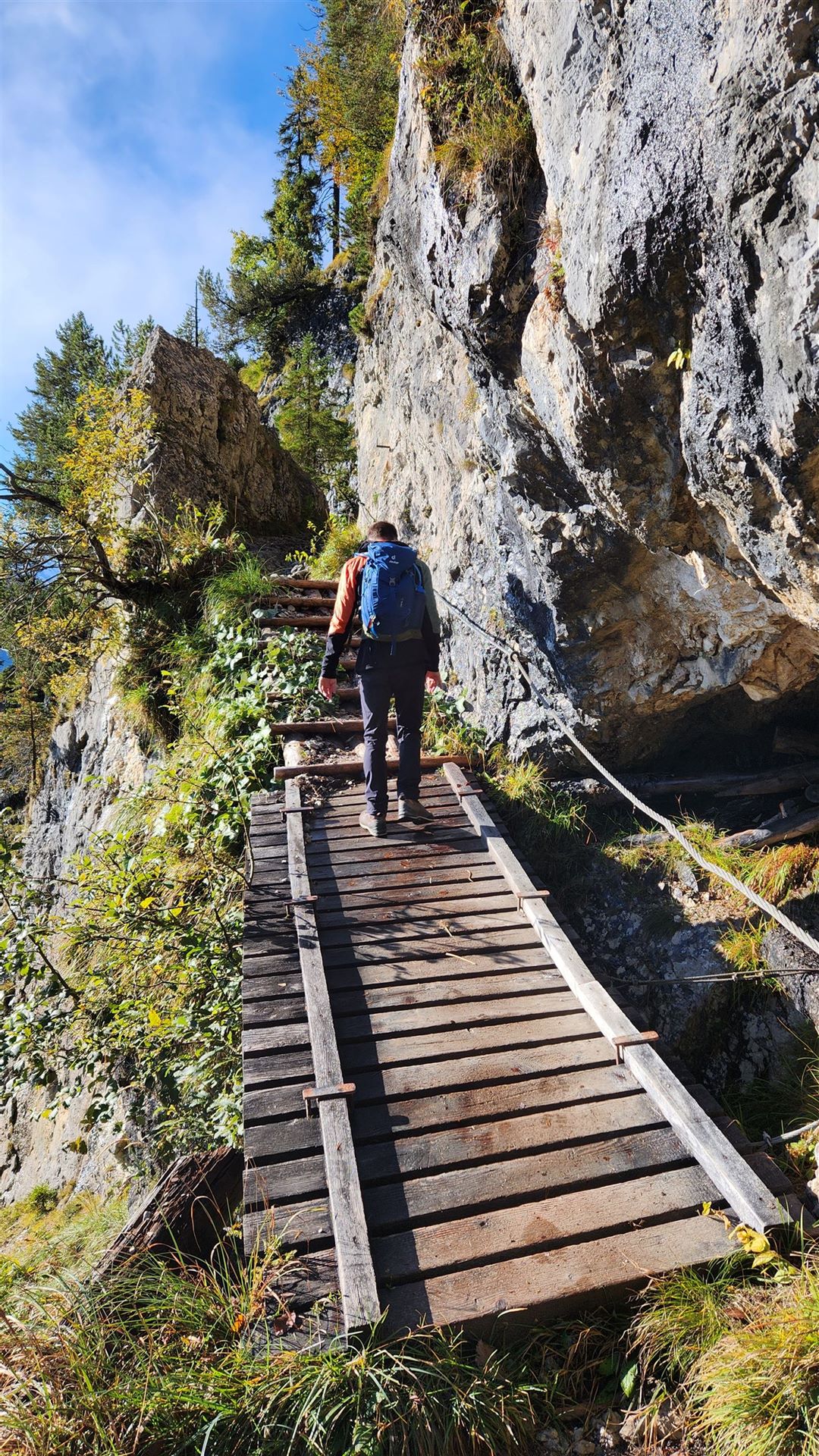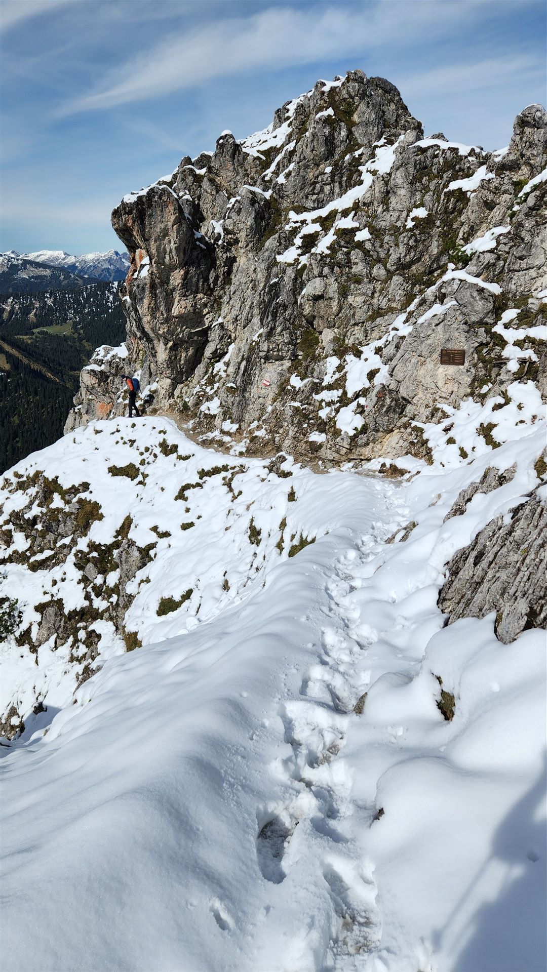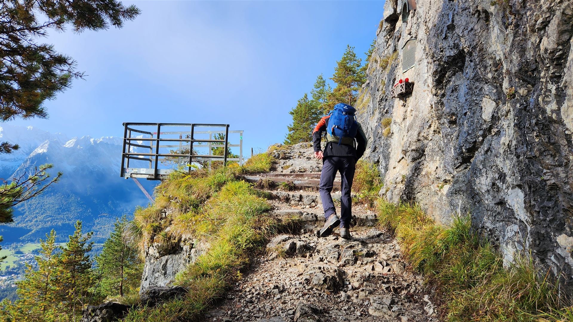Einmal muss man aufpassen und links abbiegen, sonst landet man am Königsstand. Spannend ist danach die Felsenkanzel auf 1238 m, eine eiserne Plattform über dem Abgrund. Der Steig ist kurz seilversichert.