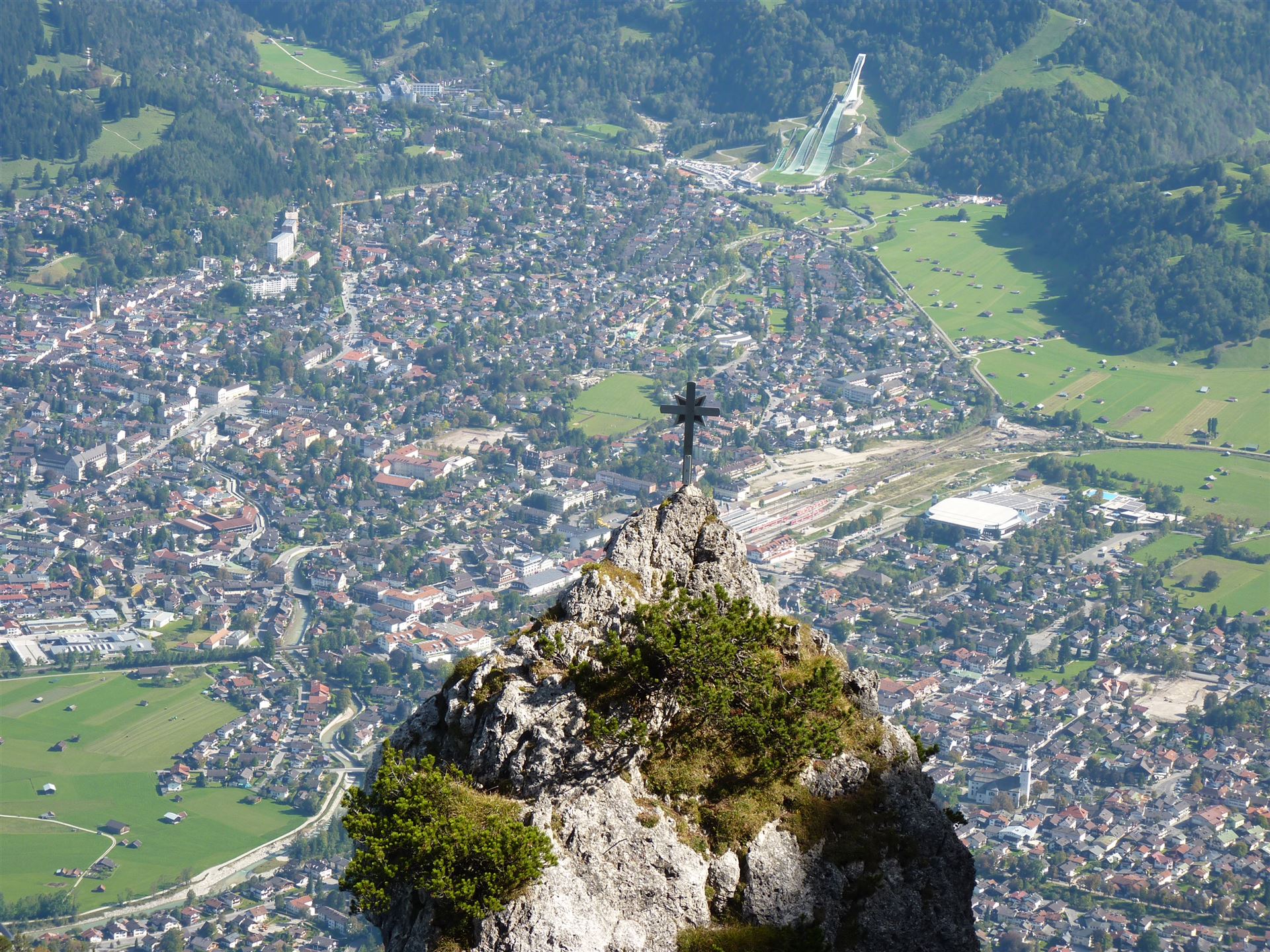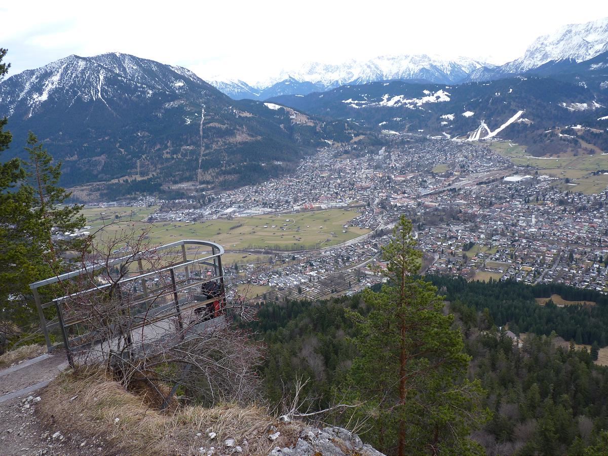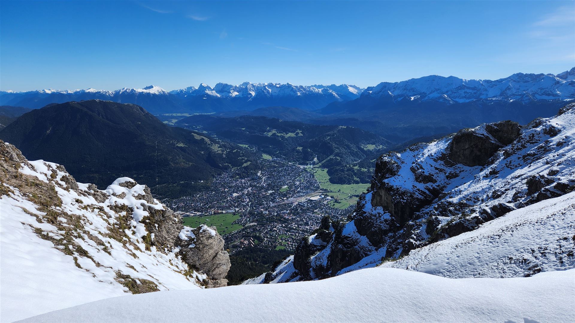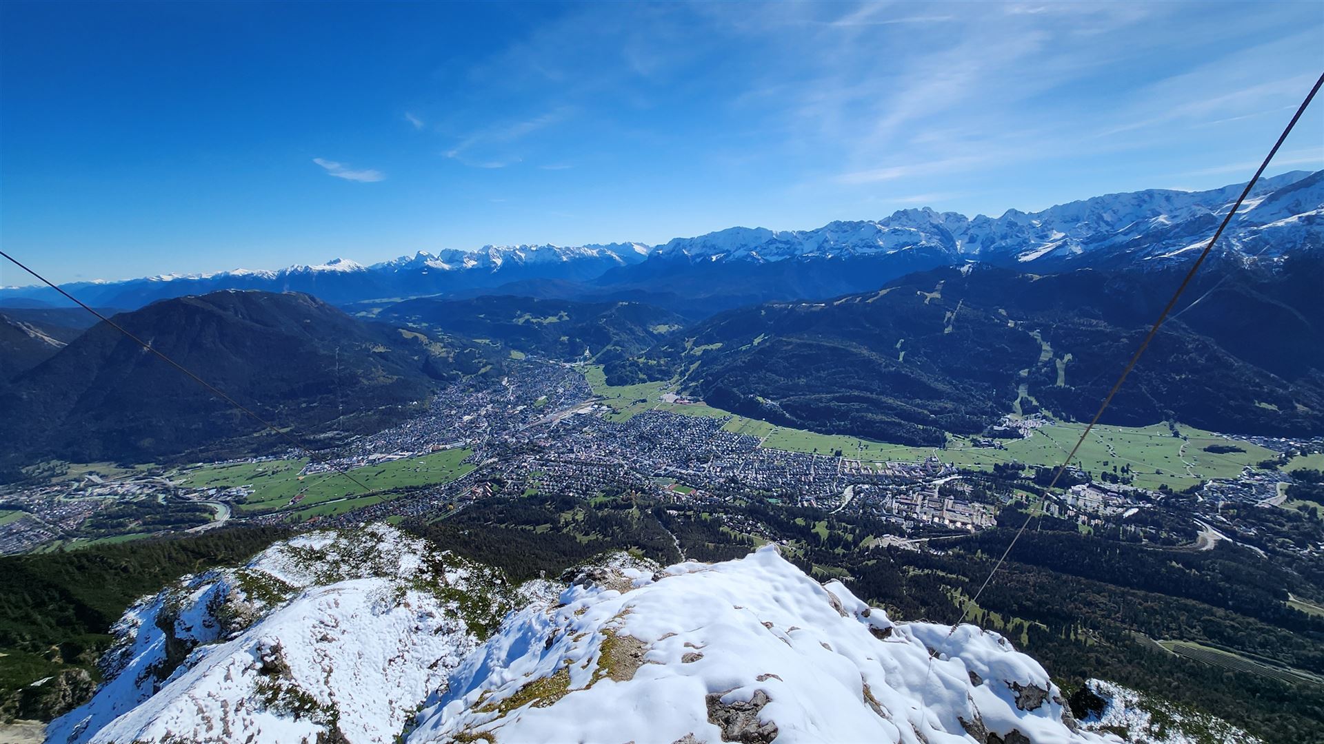 Vom Gipfel der Kramerspitz blickt man fast senkrecht hinunter auf Garmisch-Partenkirchen. Man hat das Gefühl, über dem Ort zu schweben. Gegenüber breitet sich das gesamte Panorama vom Estergebirge über das Karwendel und die Wettersteinwand zur Alpspitze und über den Jubiläumsgrad bis zur Zugspitze aus. Im Westen reicht der Blick bis zum Hochvogel und im Norden auf die Ammergauer Alpen mit Geierköpfen, Kreuzspitze, Hochplatte, Kienjoch, Vorderer Felderkopf, Brünstelkopf und Notkarspitze. Unten führt der Forstweg zur Enningalm, eine beliebte Mountainbike-Tour, die ich auch schon gemacht habe.