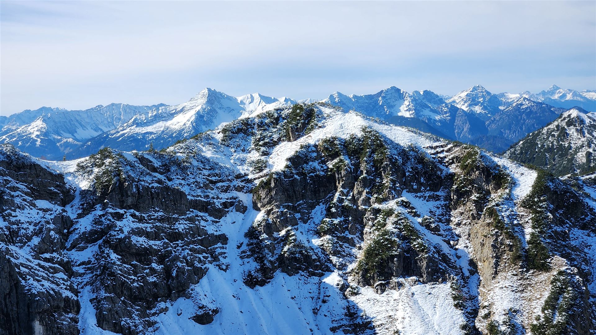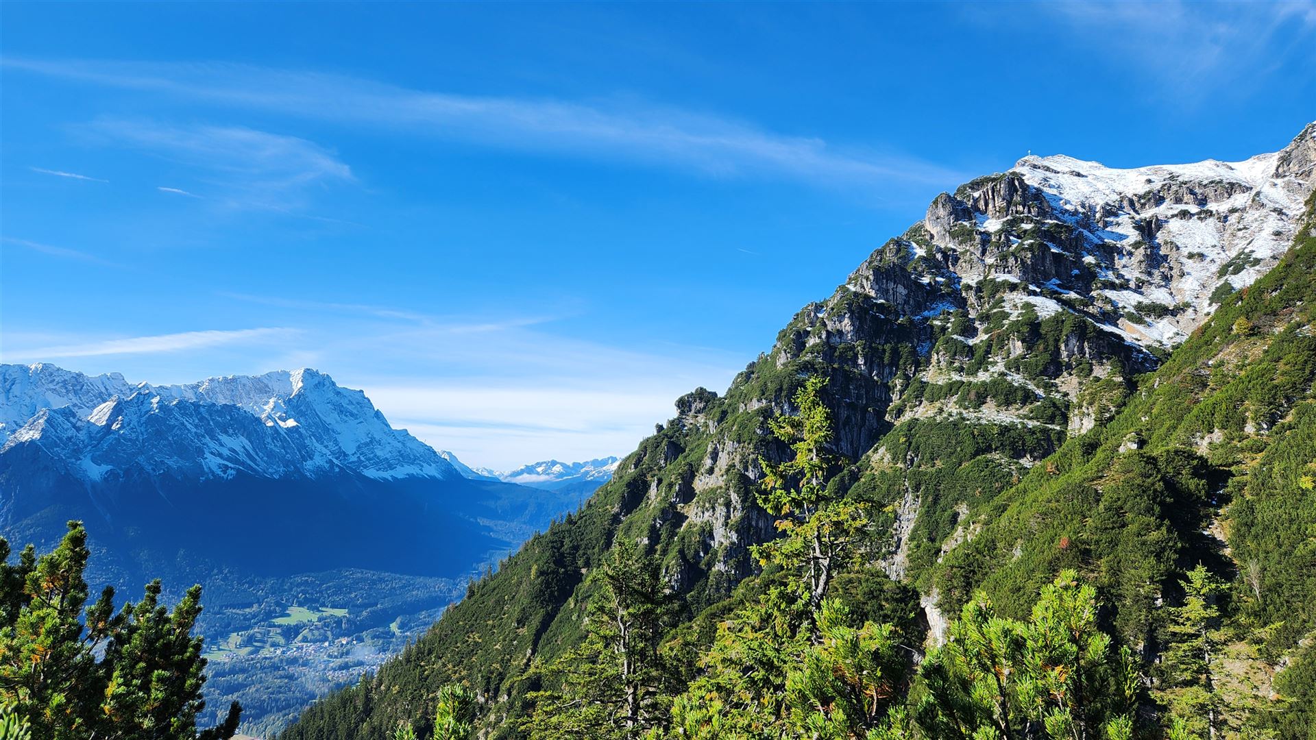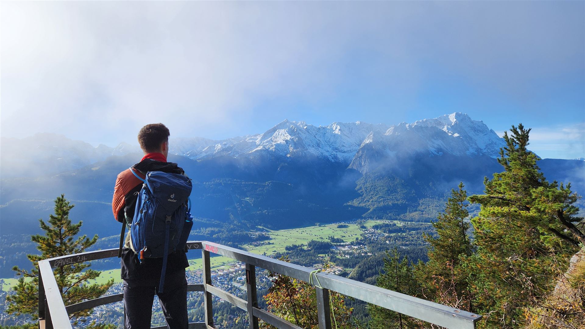 Vom Gipfel der Kramerspitz blickt man fast senkrecht hinunter auf Garmisch-Partenkirchen. Man hat das Gefühl, über dem Ort zu schweben. Gegenüber breitet sich das gesamte Panorama vom Estergebirge über das Karwendel und die Wettersteinwand zur Alpspitze und über den Jubiläumsgrad bis zur Zugspitze aus. Im Westen reicht der Blick bis zum Hochvogel und im Norden auf die Ammergauer Alpen mit Geierköpfen, Kreuzspitze, Hochplatte, Kienjoch, Vorderer Felderkopf, Brünstelkopf und Notkarspitze. Unten führt der Forstweg zur Enningalm, eine beliebte Mountainbike-Tour, die ich auch schon gemacht habe.