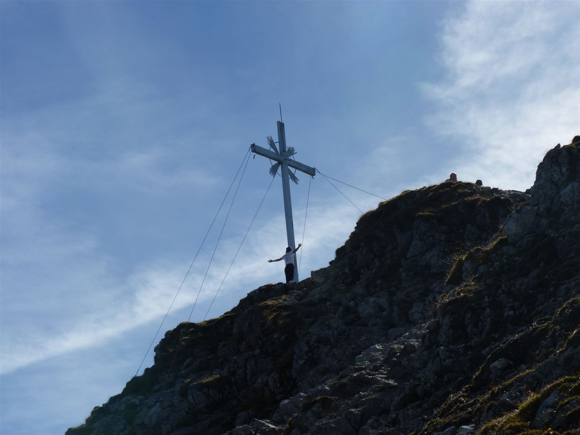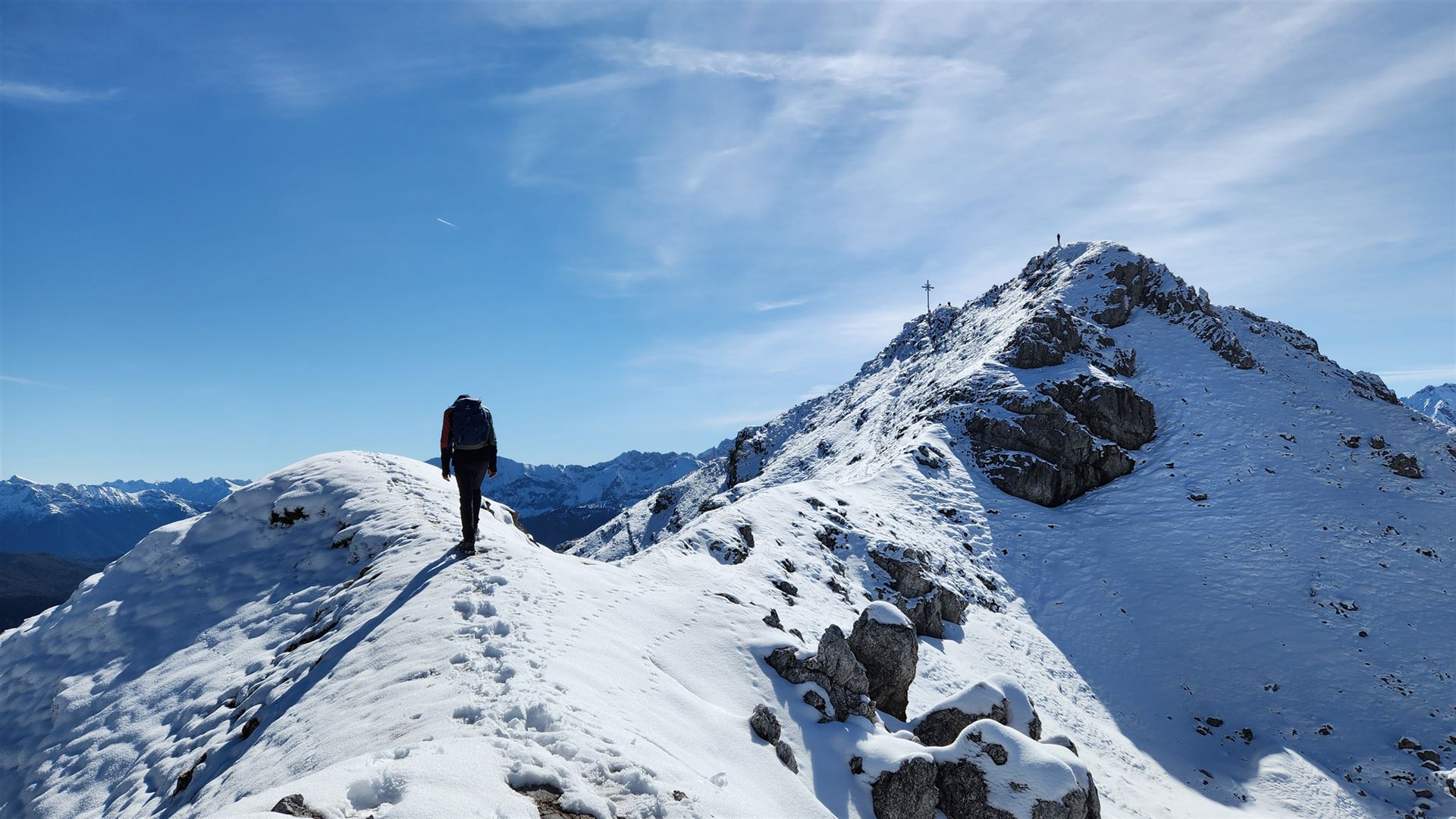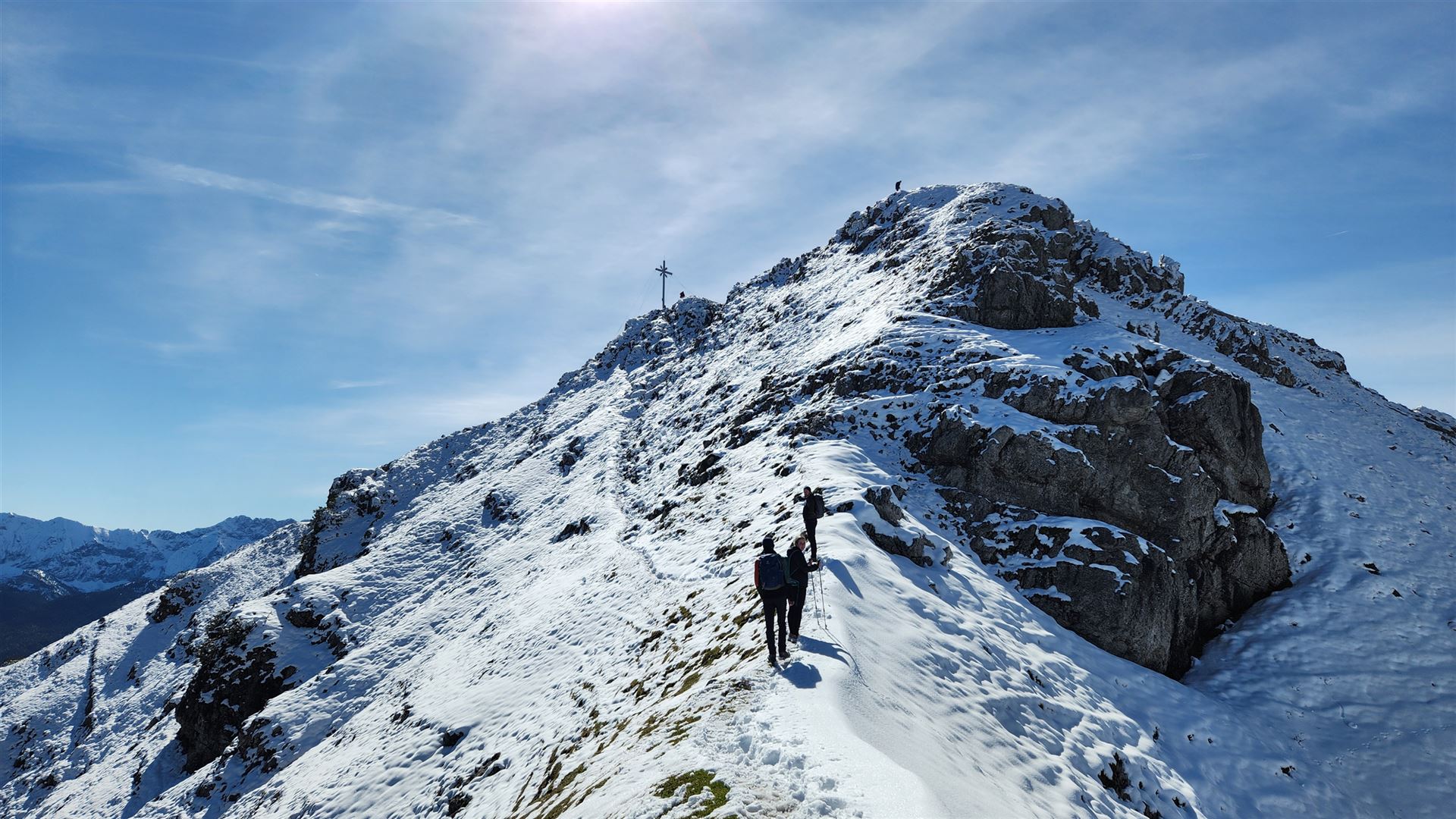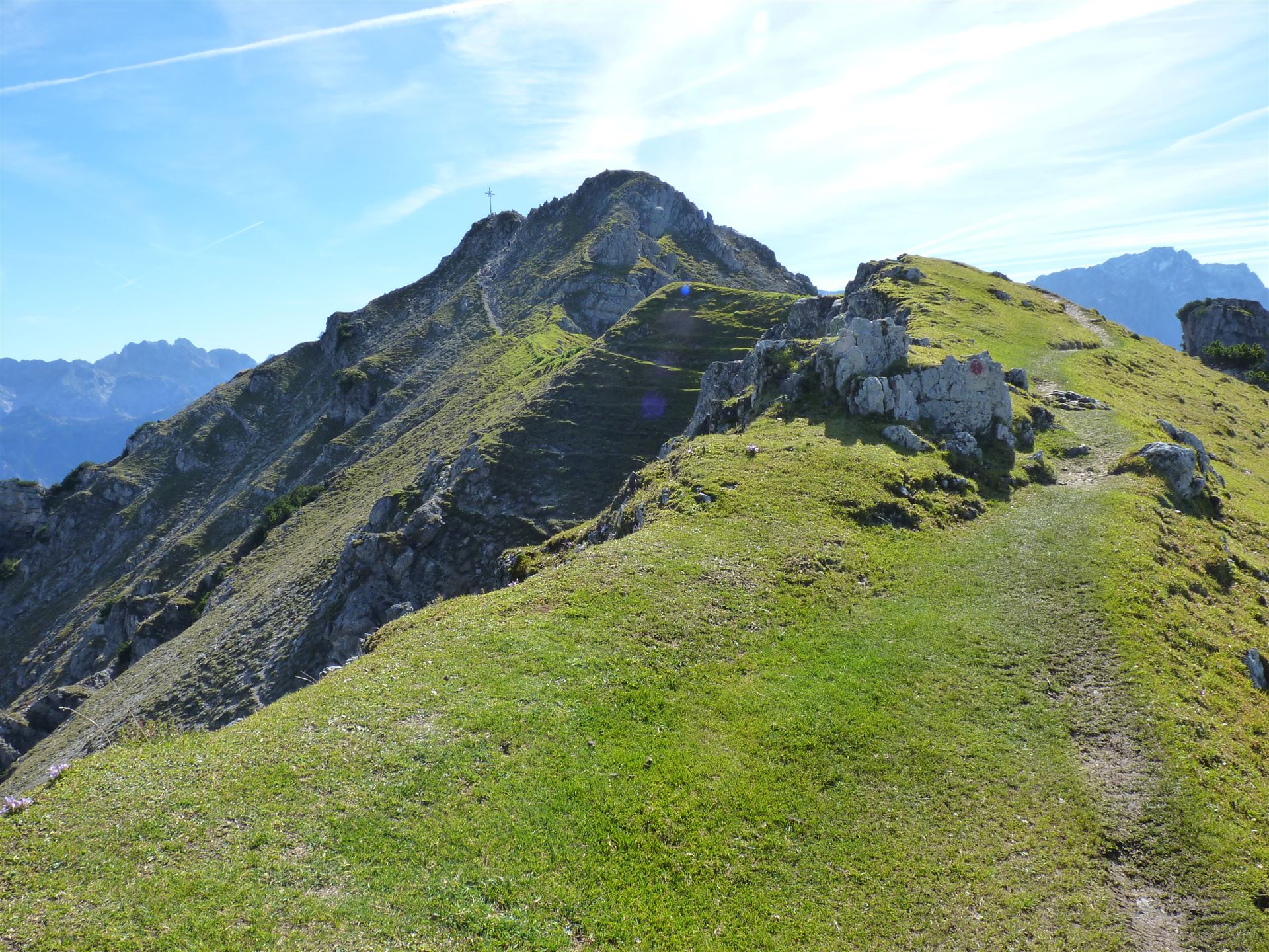 Schließlich führt der Weg über den Grat, der den Katzenkopf mit der Kramerspitze verbindet, mit etwas Kraxelei zum Gipfel. Ein kurzer Abschnitt ist drahtseilversichert. Ein Stichpfad zweigt zum Mittergern (1834 m) ab, den ebenfalls ein Gipfelkreuz ziert. Wer möchte, kann auch einen Abstecher zum Katzenkopf (1817 m) unternehmen. Die markante Felsnadel am Grat mit ihrem Kreuz ist allerdings nur zum Anschauen.