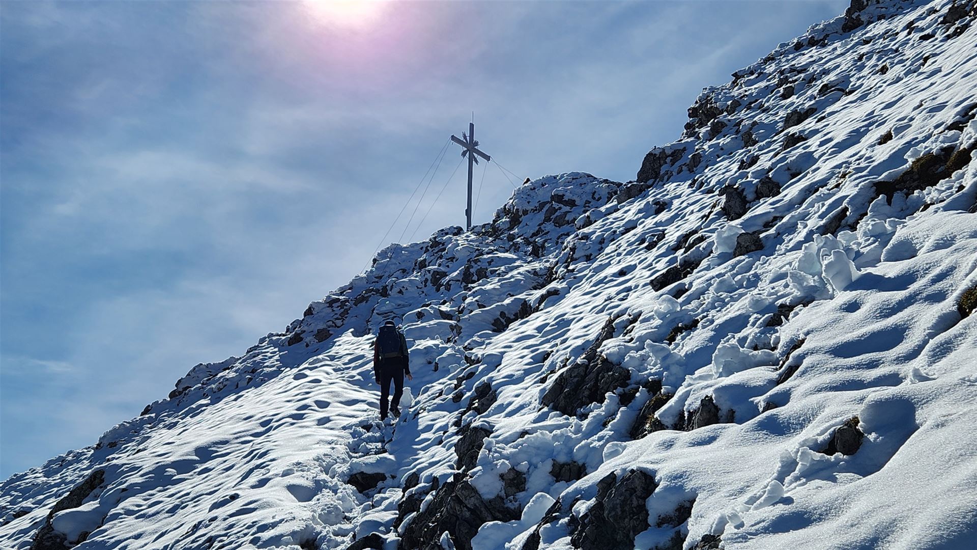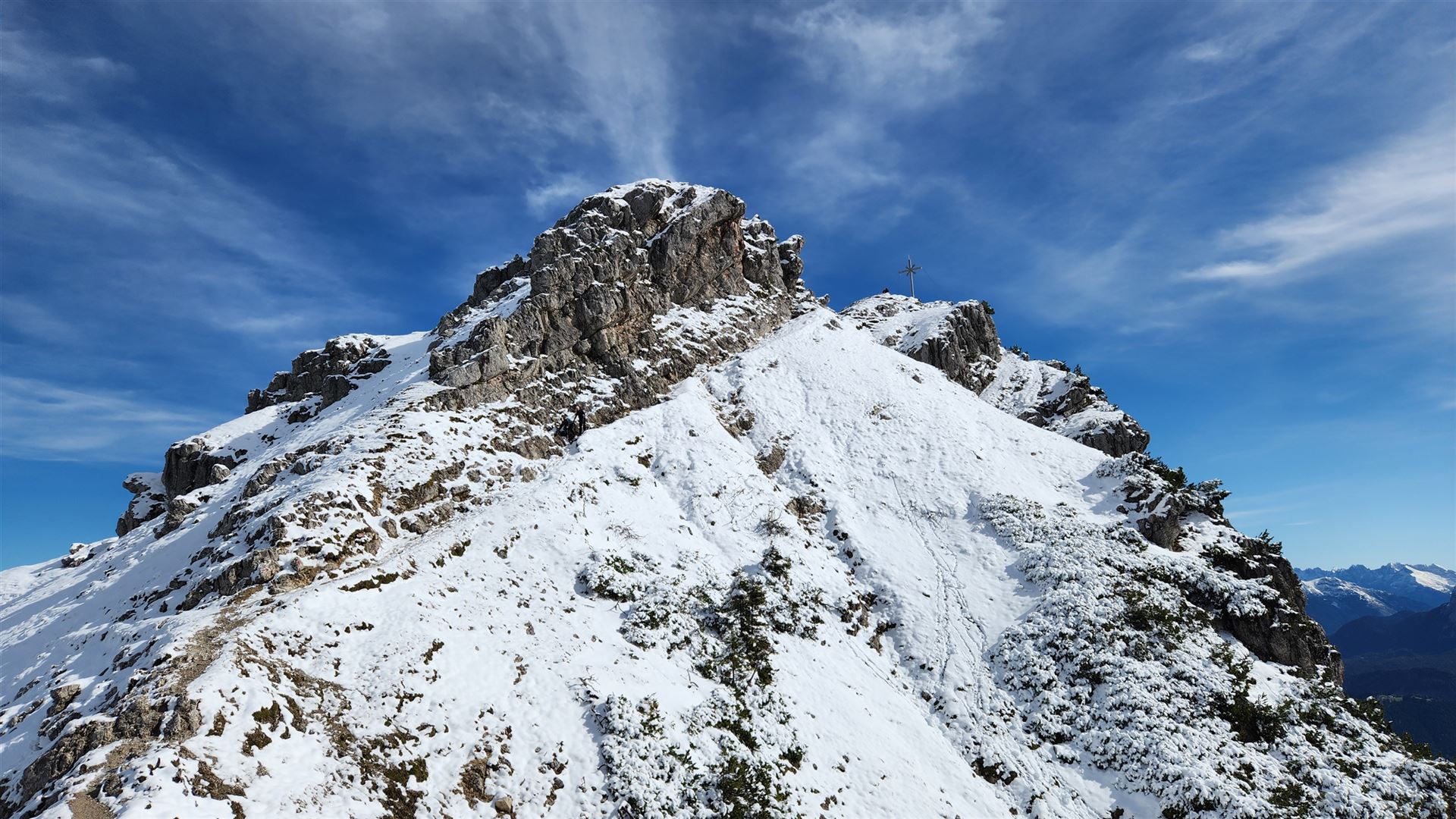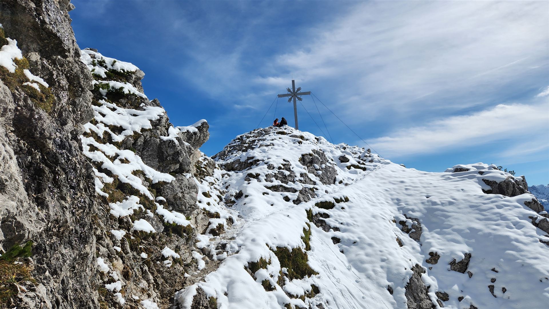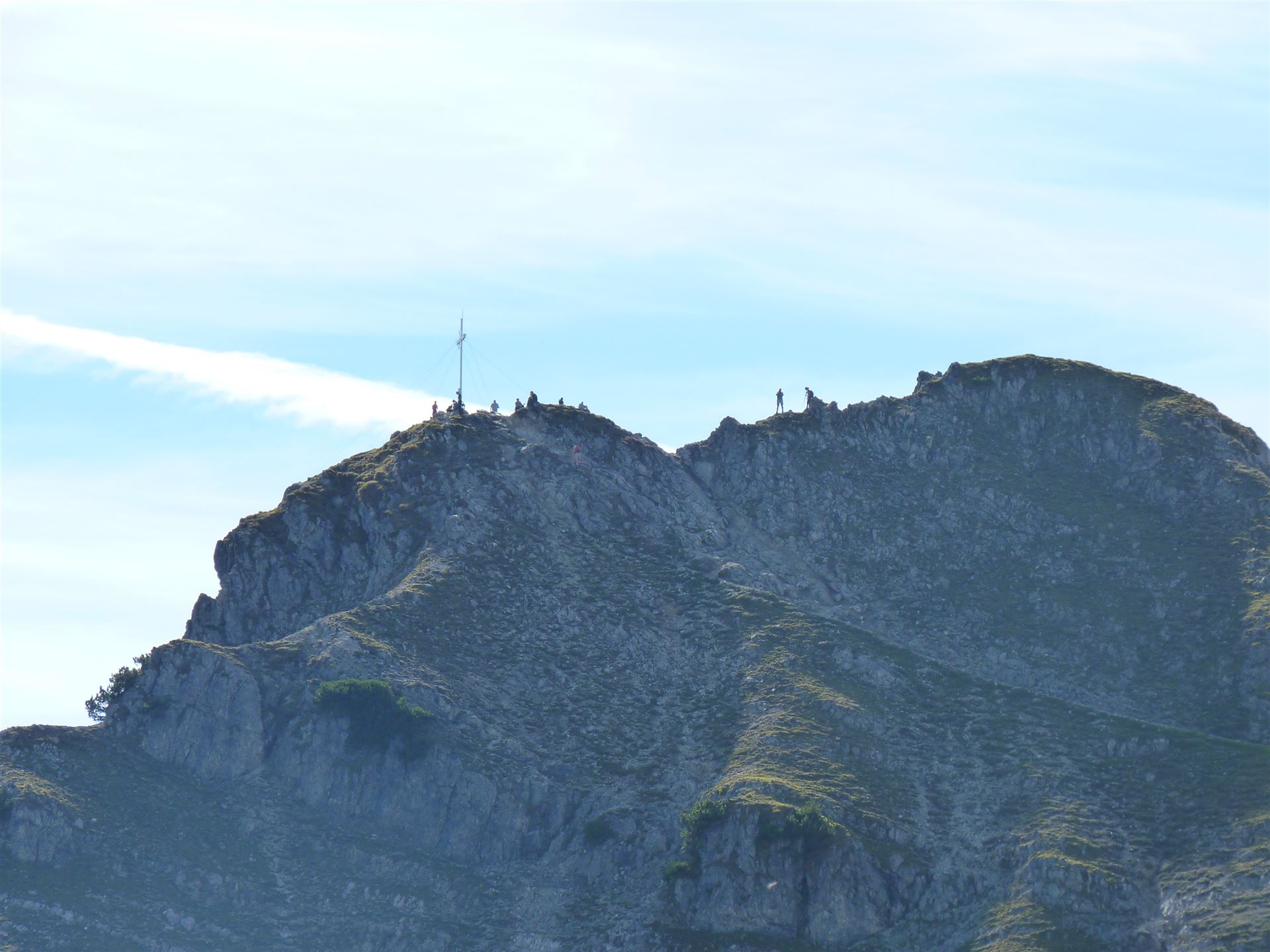 Schließlich führt der Weg über den Grat, der den Katzenkopf mit der Kramerspitze verbindet, mit etwas Kraxelei zum Gipfel. Ein kurzer Abschnitt ist drahtseilversichert. Ein Stichpfad zweigt zum Mittergern (1834 m) ab, den ebenfalls ein Gipfelkreuz ziert. Wer möchte, kann auch einen Abstecher zum Katzenkopf (1817 m) unternehmen. Die markante Felsnadel am Grat mit ihrem Kreuz ist allerdings nur zum Anschauen.