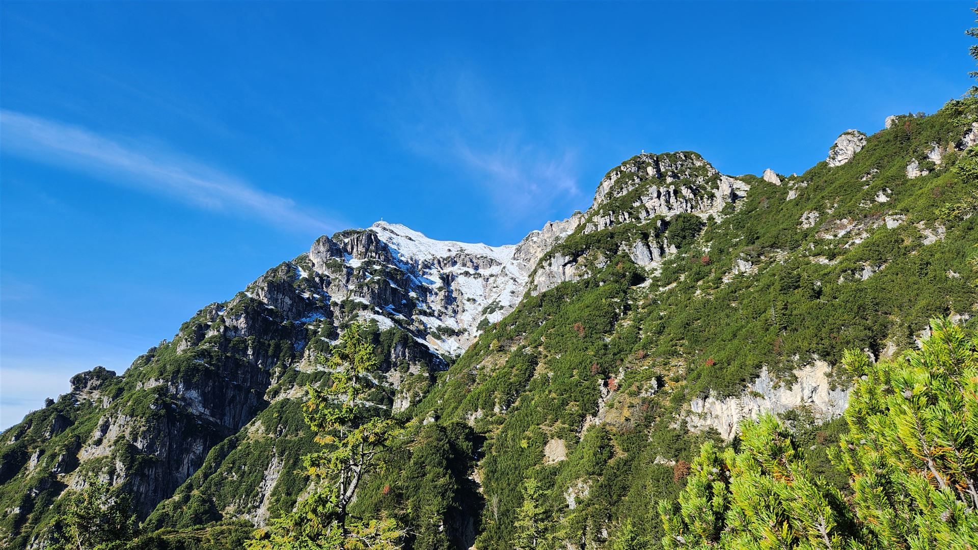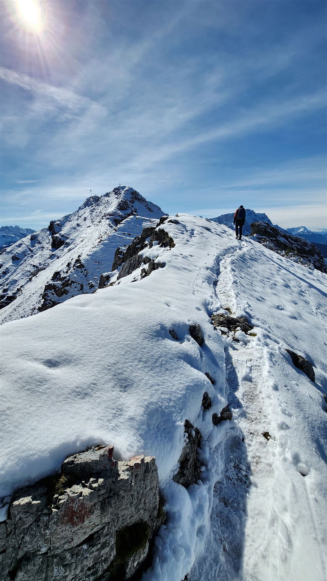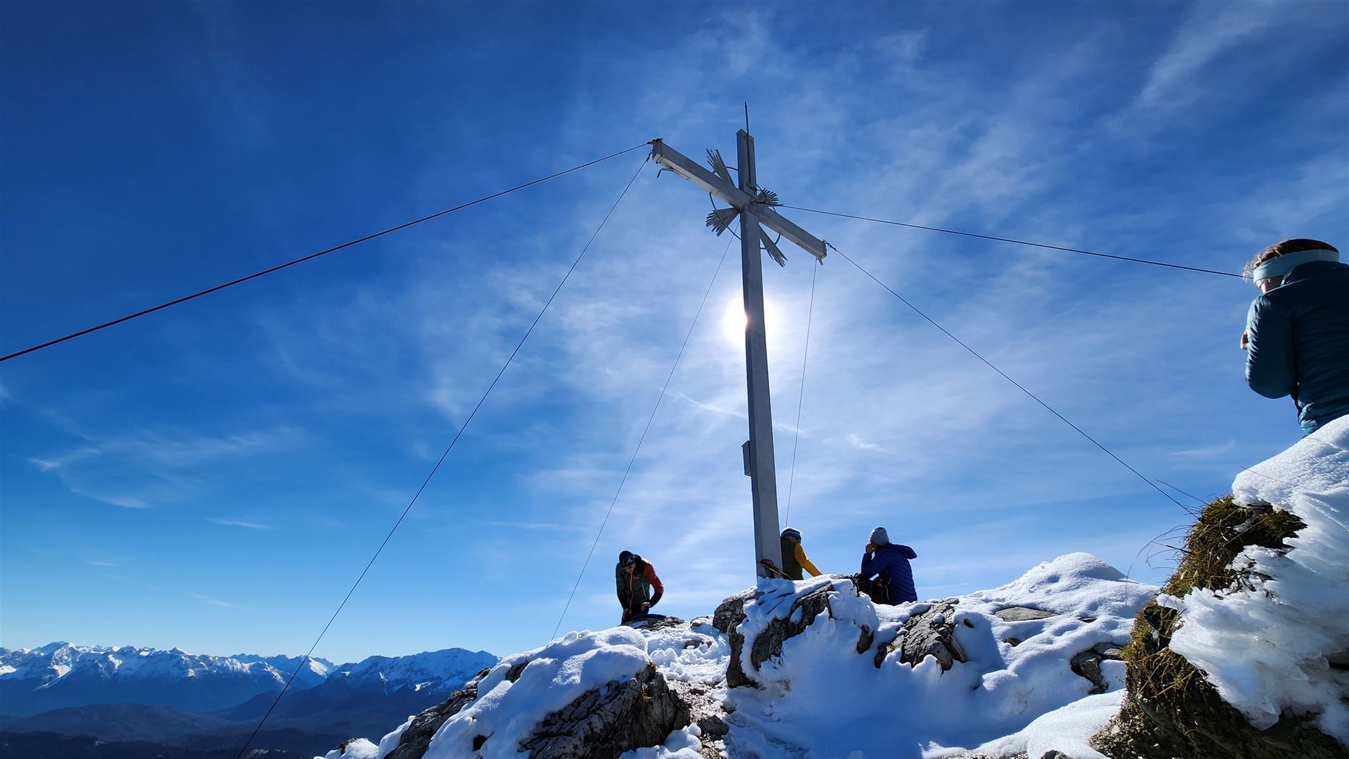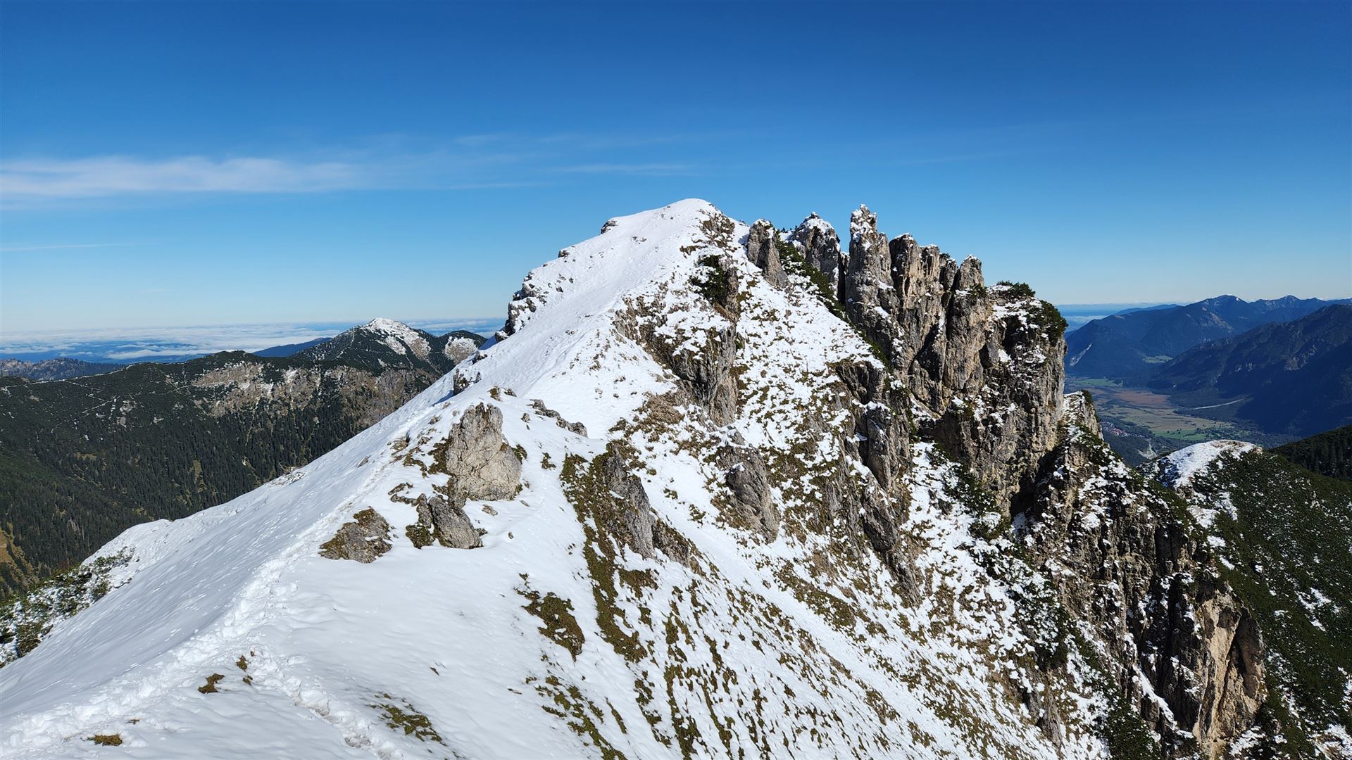 Schließlich führt der Weg über den Grat, der den Katzenkopf mit der Kramerspitze verbindet, mit etwas Kraxelei zum Gipfel. Ein kurzer Abschnitt ist drahtseilversichert. Ein Stichpfad zweigt zum Mittergern (1834 m) ab, den ebenfalls ein Gipfelkreuz ziert. Wer möchte, kann auch einen Abstecher zum Katzenkopf (1817 m) unternehmen. Die markante Felsnadel am Grat mit ihrem Kreuz ist allerdings nur zum Anschauen.