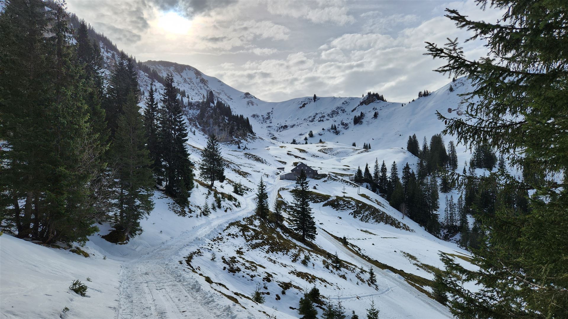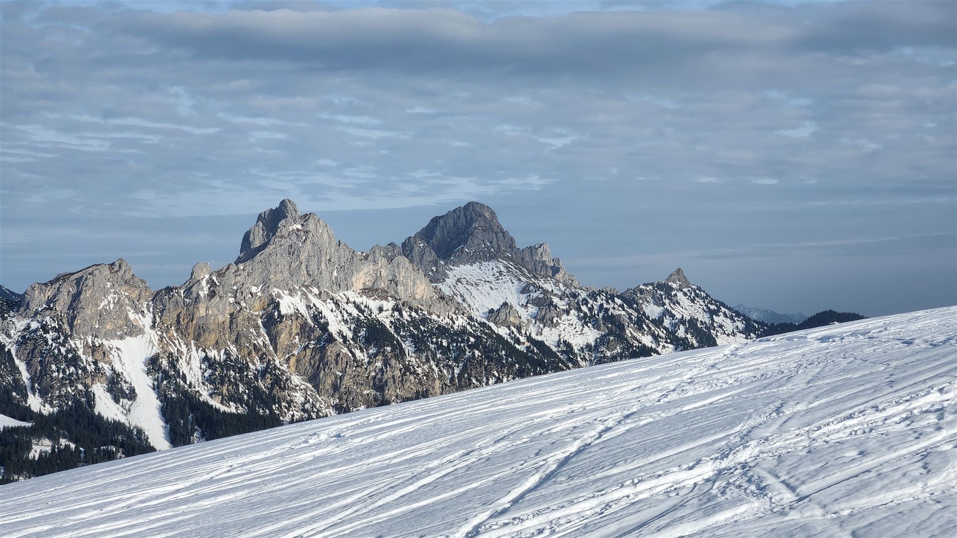 Es lag schon einiges an Schnee, das Skigebiet hatte aber noch geschlossen. Und so begegneten wir den ganzen Tag über nur einer Skitourengeherin und zwei Schneeschuhwanderern. Im Sommer herrscht am Neunerköpfle mit Sicherheit eine Völkerwanderung.