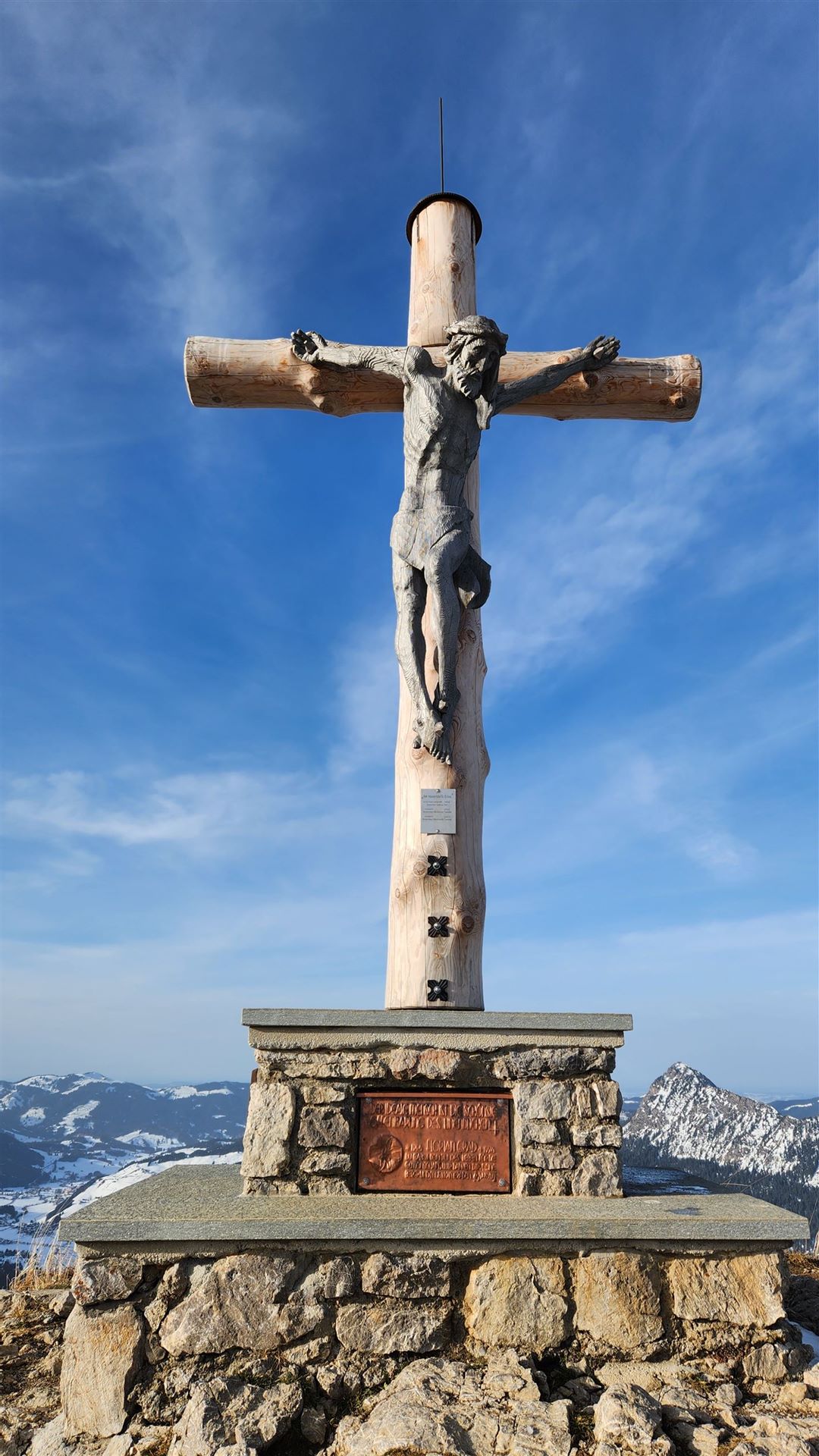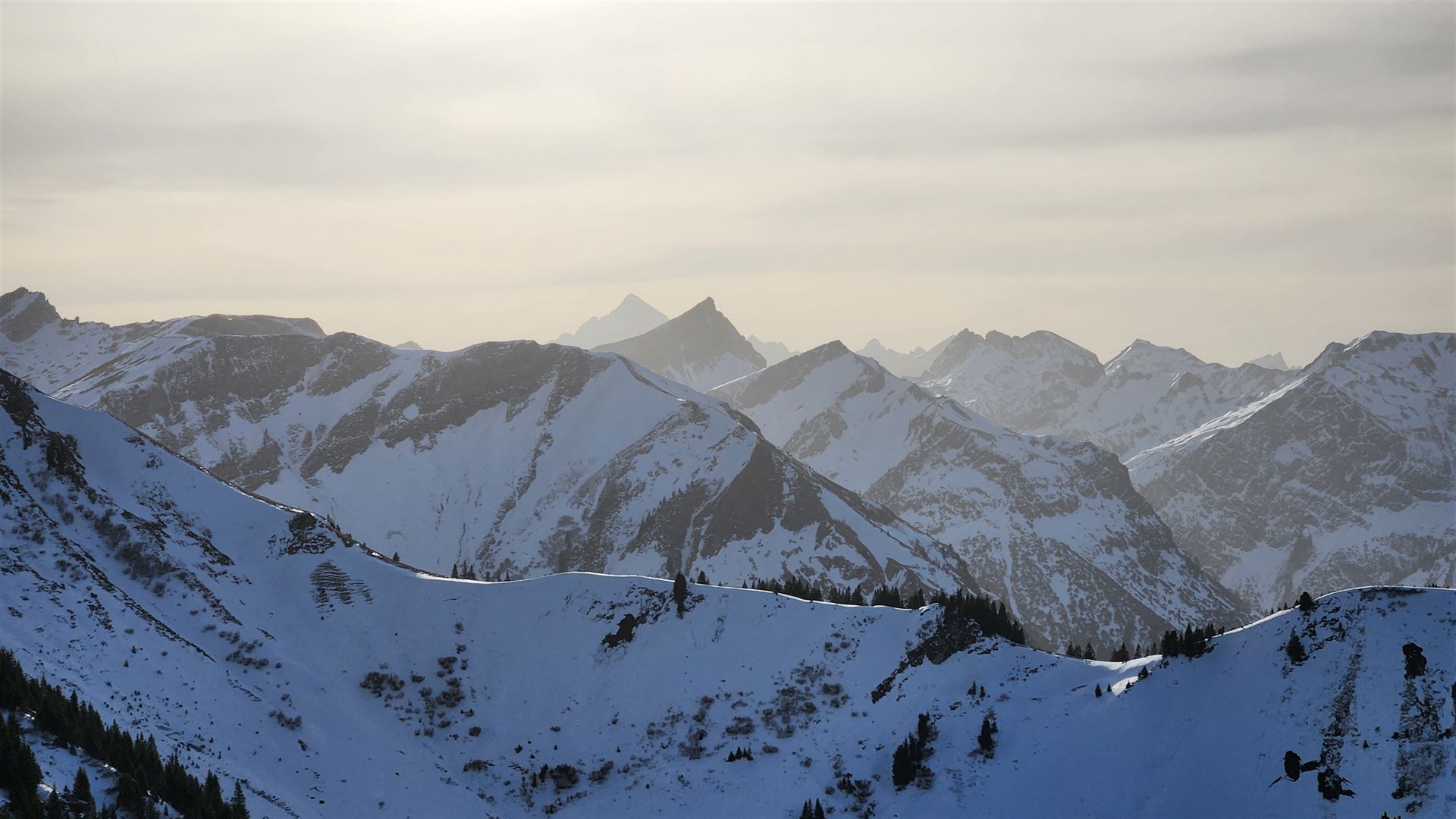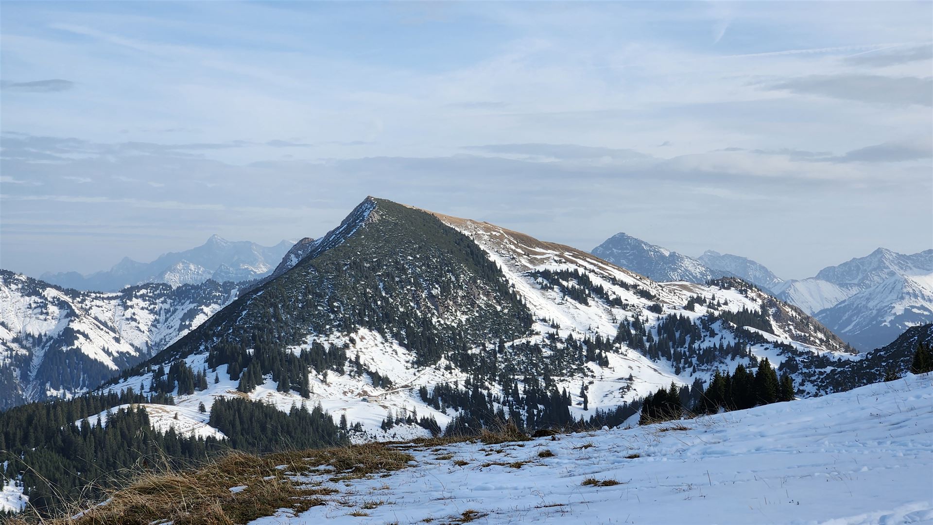 Vom Gipfel reichte der Blick nach Westen zur Zugspitze, zur Alpspitze und zur Kramerspitze bei Garmisch-Partenkirchen, davor der Daniel bei Lermoos, direkt gegenüber die Krinnenspitze (2000 m) und dahinter der Thaneller, den ich einmal im Winter bestiegen und einmal mit dem Mountainbike umrundet habe. Einstein, Aggenstein, Gimpel und Kellenspitze im Norden habe ich bereits erwähnt. Im Westen liegen das Wertacher Hörnle und der Grünten. Im Süden spitzt die Silhouette des Hochvogel herüber.
