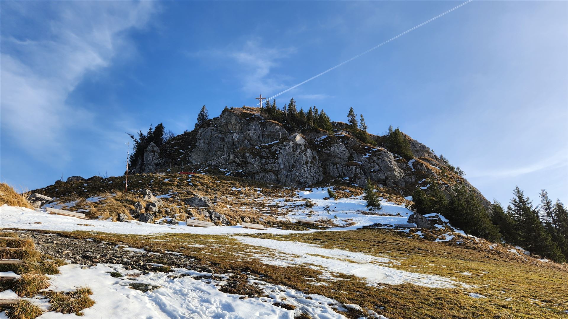 Über den längeren Forstweg erreicht man den Gipfel gemütlich in 3 Stunden. Einmal spitzte sogar der Vilsalpsee heraus. Besonders markant fiel die Pyramide des Gaishorns mit 2247 ins Blickfeld. Von der Bergstation der Neunerköpfle-Bahn führt schließlich ein zur Sicherheit eingezäunter Weg auf den aufgesetzten Gipfelfelsen.