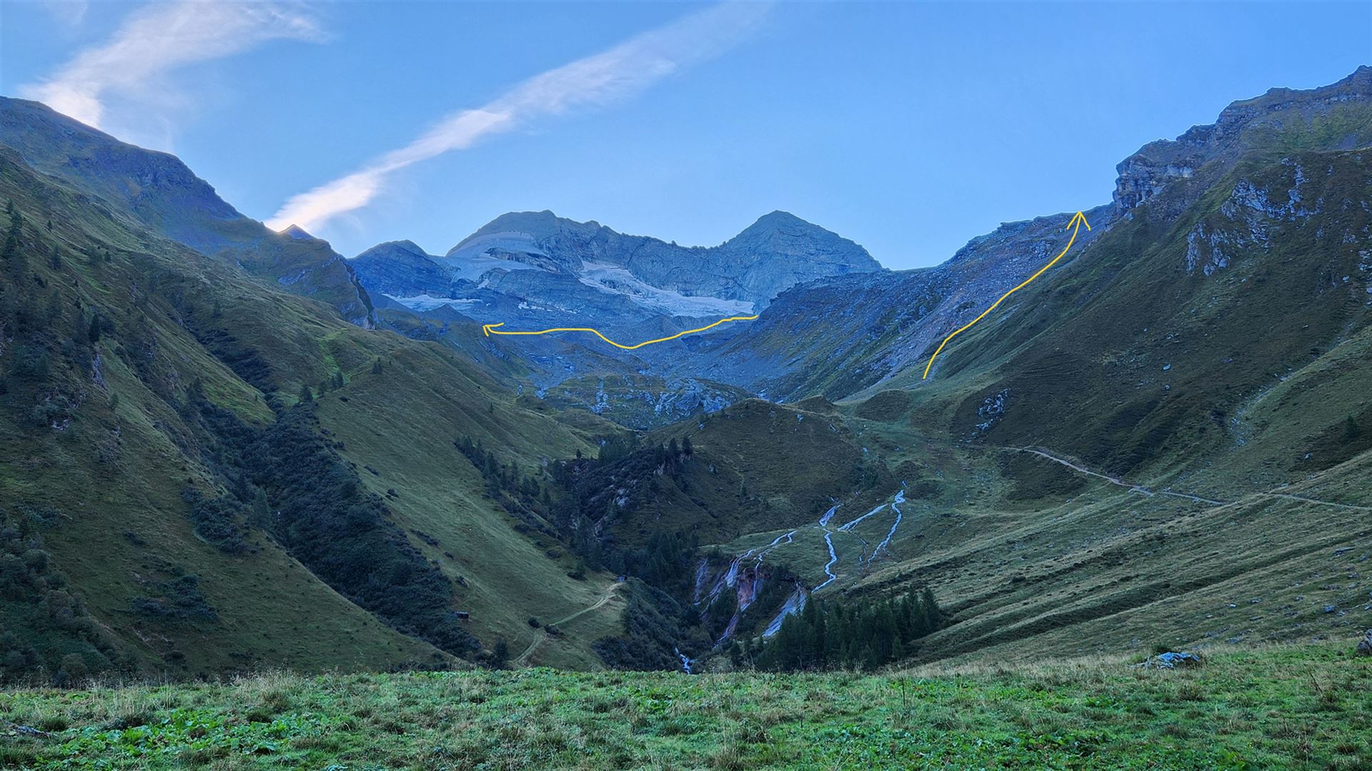 Heute habe ich deshalb eine Erkundungstour zum Olperer unternommen. Ich bin bereits sehr früh gestartet und erreichte den Parkplatz Wildlahner (GPS: 47.081948, 11.590003) im hinteren Schmirntal auf ca. 1500 m noch bei Dunkelheit. Der Parkplatz ist kostenlos, es wird jedoch um eine Spende gebeten. Eine feine Einrichtung ist das. Die Gemeinde Schmirn muss hier mal gelobt werden. Ohne Parkplatz hat man schließlich ein Problem.