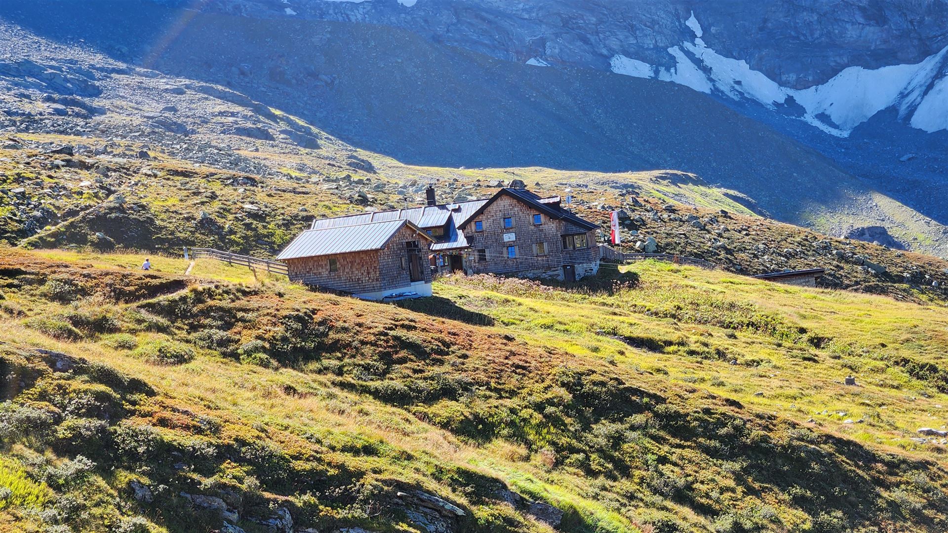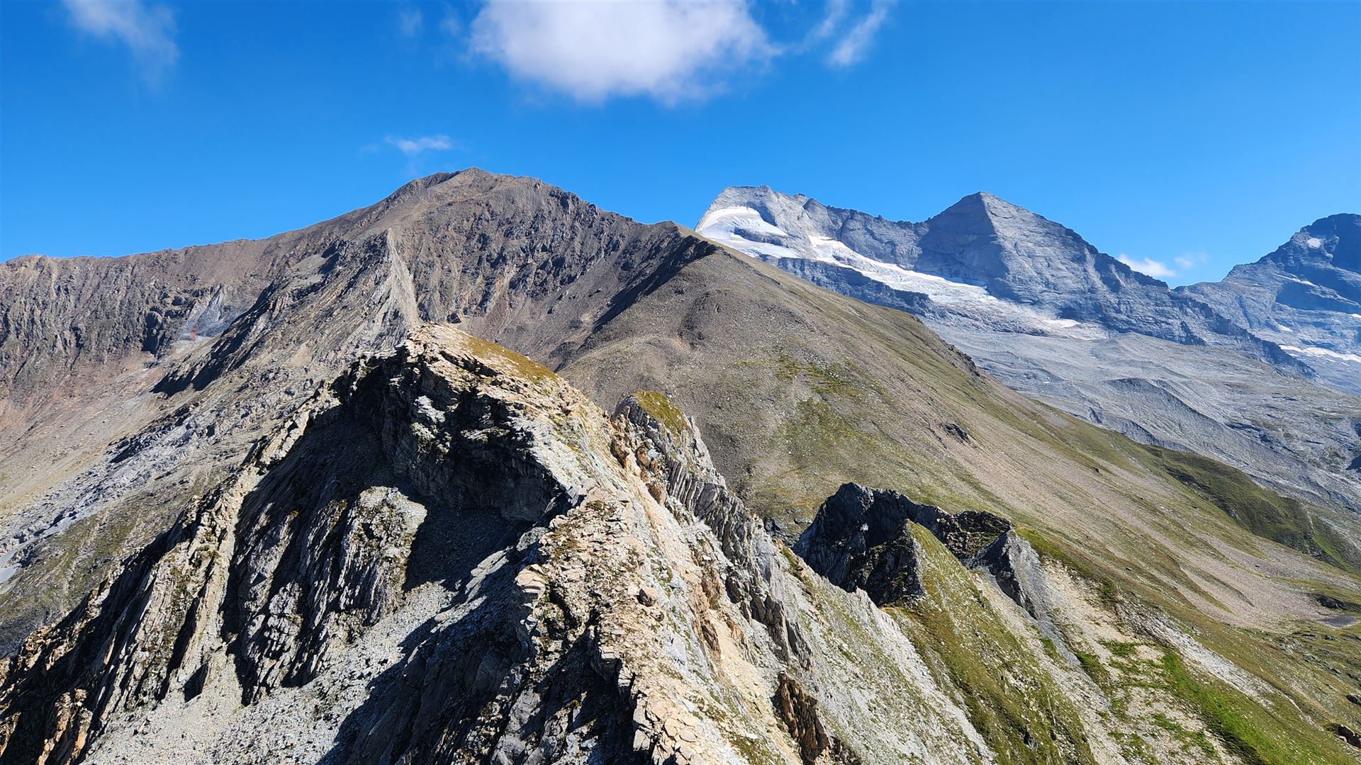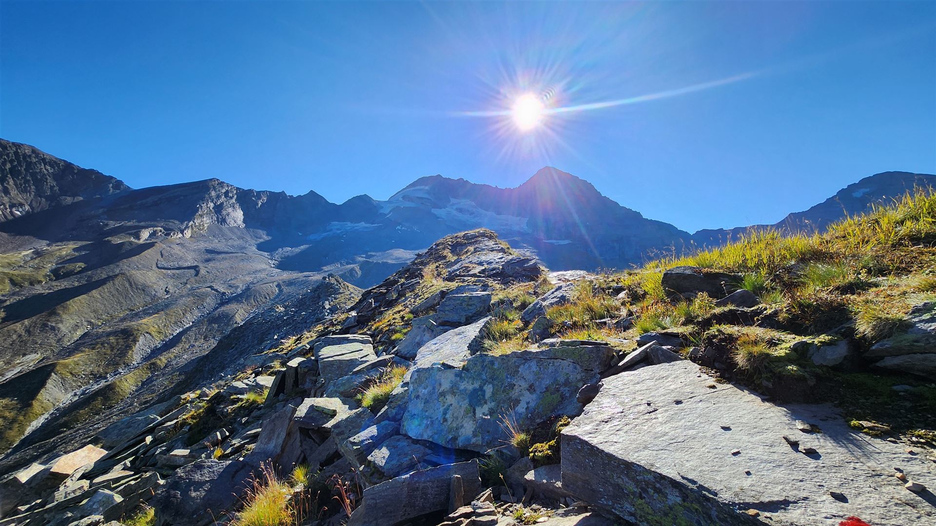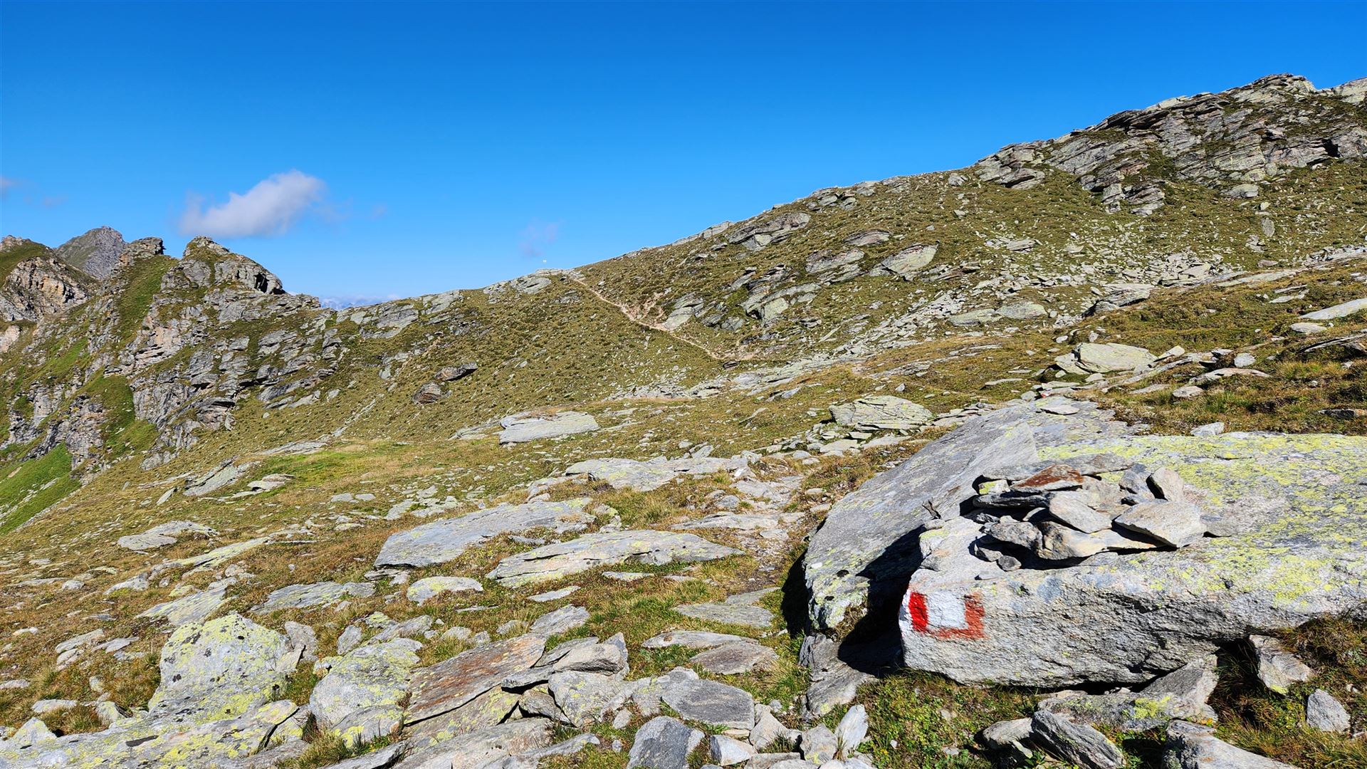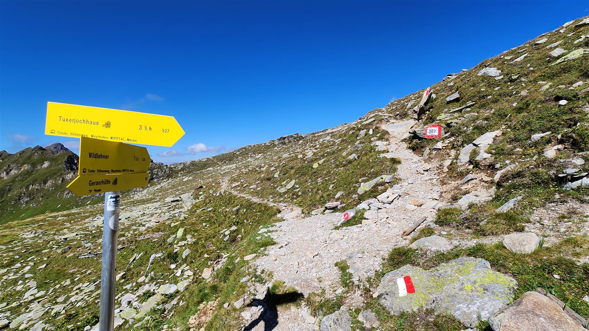 Der Wanderweg zur Geraer Hütte hinunter, zum Teil über Blockgelände, war angenehm einfach. Der Weg ist Teil des Tiroler Höhenwegs. Wunderschön. Im Westen waren unschwer der Wilde Freiger, das Zuckerhütl und der Habicht auszumachen.