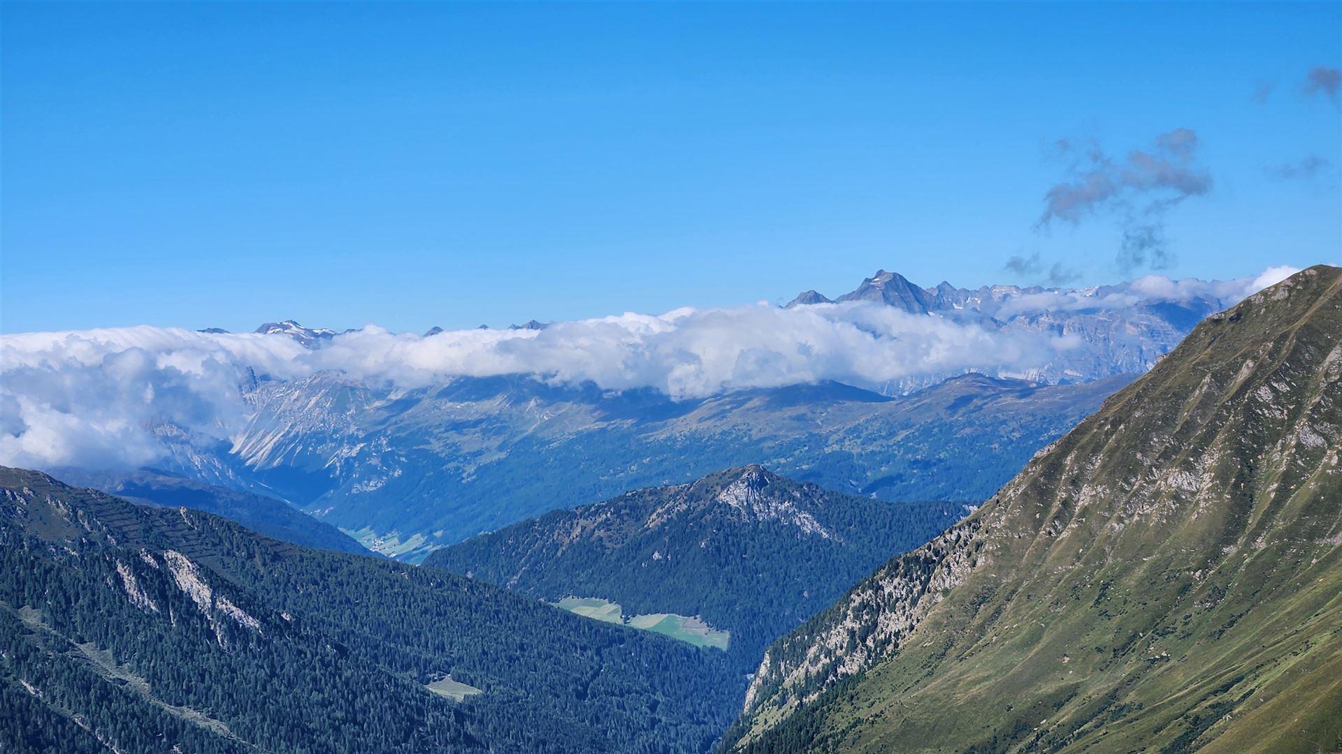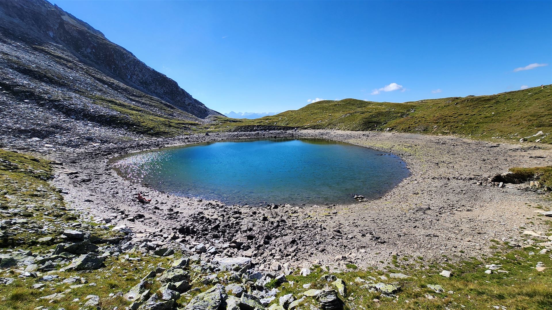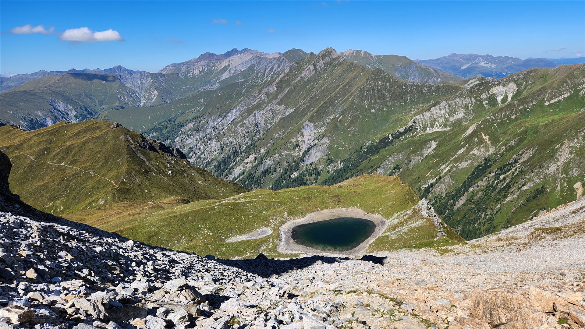 Nach dem kleinen Gipfelabstecher folgte ich dem Abstieg ostseitig der Schoberspitz hinunter zum Ramsgrubensee. Im Osten konnte ich den Hohen Riffler ausmachen. Beim See hatte sich sogar jemand zum Baden aufgerafft. Insgesamt begegnete ich an diesem Tag jedoch nur etwa 10 Wanderern. Es war somit ein sehr entspannender Tag. Auf der Geraer Alm saßen auch nur vier Leute auf der Terrasse.