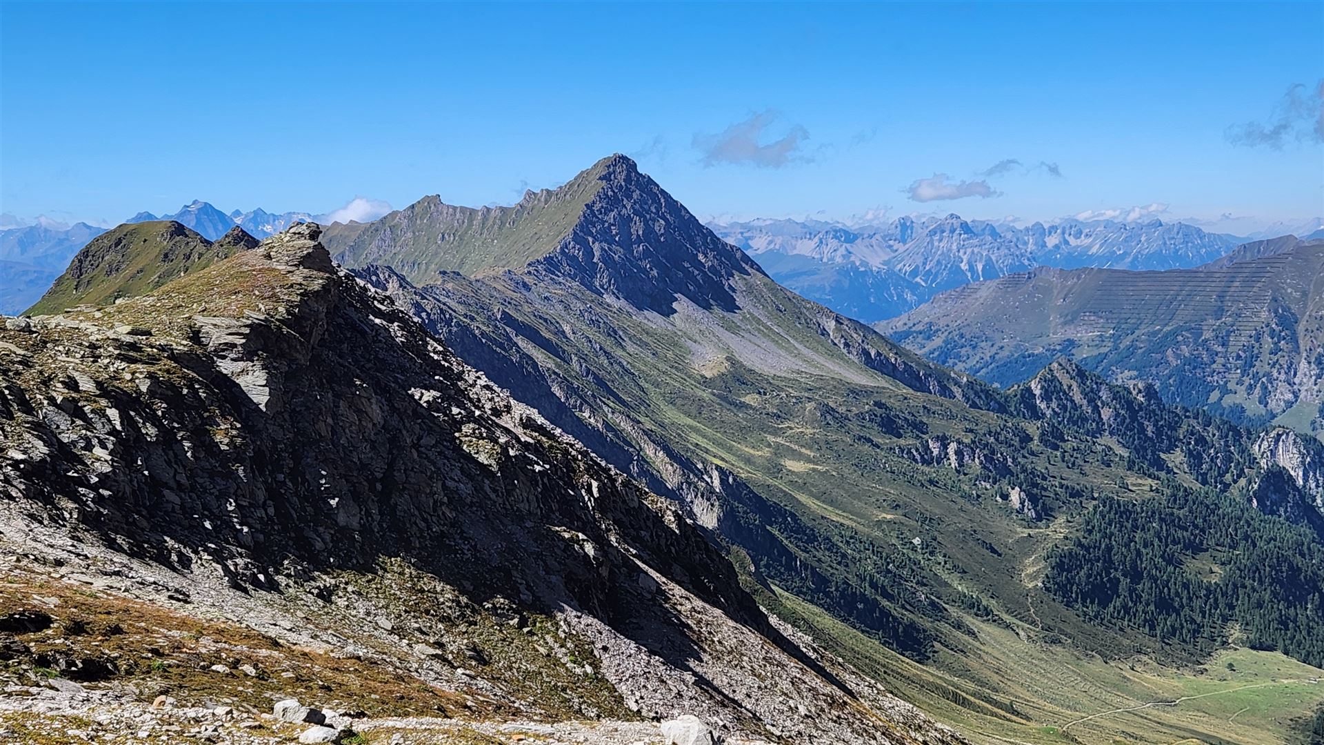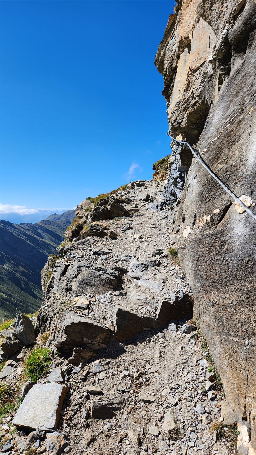 Es folgte eine etwas ausgesetzte, zum Teil drahtgesicherte Stelle. Hier ist Schwindelfreiheit erforderlich. Deshalb habe ich diese Tour auch unter Bergtouren und nicht unter Wanderungen eingeordnet. Gegenüber beeindruckte die Spitze der Hohen Warte. Rechts davon fällt die Serles bei Innsbruck auf. Die kürzliche Tour auf den König des Stubaitals war fantastisch.