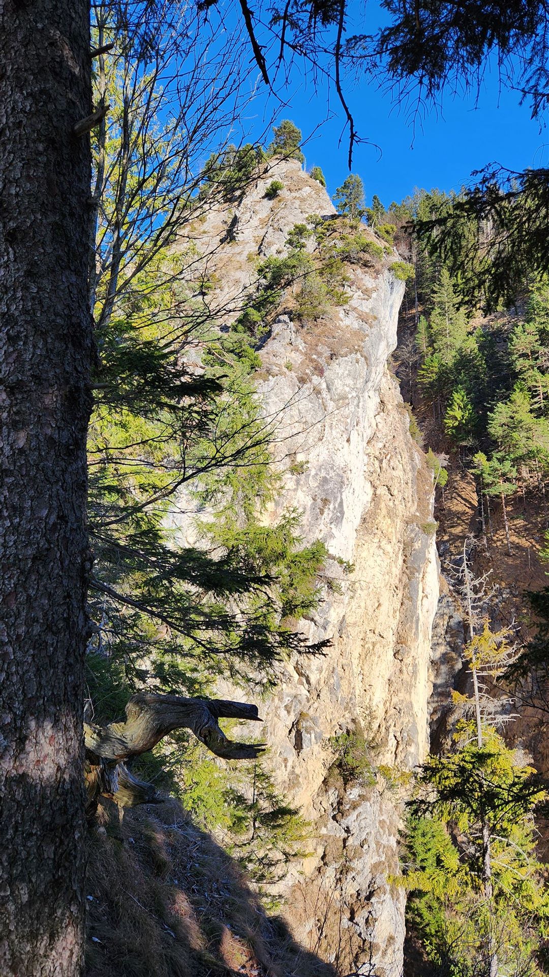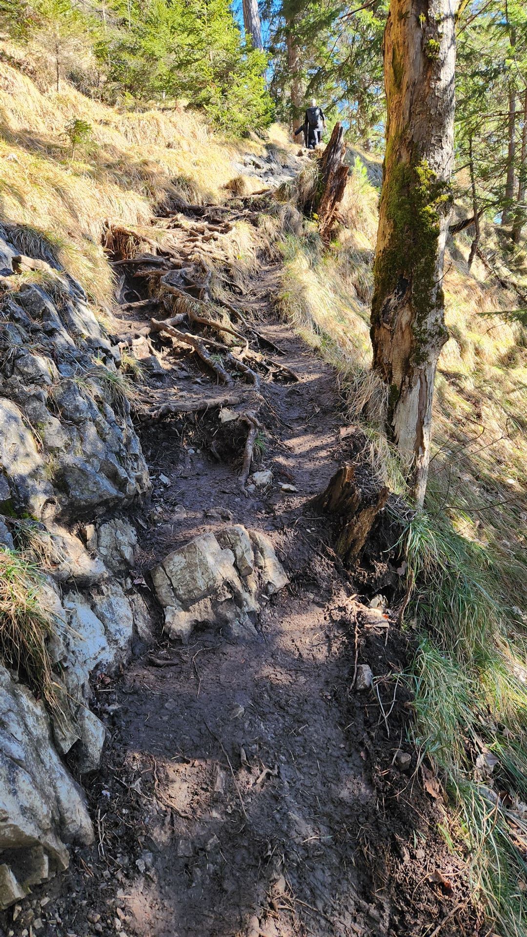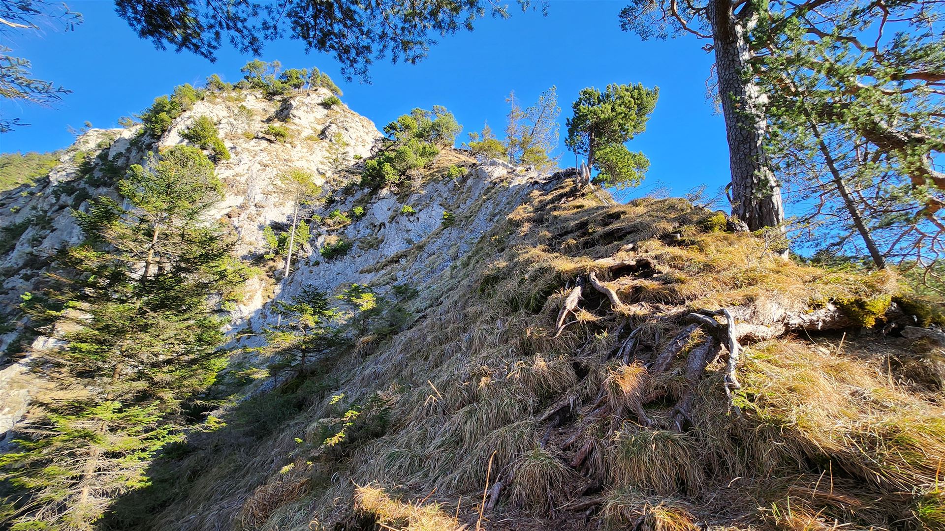 Da ich nicht gerne den gleichen Weg zurückgehe, habe ich auf dem Rückweg den Steig zum Heldenkreuz gewählt. Dieser ist nicht ausgeschildert – aus guten Gründen. In Komoot ist der Steig jedoch eingezeichnet. Bereits nach wenigen Minuten führt der Steig über einen Grat und dann folgte eine ausgesetzte Stelle, die keine Fehler erlaubt hätte. Links ging es senkrecht hinunter in den Klammgraben. Vor allem bergab sah die Stelle sehr problematisch aus – keine Sicherungen. Ein Stolperer oder Ausrutscher und das wärs dann gewesen. Aus diesem Grund bin ich umgekehrt und wieder zum Normalabstieg zurückgekehrt.