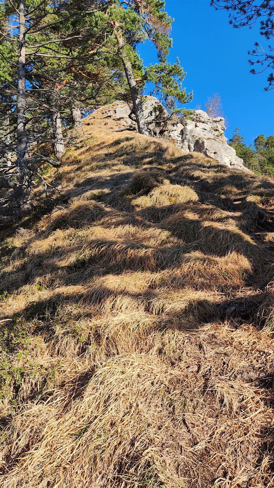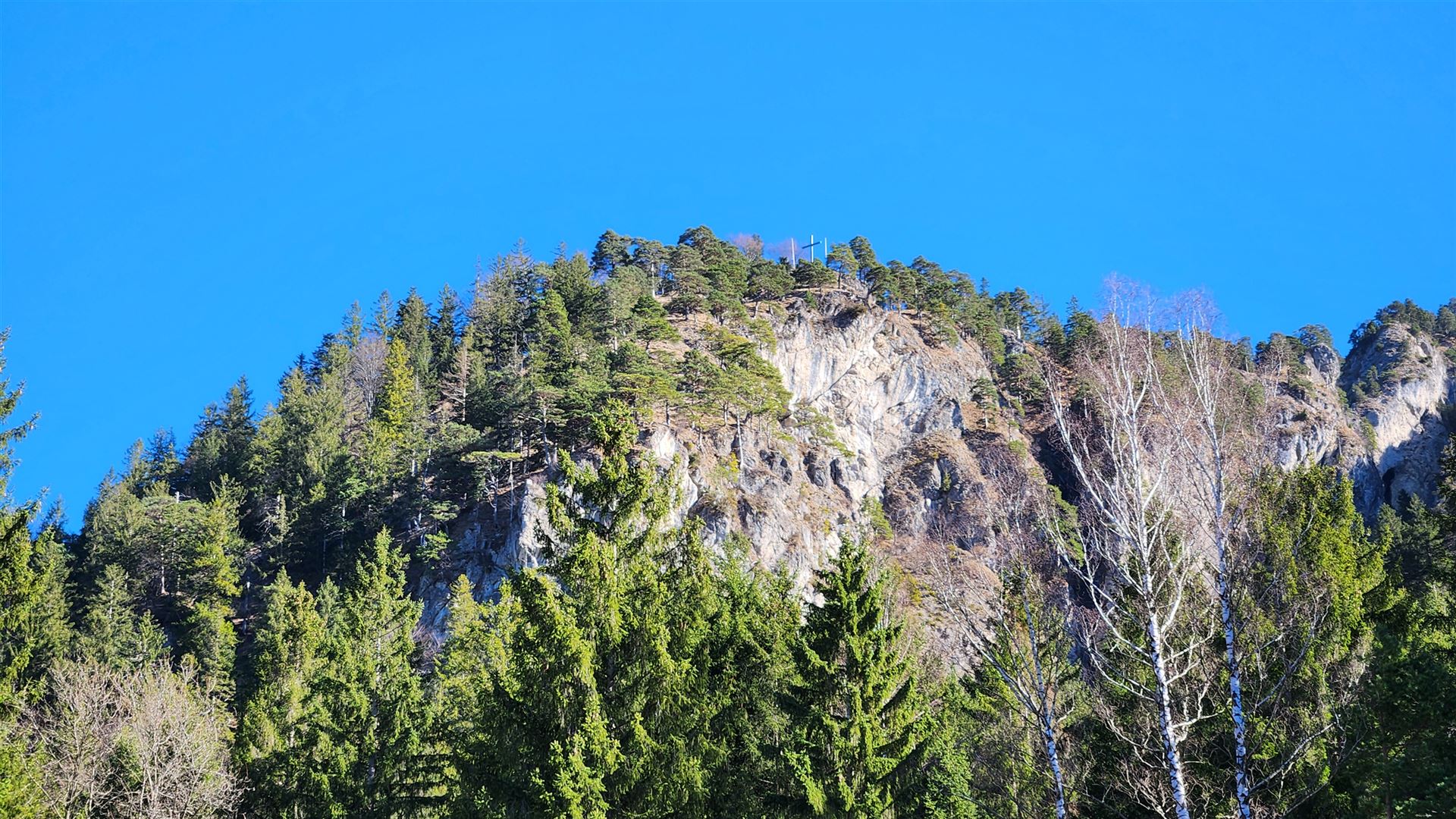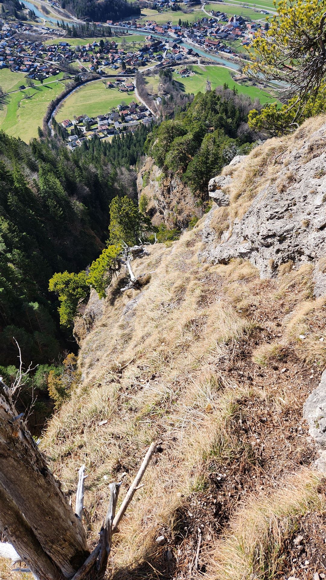 Da ich nicht gerne den gleichen Weg zurückgehe, habe ich auf dem Rückweg den Steig zum Heldenkreuz gewählt. Dieser ist nicht ausgeschildert – aus guten Gründen. In Komoot ist der Steig jedoch eingezeichnet. Bereits nach wenigen Minuten führt der Steig über einen Grat und dann folgte eine ausgesetzte Stelle, die keine Fehler erlaubt hätte. Links ging es senkrecht hinunter in den Klammgraben. Vor allem bergab sah die Stelle sehr problematisch aus – keine Sicherungen. Ein Stolperer oder Ausrutscher und das wärs dann gewesen. Aus diesem Grund bin ich umgekehrt und wieder zum Normalabstieg zurückgekehrt.