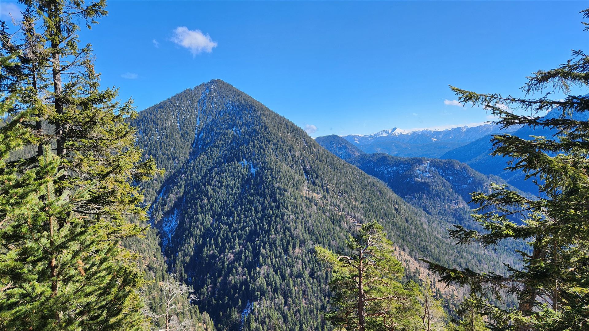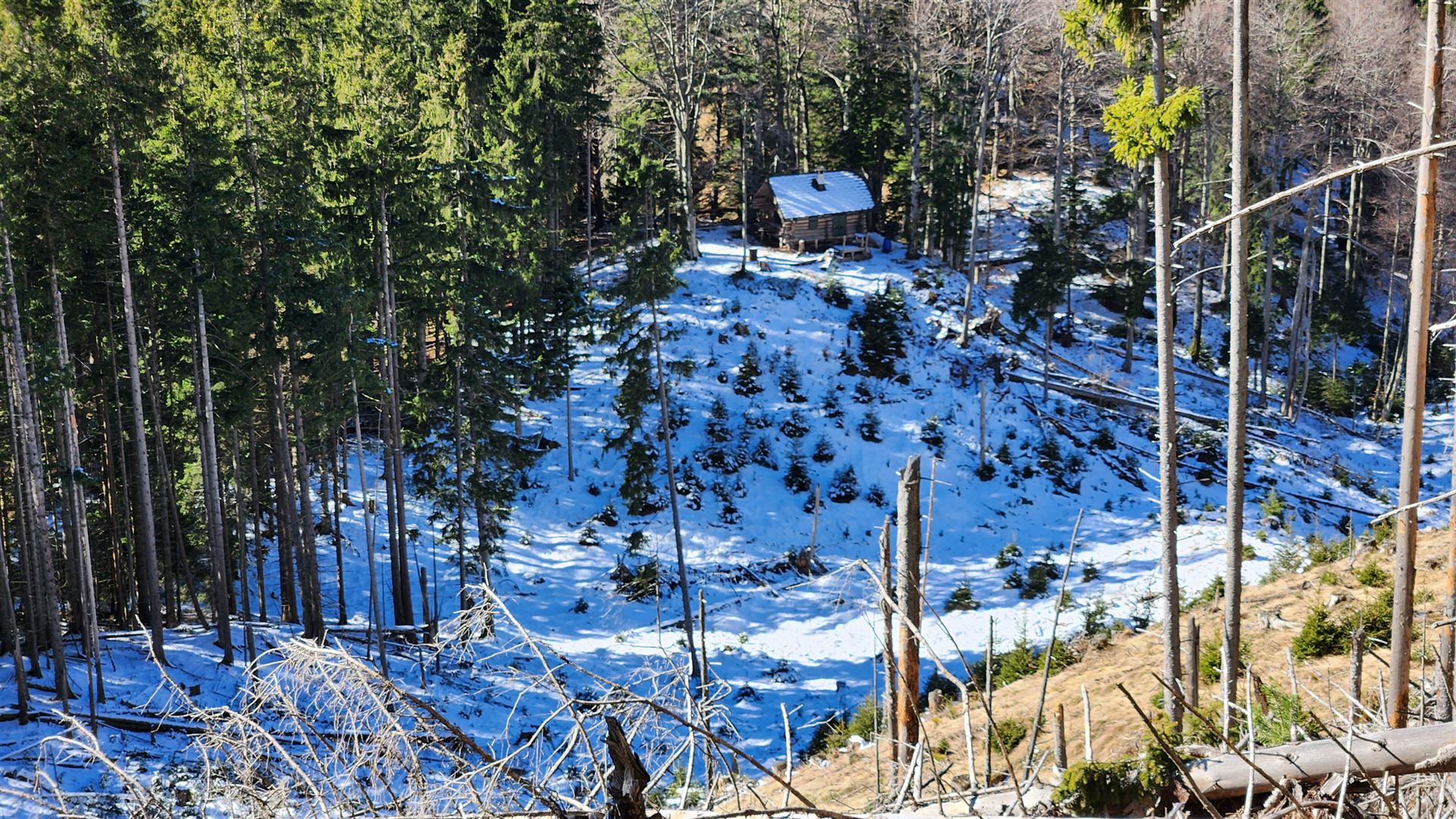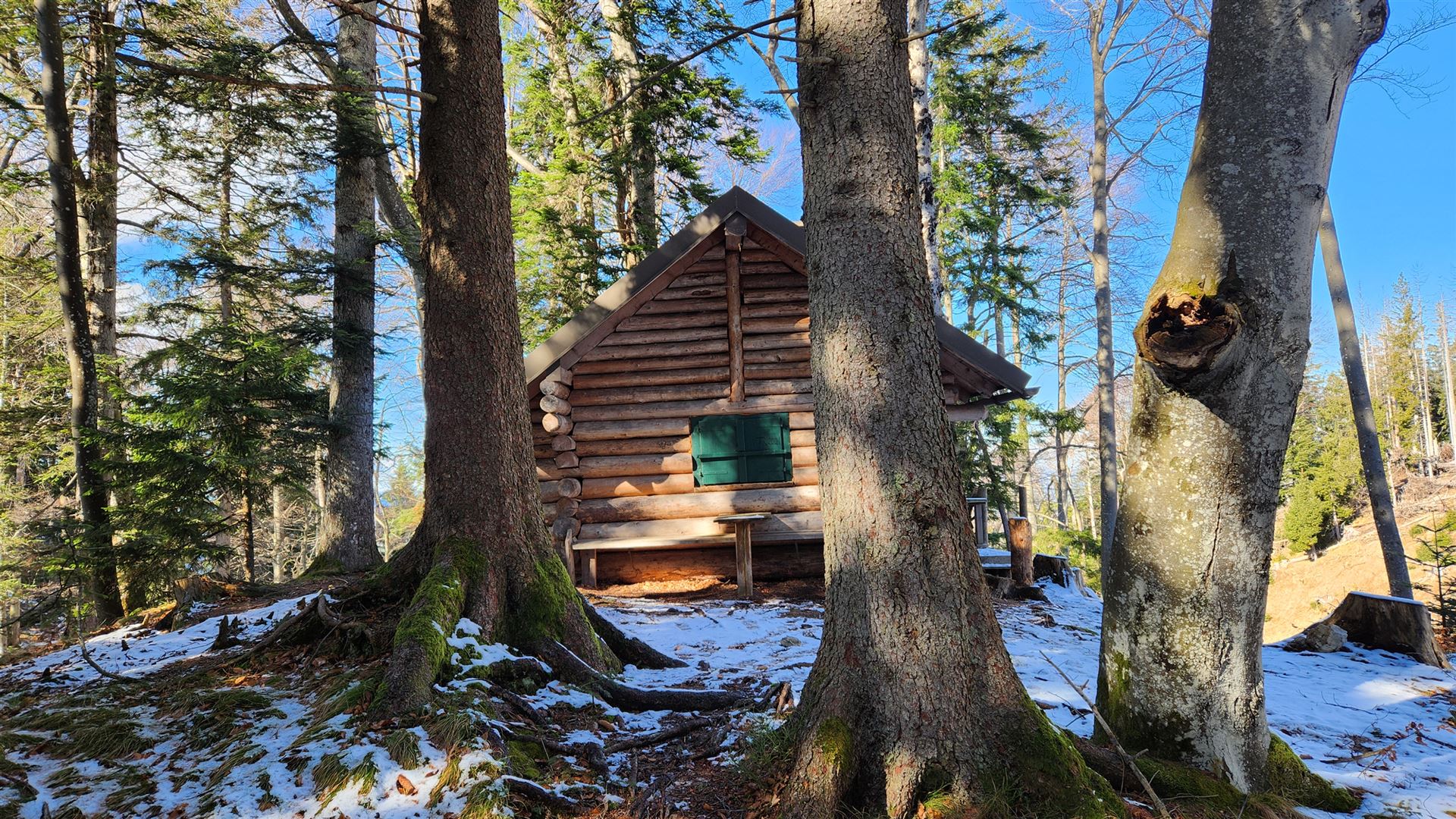Schließlich erreicht man bei einer Blockhütte, die etwas Kanada-Feeling vermittelt, eine Lichtung. Nein, der Gipfel ist noch nicht erreicht. Dieser befindet sich hinter der vor einem liegenden Kuppe. Im weiteren Aufstieg liegt der Hirschberg direkt gegenüber und im Hintergrund spitzt der Schafreuter hervor, ein beliebter Skitourenberg zwischen Hinterriß und Sylvensteinspeicher.