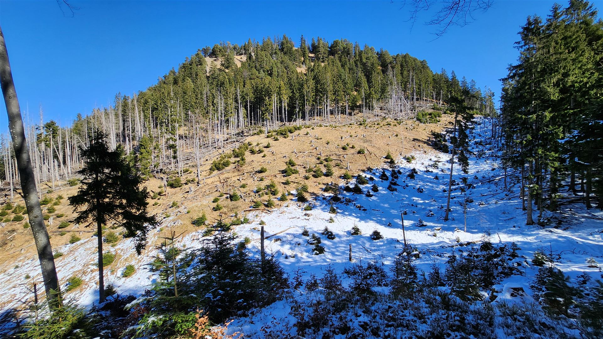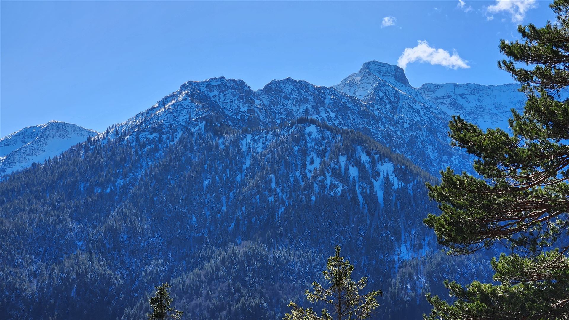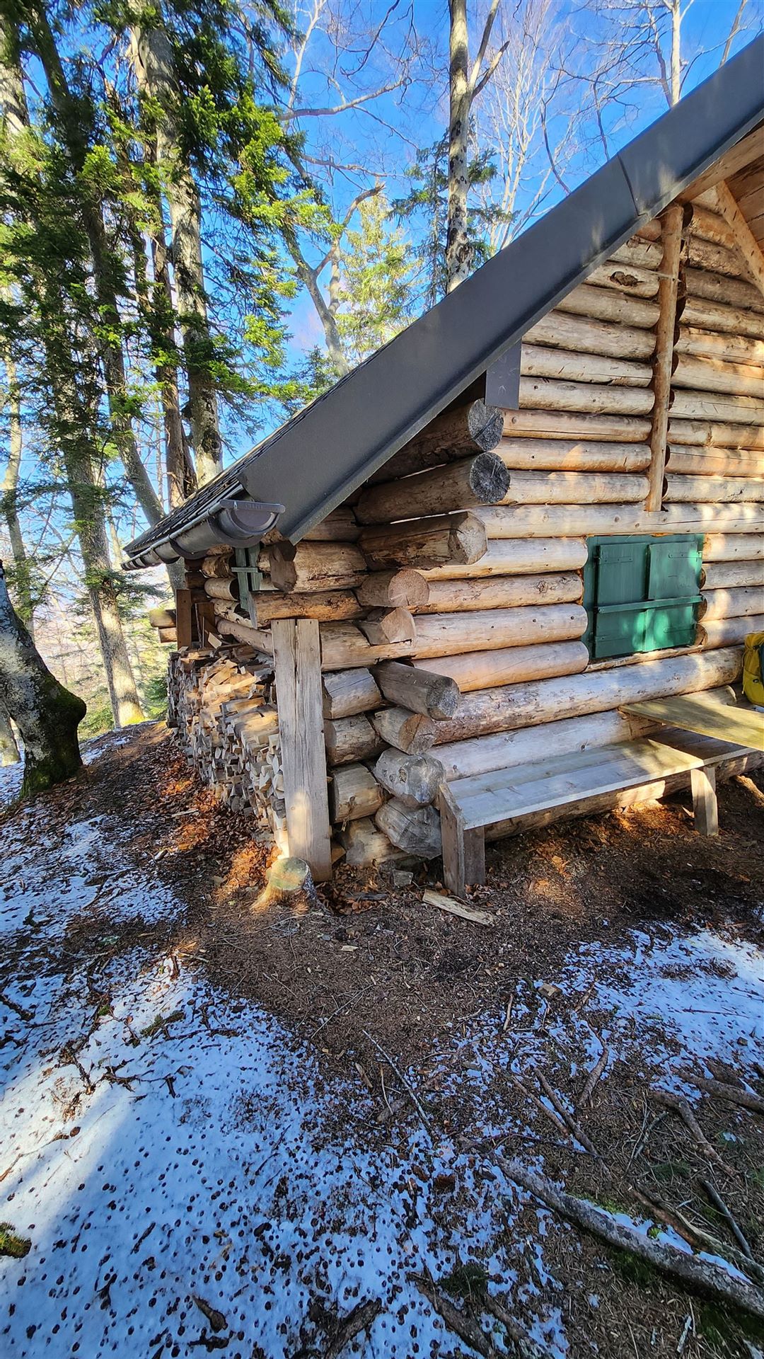 Schließlich erreicht man bei einer Blockhütte, die etwas Kanada-Feeling vermittelt, eine Lichtung. Nein, der Gipfel ist noch nicht erreicht. Dieser befindet sich hinter der vor einem liegenden Kuppe. Im weiteren Aufstieg liegt der Hirschberg direkt gegenüber und im Hintergrund spitzt der Schafreuter hervor, ein beliebter Skitourenberg zwischen Hinterriß und Sylvensteinspeicher.
