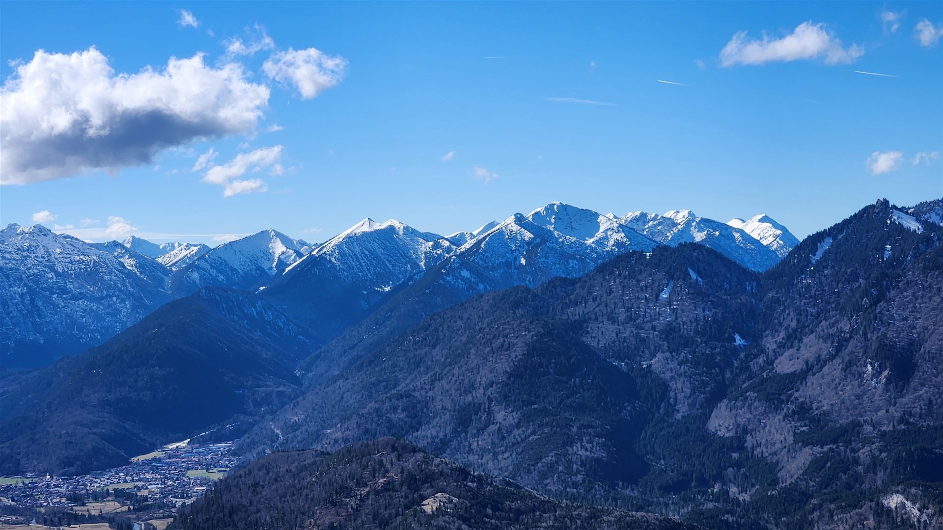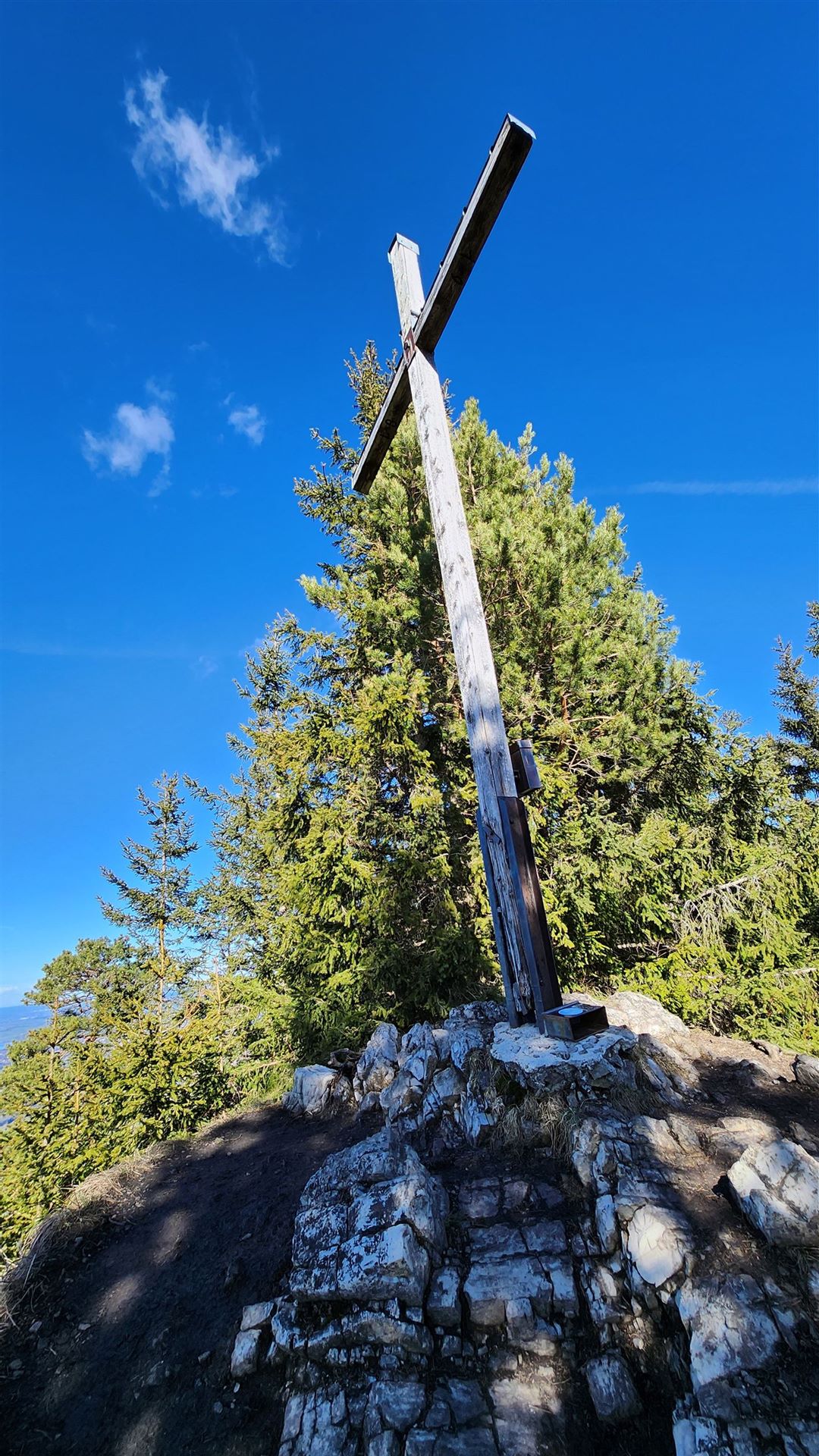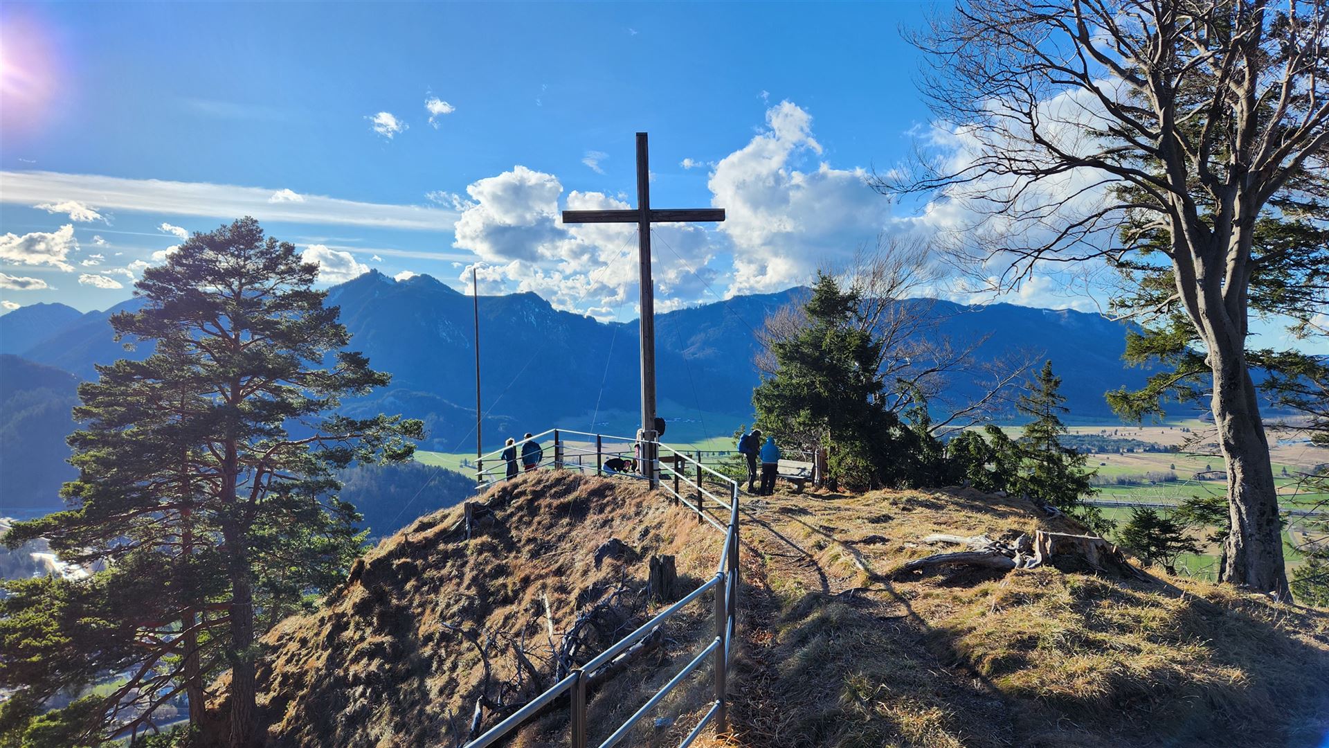 Und schon ist das Gipfelkreuz erreicht. Der Blick reicht von der Zugspitze über die Ammergauer Alpen und das Murnauer Moos bis zum Staffelsee. Vorderer Felderkopf und Notkarspitze sind gut auszumachen. Zu Füßen liegt Eschenlohe.
