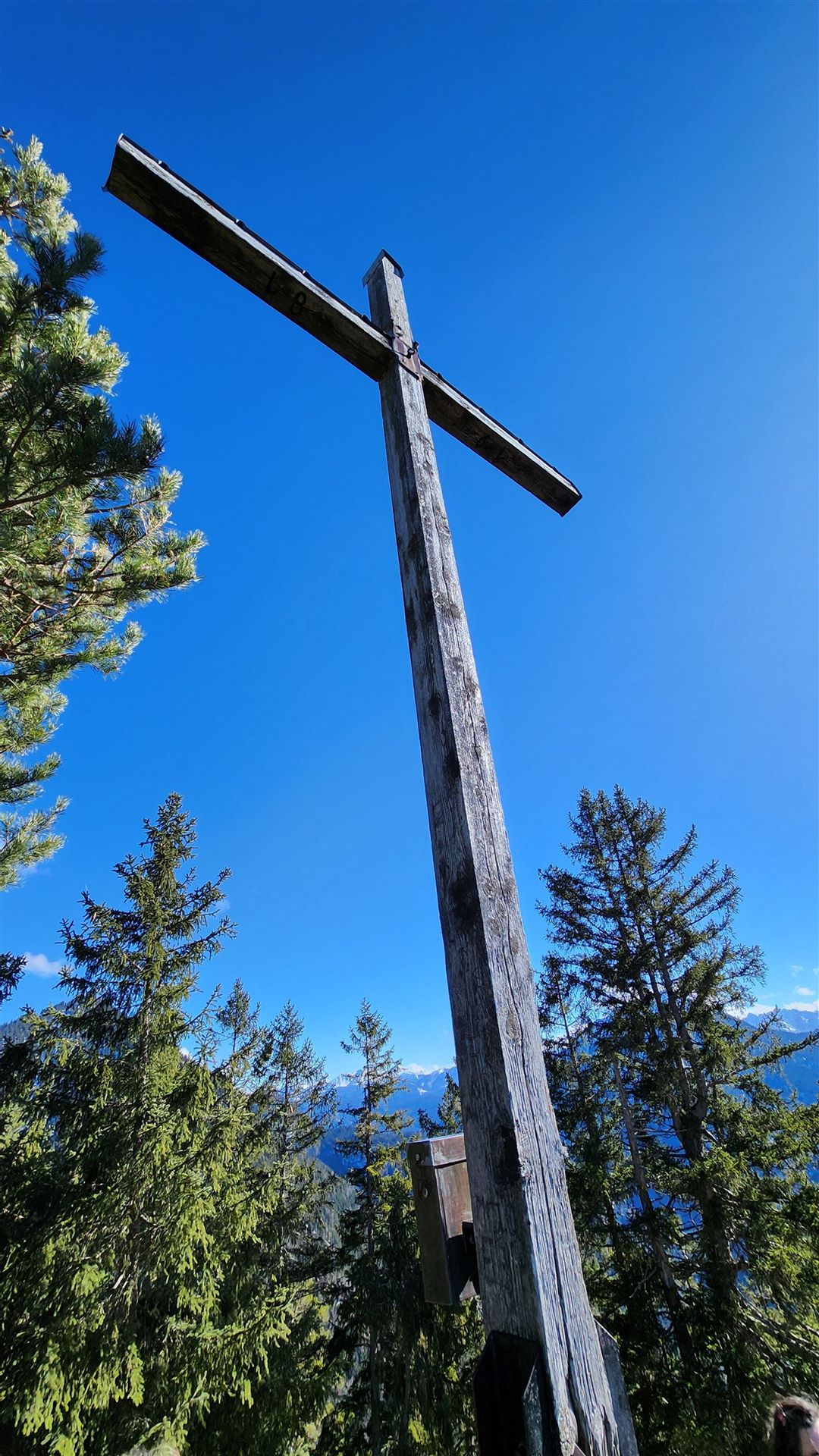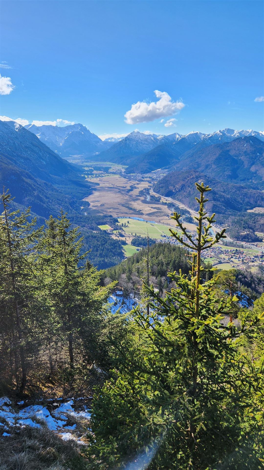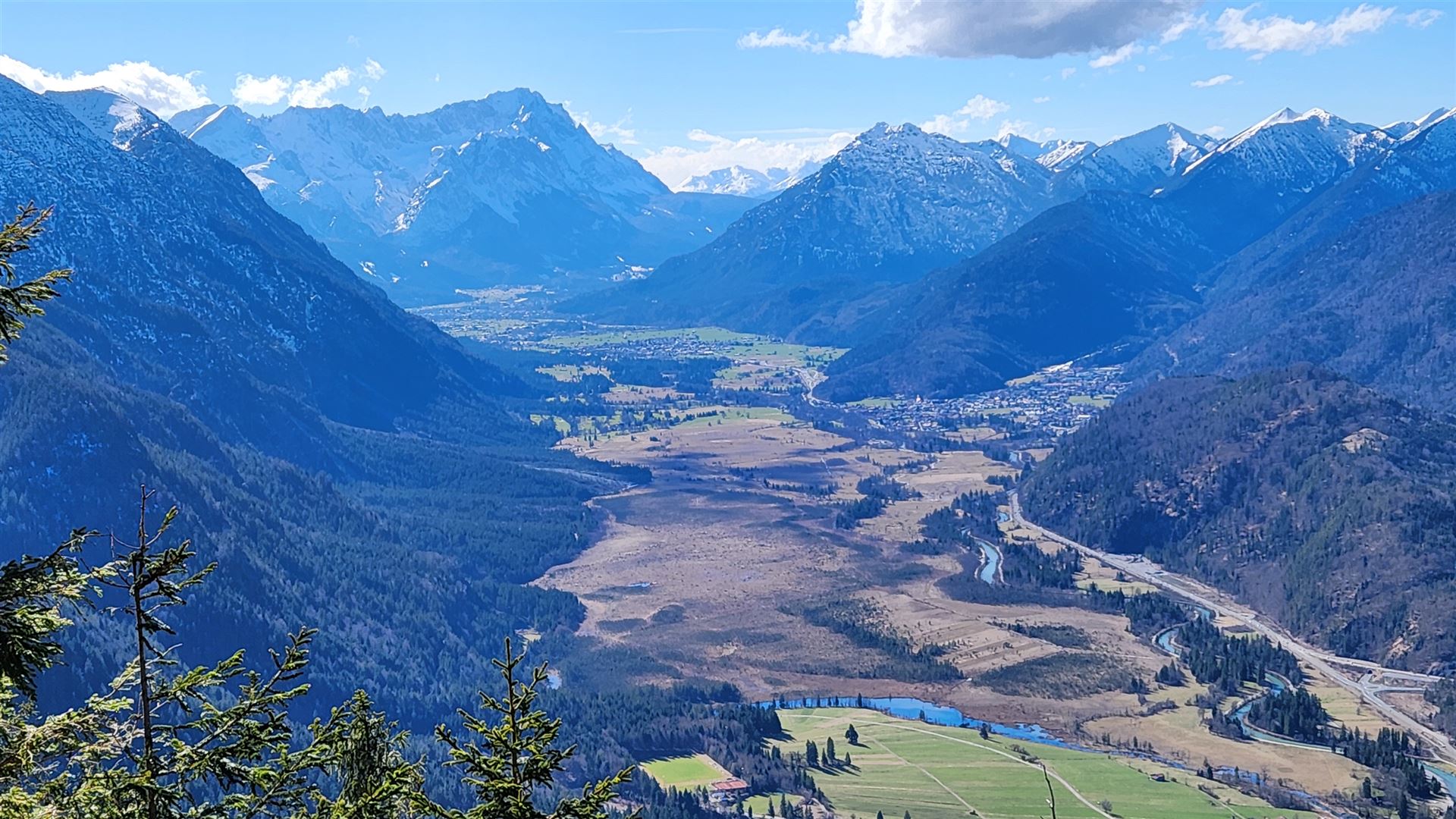 Und schon ist das Gipfelkreuz erreicht. Der Blick reicht von der Zugspitze über die Ammergauer Alpen und das Murnauer Moos bis zum Staffelsee. Vorderer Felderkopf und Notkarspitze sind gut auszumachen. Zu Füßen liegt Eschenlohe.