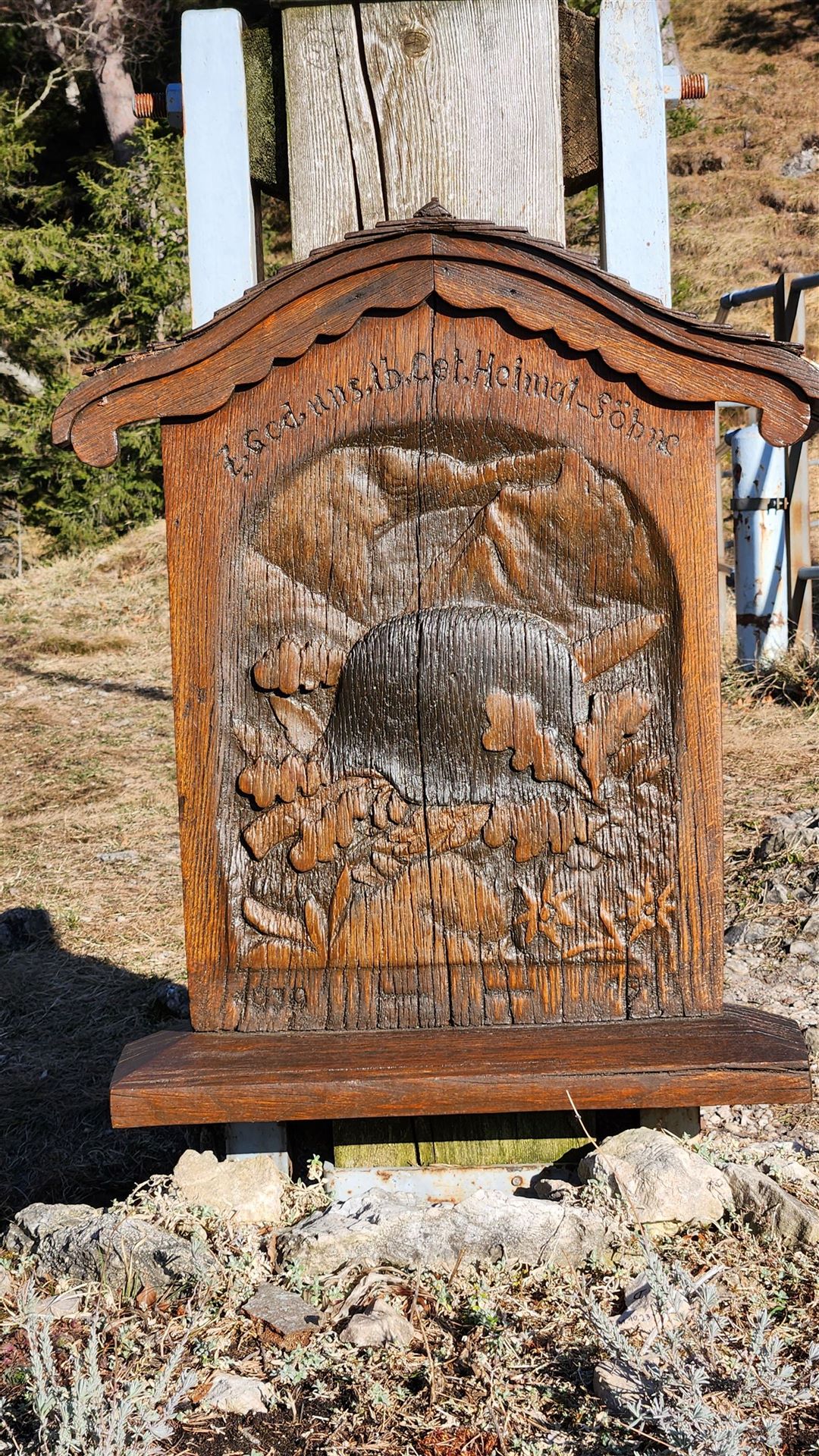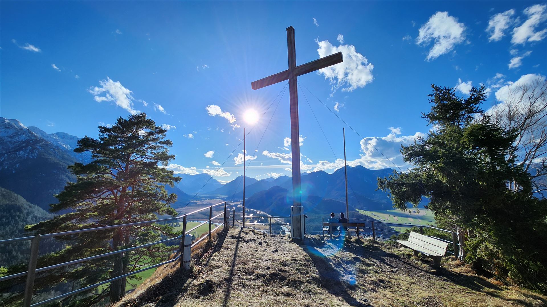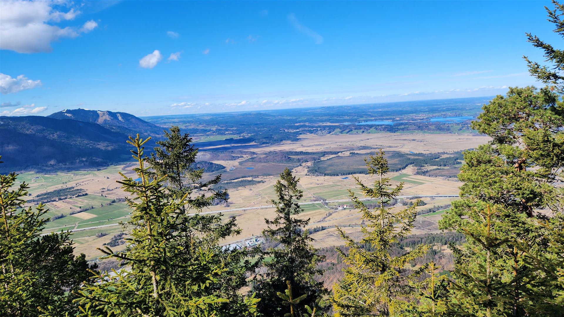 Aber ich wollte ja immer noch zum Heldenkreuz. Deshalb bin ich vom Wanderparkplatz noch die halbe Stunde aufgestiegen. Am Heldenkreuz konnte ich dann noch einmal den Panoramablick übers Loisachtal und auf Eschenlohe genießen.