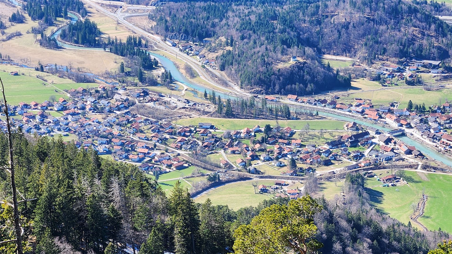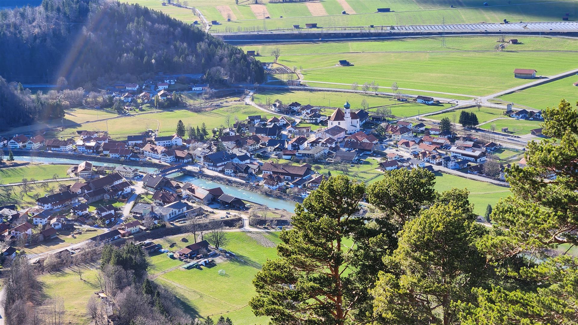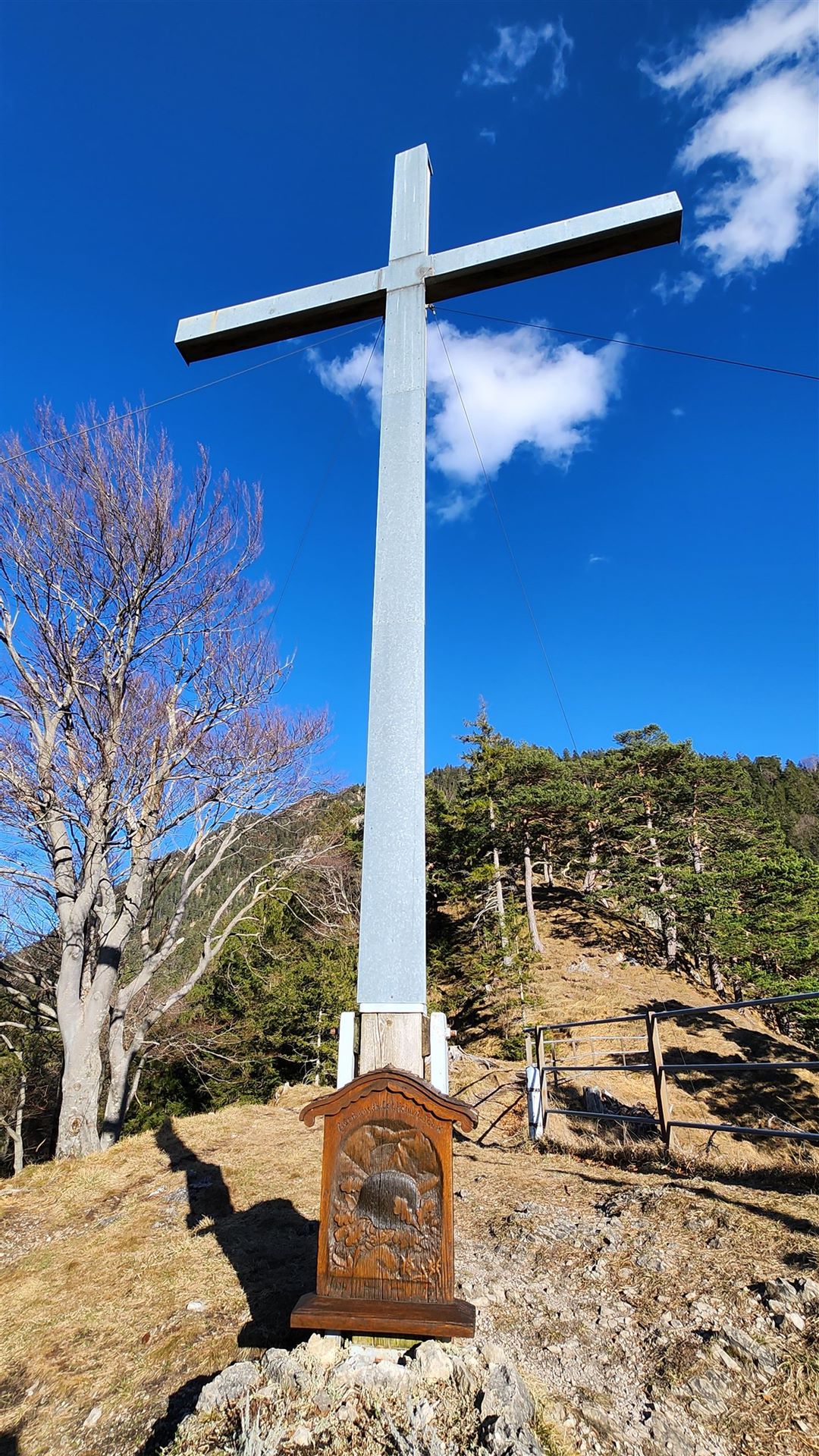 Aber ich wollte ja immer noch zum Heldenkreuz. Deshalb bin ich vom Wanderparkplatz noch die halbe Stunde aufgestiegen. Am Heldenkreuz konnte ich dann noch einmal den Panoramablick übers Loisachtal und auf Eschenlohe genießen.