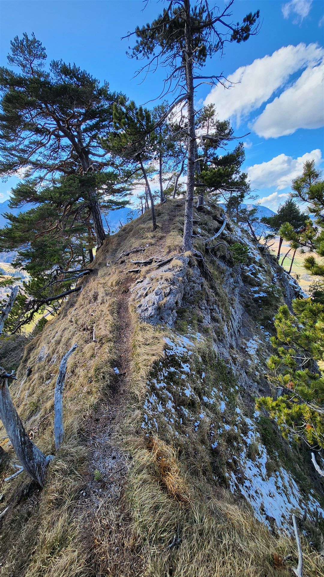 Aus Interesse bin ich hinterm Heldenkreuz weiter aufgestiegen, um mir die Schlüsselstelle, bei der ich vorhin von oben kommend umgedreht bin, von unten anzuschauen. Auch von dieser Seite hatte es der Grat in sich: Absolut nicht familientauglich! Bergauf gehts ja meistens, aber bergab muss man dann aufpassen. Den Aufstieg auf den rechts senkrecht abfallenden Felsen, hinter dem sich die vorherige Schlüsselstelle befand, habe ich mir deshalb geschenkt. Lt. Komoot fehlten nur ca. 60 Meter, um die Lücke zu schließen (siehe Komoot-Link). Ein bisschen erinnerte mich der Grat auch an Angels Landing im Zion National Park in Utah, wobei es dort wenigstens Sicherungen gab. Ich glaube aber nicht, dass ich den Grat irgendwann doch noch von unten nach oben durchgehend versuchen werde. Dafür gibt es in den Alpen einfach zu viele schöne Berge.